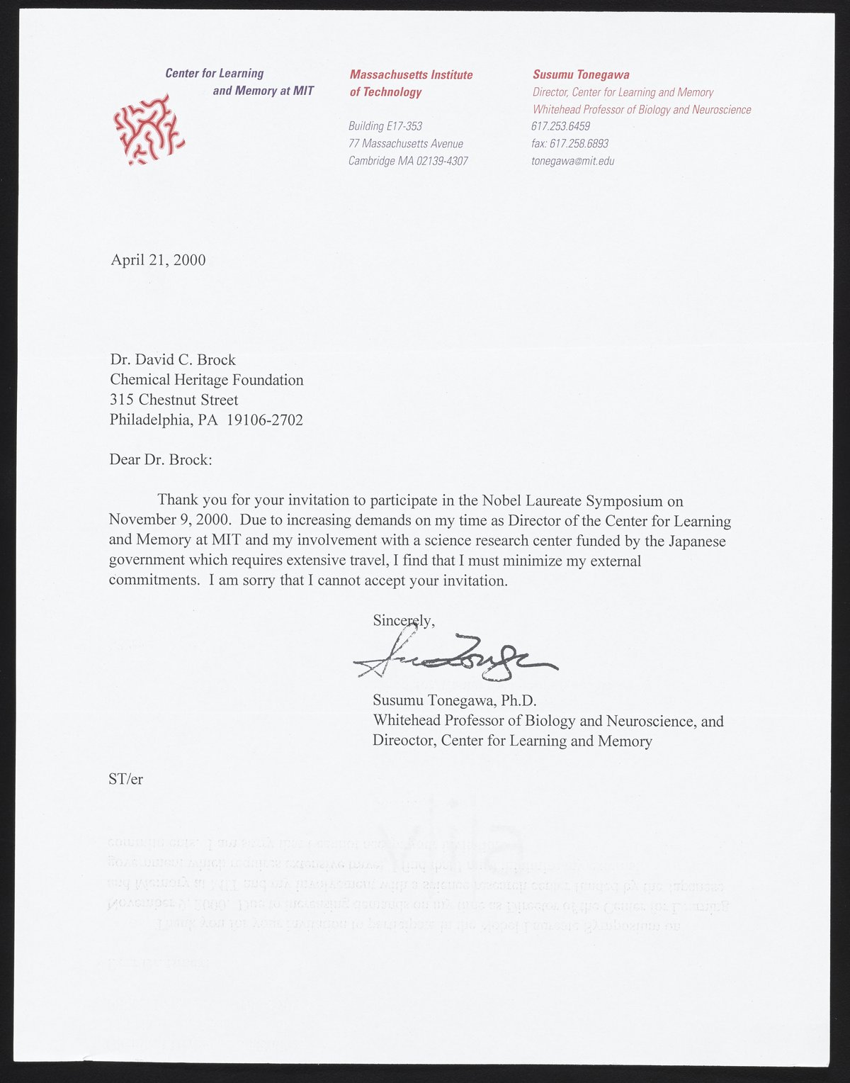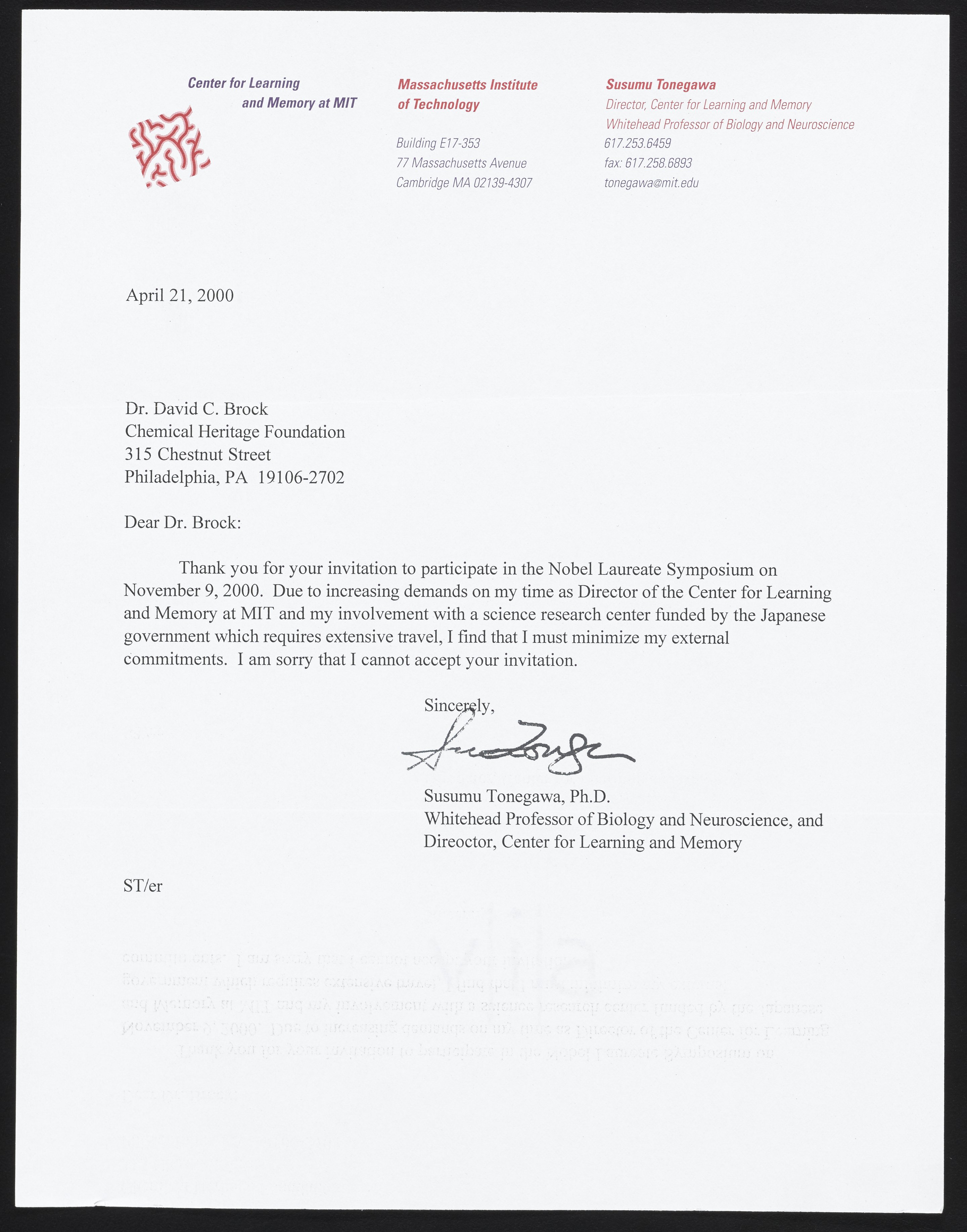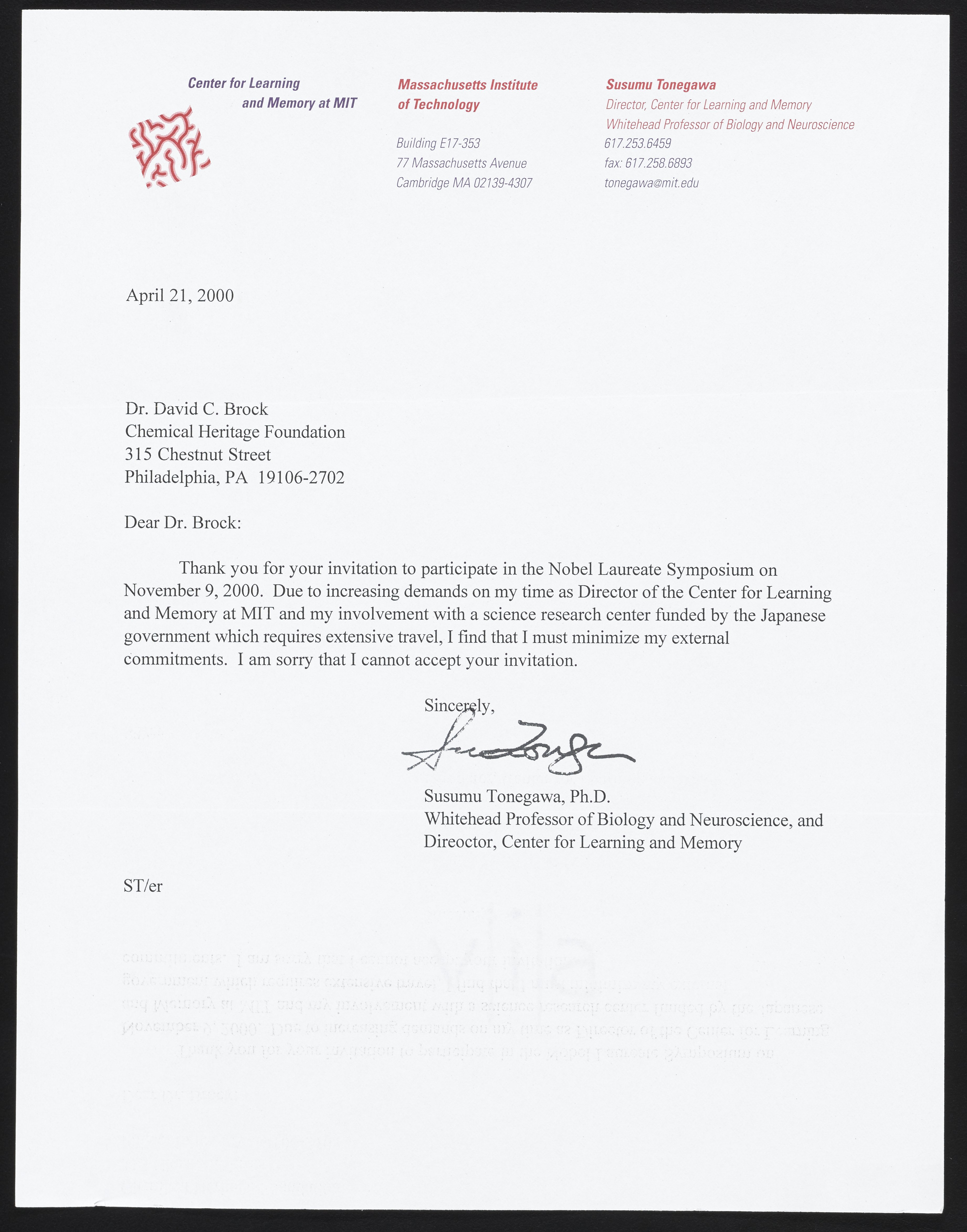 Letter from Susumu Tonegawa to David Brock
