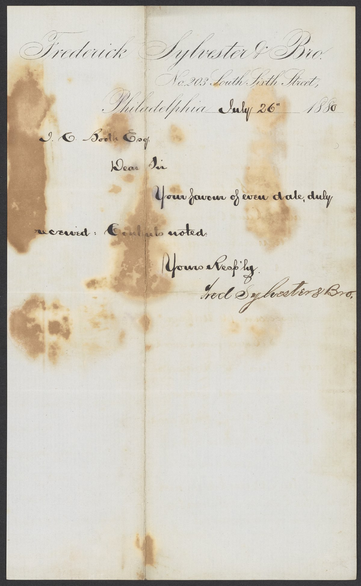 Letter from Frederick Sylvester & Brother to James Curtis Booth, July 26, 1880