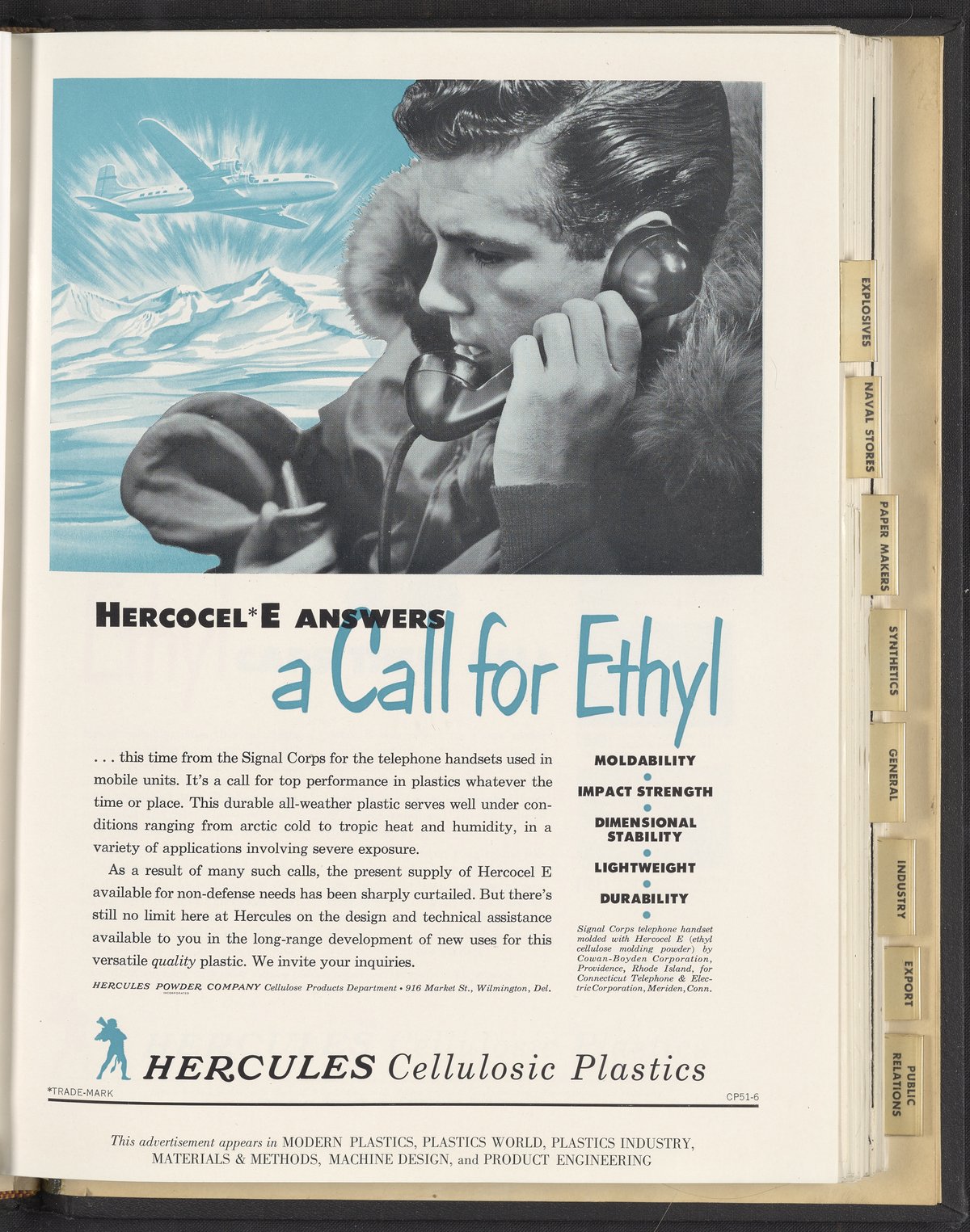 Hercules Incorporated. “Hercocel E Answers a Call for Ethyl.” 1951 Hercules Advertisements, 1951. Records of Hercules Incorporated, Volume 1951. Science History Institute. Philadelphia. https://digital.sciencehistory.org/works/66cudhz.
