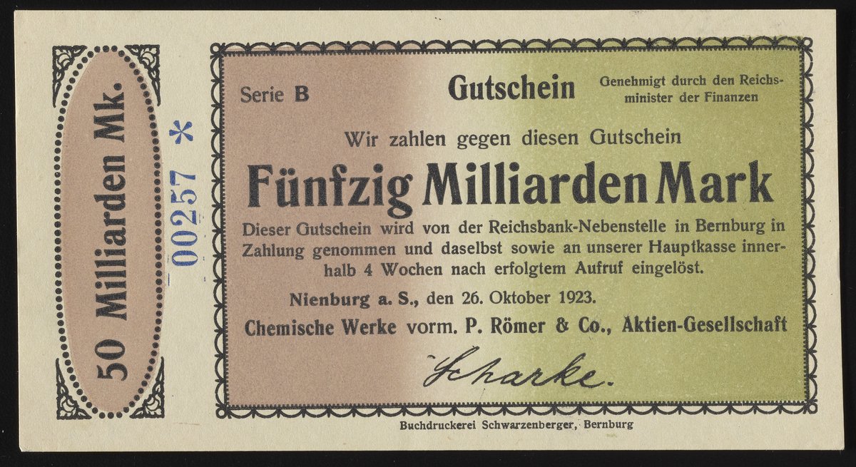 “Chemische Werke P. Römer & Co. Fünfzig Milliarden Mark Gutschein.” Bernburg, Germany: P. Römer & Company, October 26, 1923. Robert J. Bauman collection. Science History Institute. Philadelphia. https://digital.sciencehistory.org/works/6969z170d.