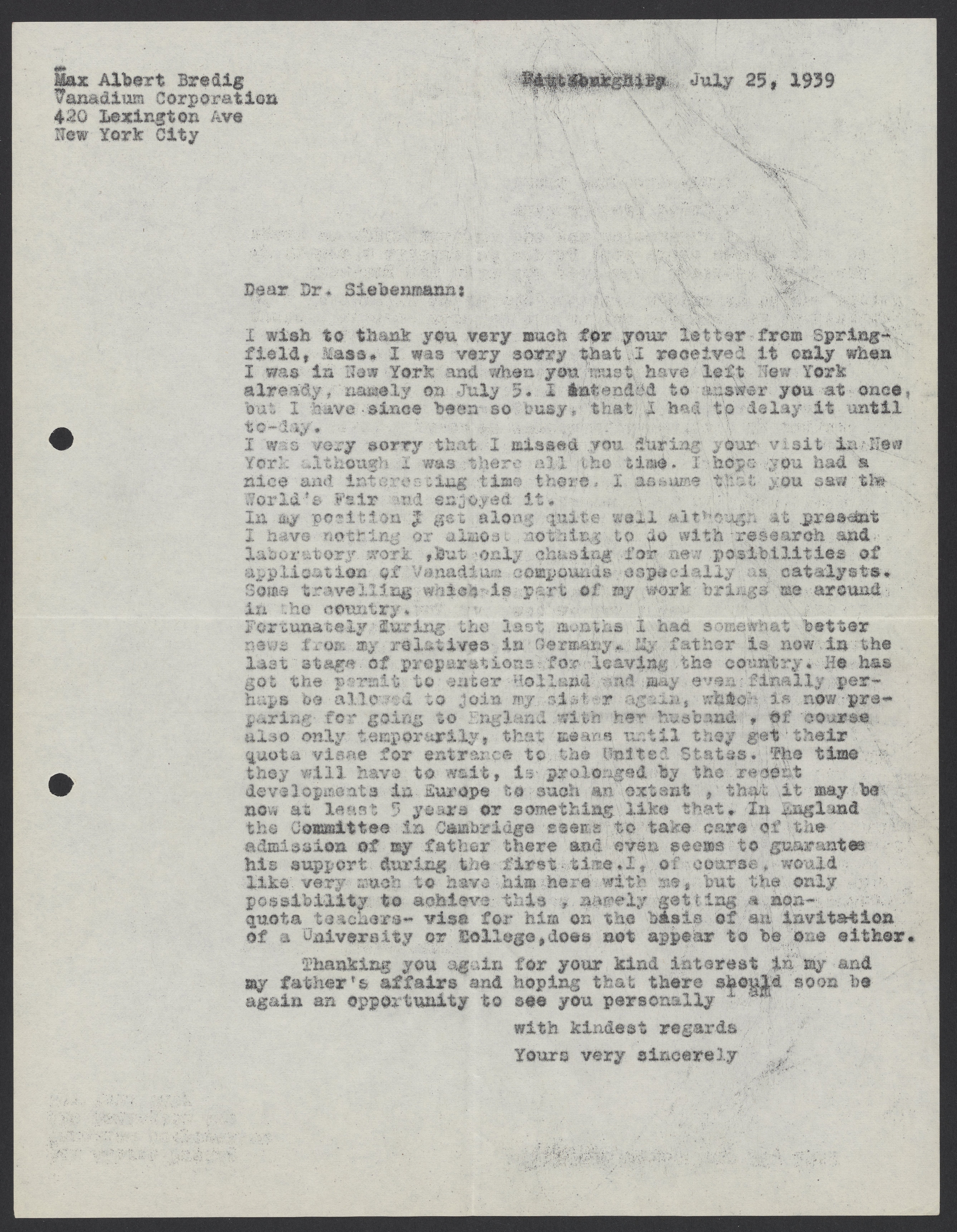 Max Bredig (1902-1977) writes to a family friend, Charles Siebenmann. Max expresses his regrets that he missed seeing Siebenmann in person while he visited New York. Max then shares news of his professional life and updates Siebenmann on his family's status in Germany. Max's father and sister, Georg Bredig (1868-1944) and Marianna Homburger (1903-1986) have both been permitted to leave Germany and are planning to await visa's to the United States in Holland and England respectively.