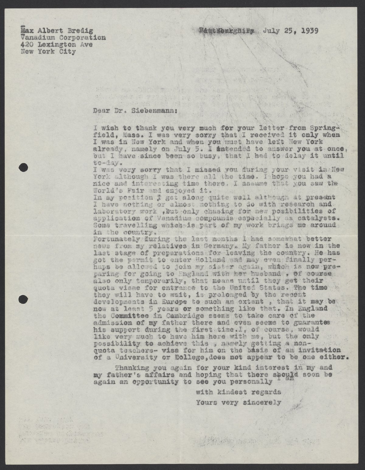 Letter from Max Bredig to Charles Siebenmann, July 25, 1939
