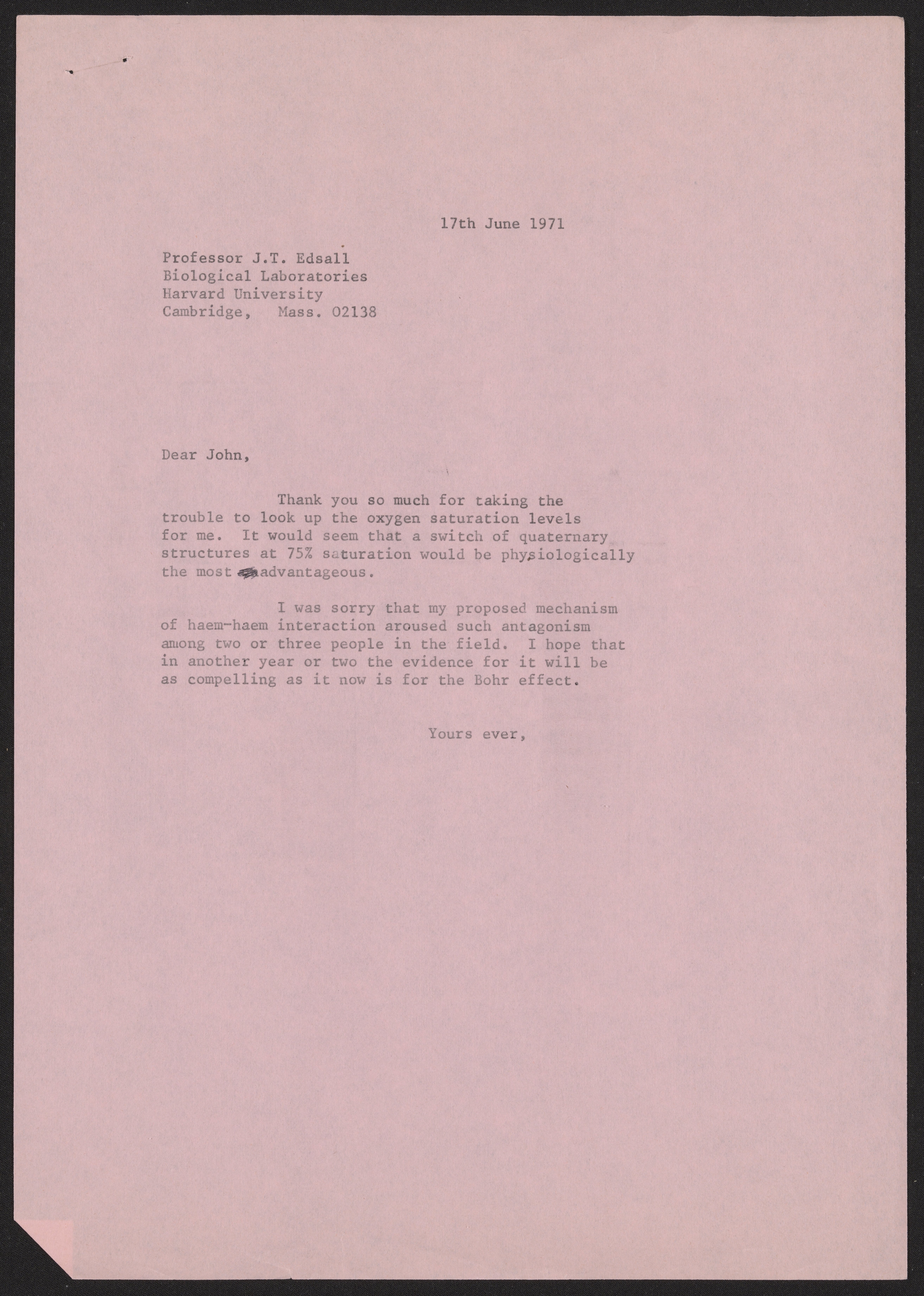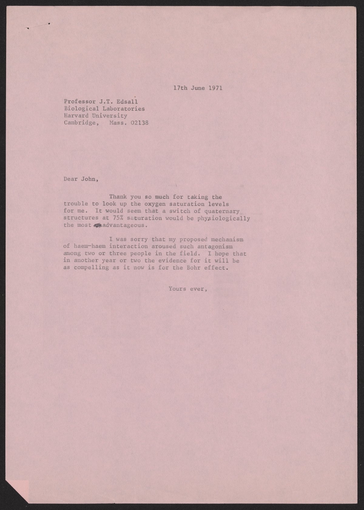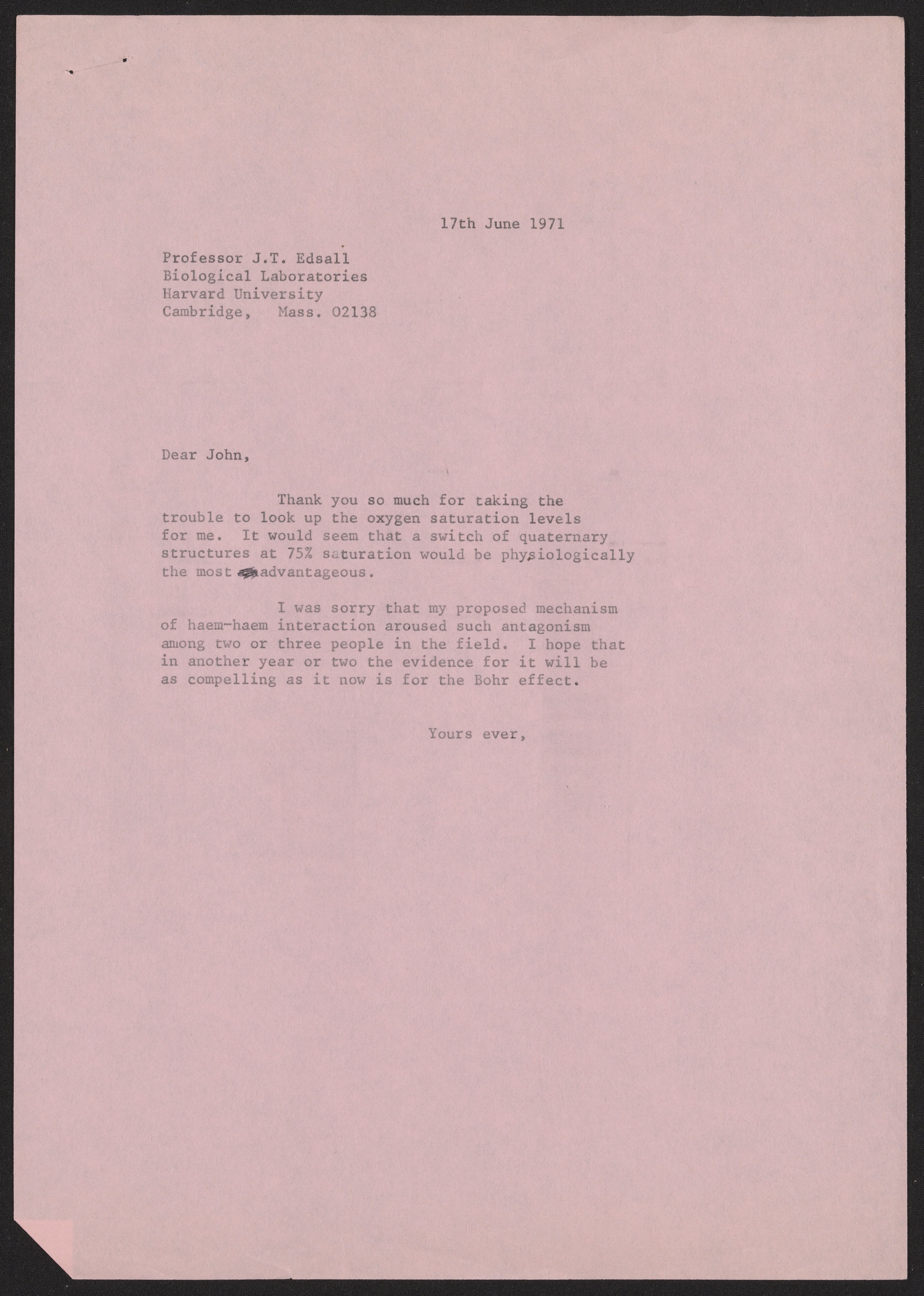 Letter from Max Perutz to John T. Edsall, June 17, 1971