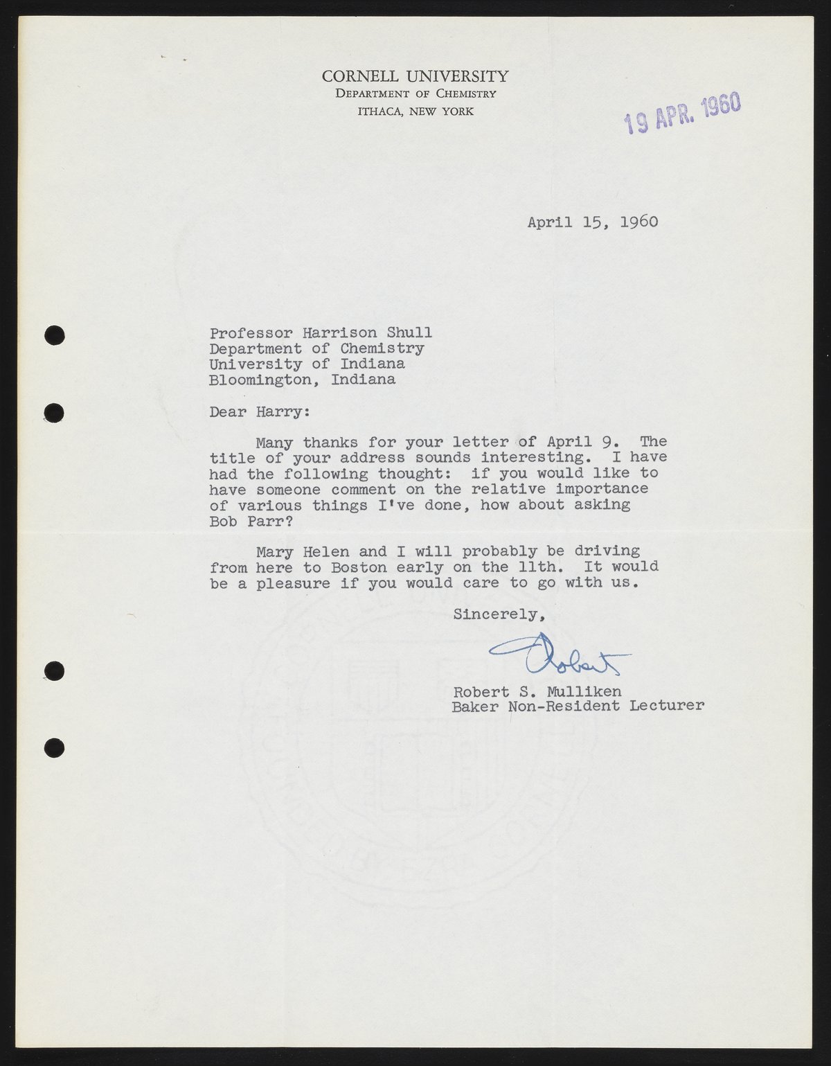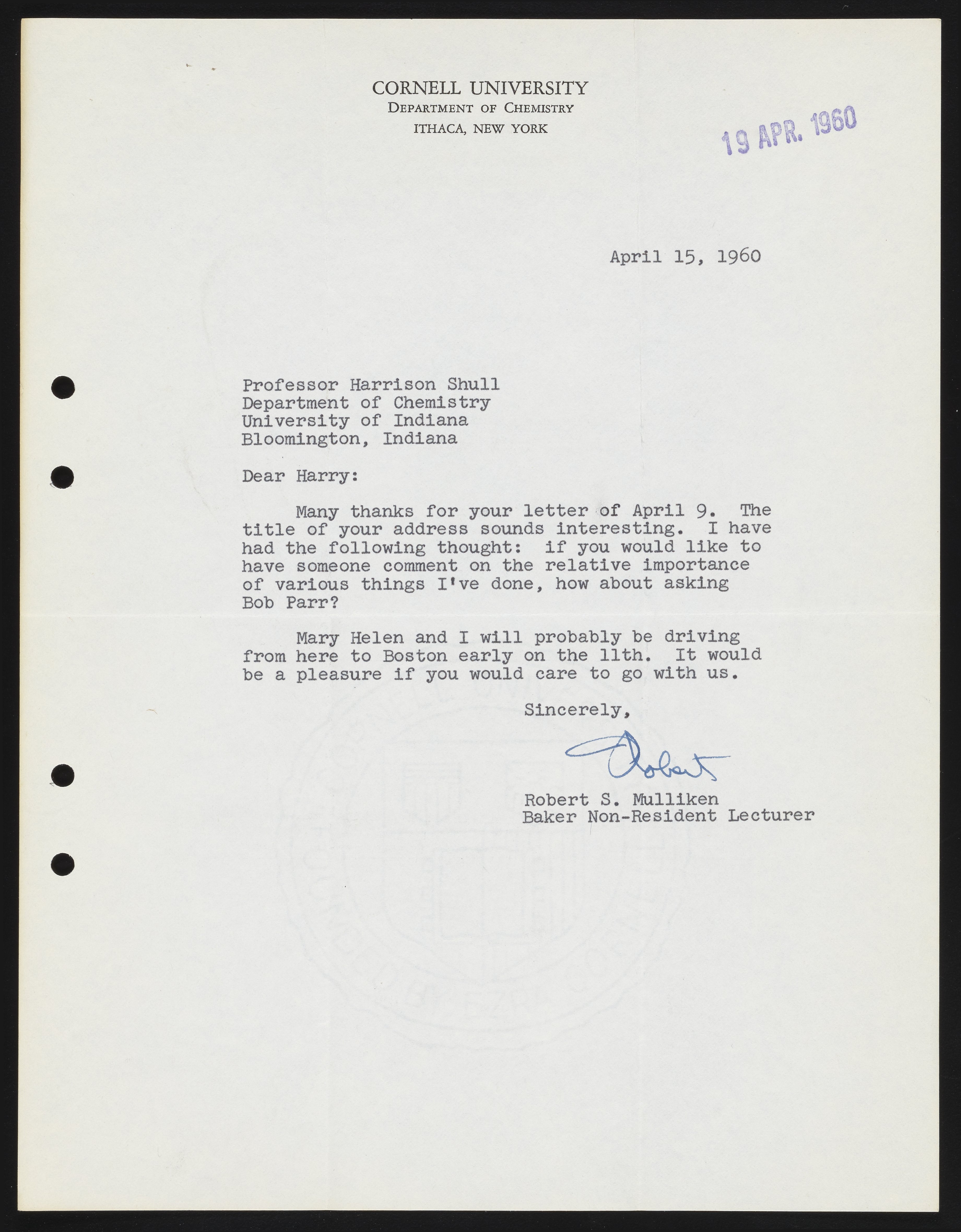 Letter from Robert S. Mulliken to Harrison Shull, 1960