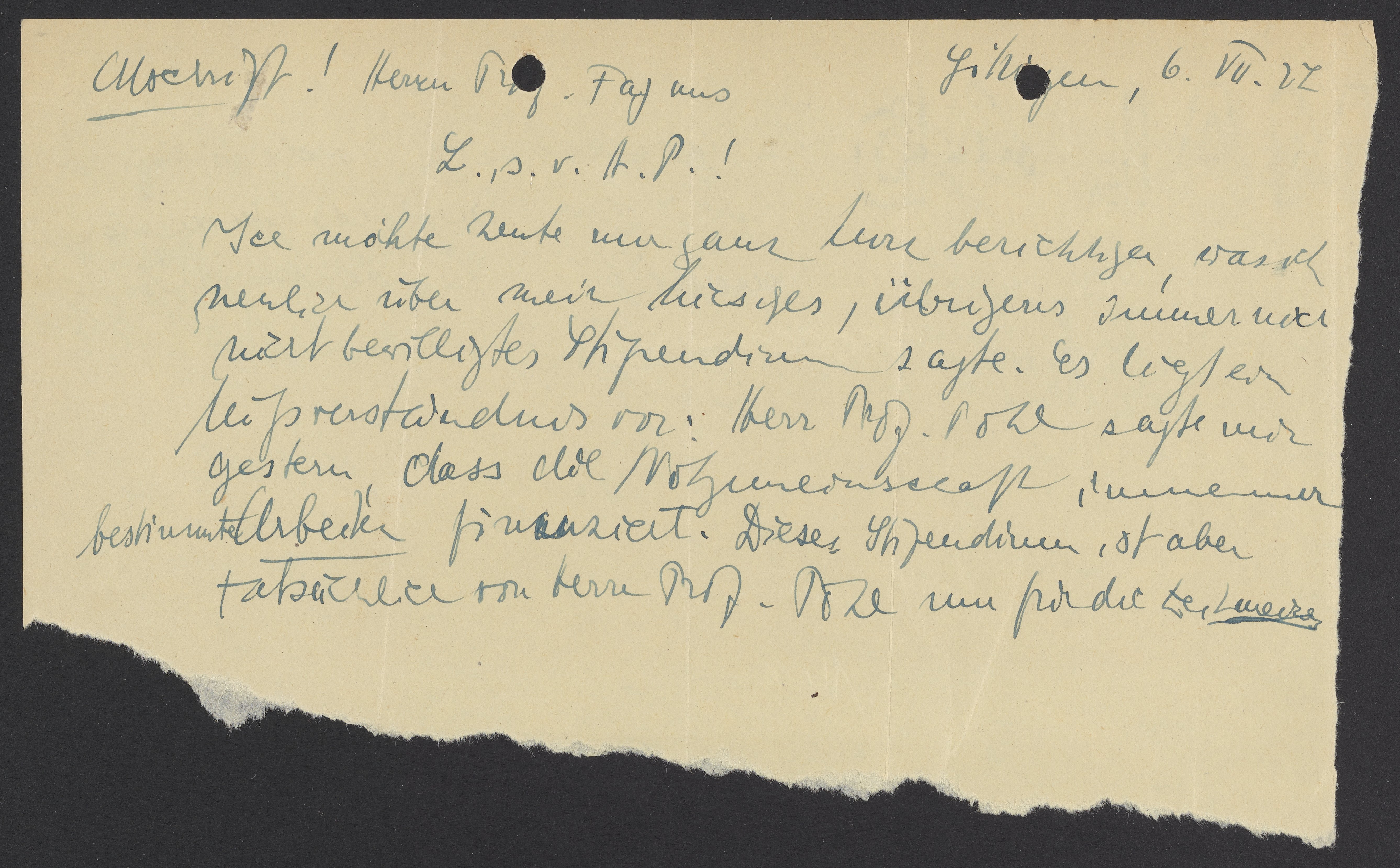 Letter from Max Bredig to Kasimir Fajans, July 1927