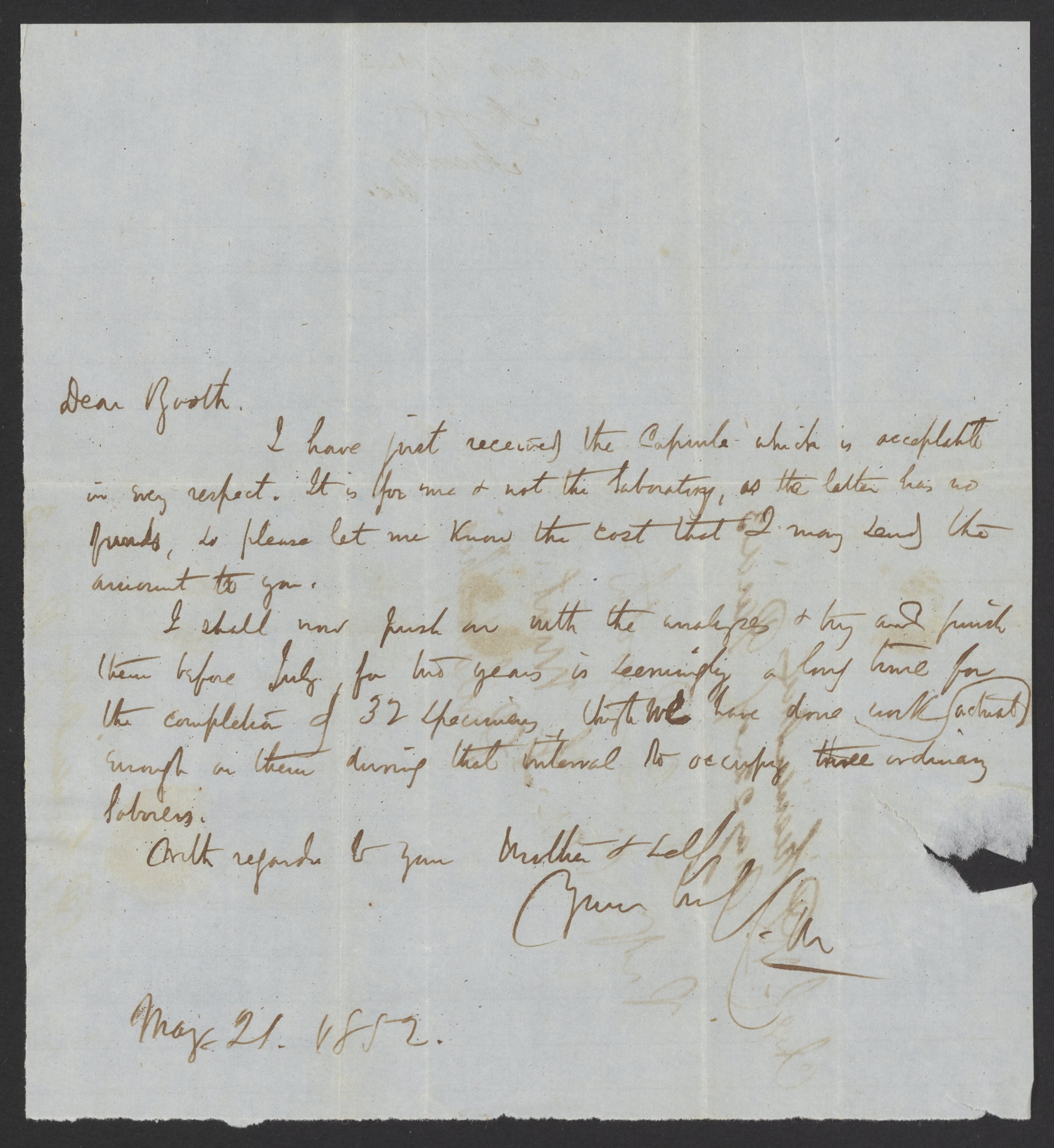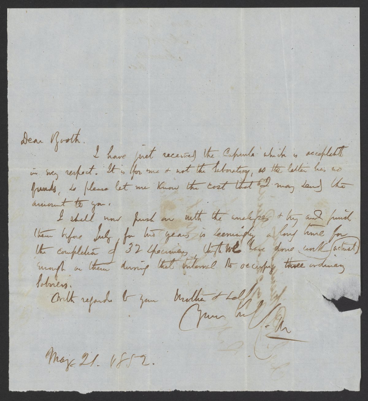 Morfit, Campbell. “Letter from Campbell Morfit to James Curtis Booth, May 21, 1852,” May 21, 1852. Papers of James Curtis Booth, Box 1, Folder 10. Science History Institute. Philadelphia. https://digital.sciencehistory.org/works/6eewhnl.