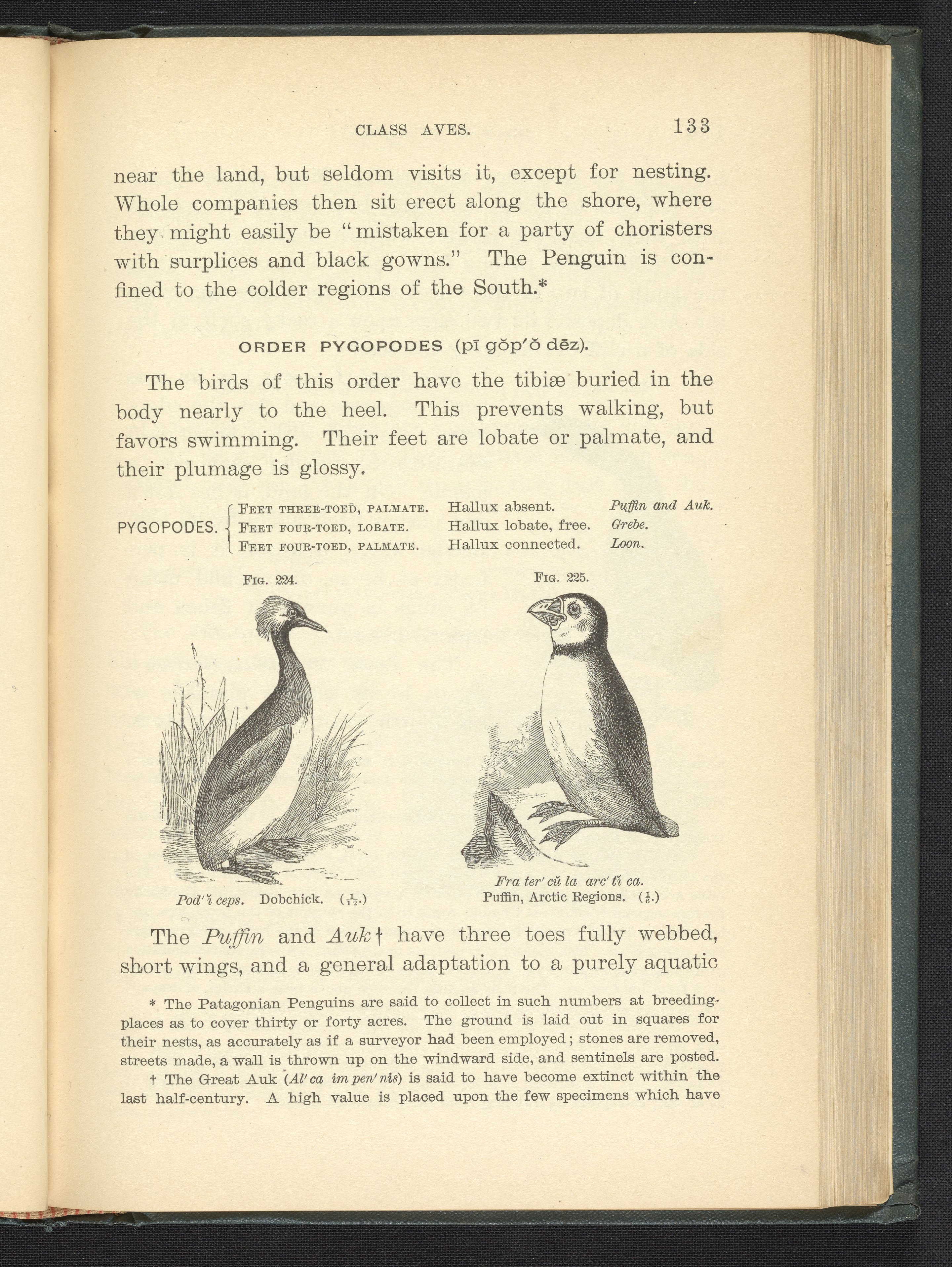 Steele, Joel Dorman, and Jenks, J. W. P. (John Whipple Potter). “Figure 224. Dobchick. Figure 225. Puffin, Arctic Region.” Popular Zoology. New York, New York: Chautauqua Press, 1887. https://digital.sciencehistory.org/works/6h6itg4.