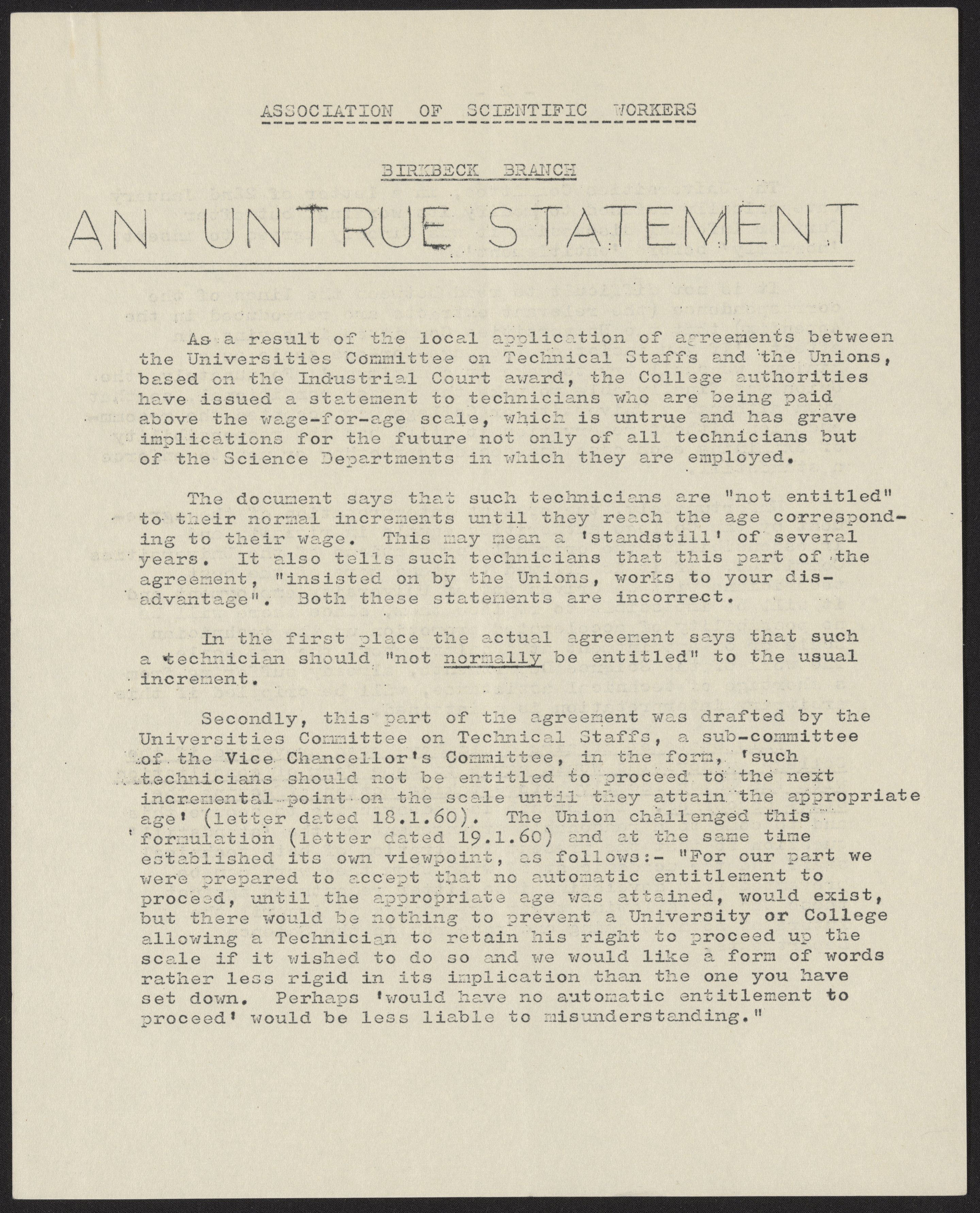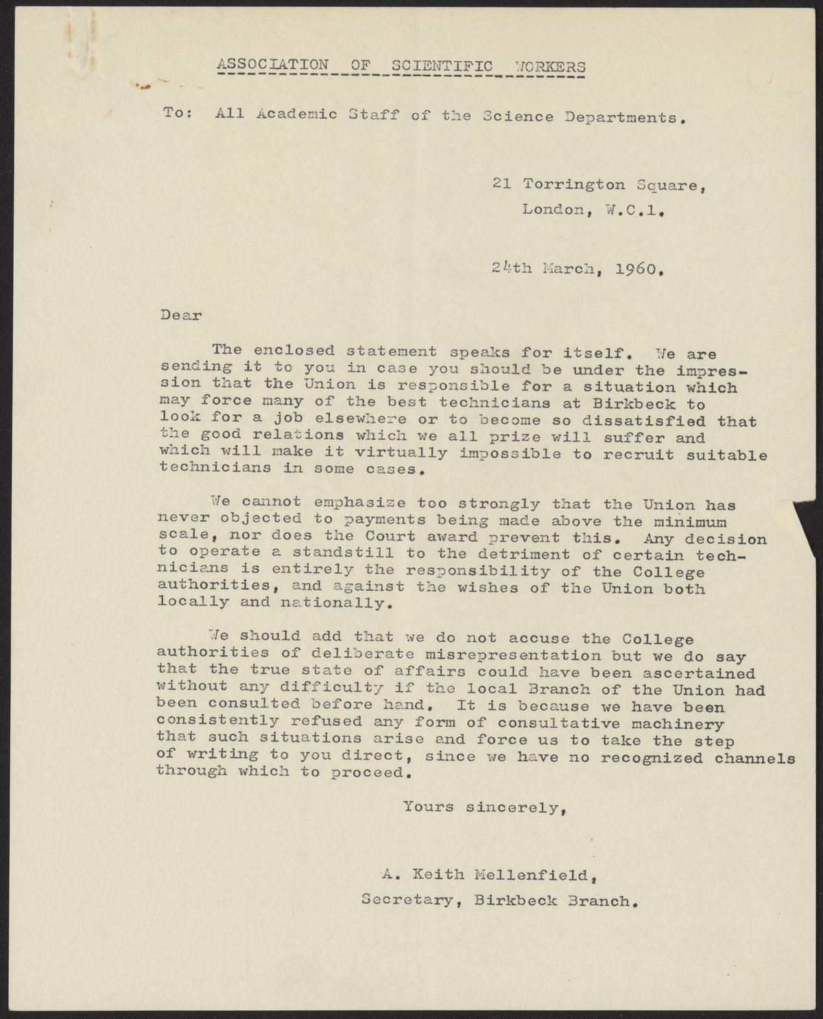 Association of Scientific Workers. “Letter from the Association of Scientific Works to the Academic Staff of the Science Departments at Birkbeck College,” March 24, 1960. History of Molecular Biology Collection, Box 17, Folder 12. Science History Institute. Philadelphia. https://digital.sciencehistory.org/works/6i18b5t.