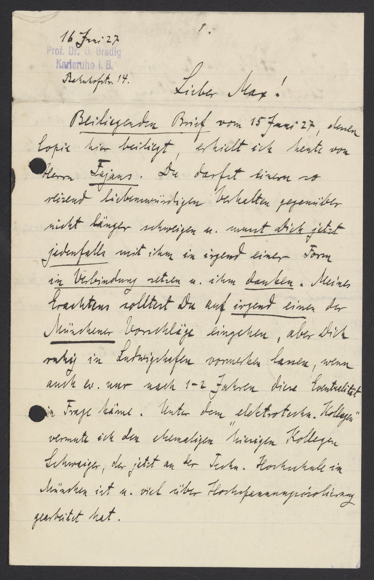 Beiliegenden Brief vom 15 Juni 27, dessen Kopie hier beiliegt, erhielt ich heute von Herrn Fajans. Du darfst einem so reizend liebenswürdigen Verhalten gegenüber nicht länger schweigen u. musst Dich jetzt jedenfalls setzen u. ihm danken. Meines Erachtens solltest Du auf irgend einen der Münchner Vorschläge eingehen, aber Dich ruhig in Ludwigshafen vormerken lassen, wenn auch ev. nur nach 1-2 Jahren diese Eventualität in Frage käme. Unter dem elektrotsch. Kollegen vermute ich den ehemaligen hiesigen Kollegen Schwaiger, der jetzt an Tech. Hochschule in München ist u. viel über Hochspannungsisololierung gearbeitet hat.