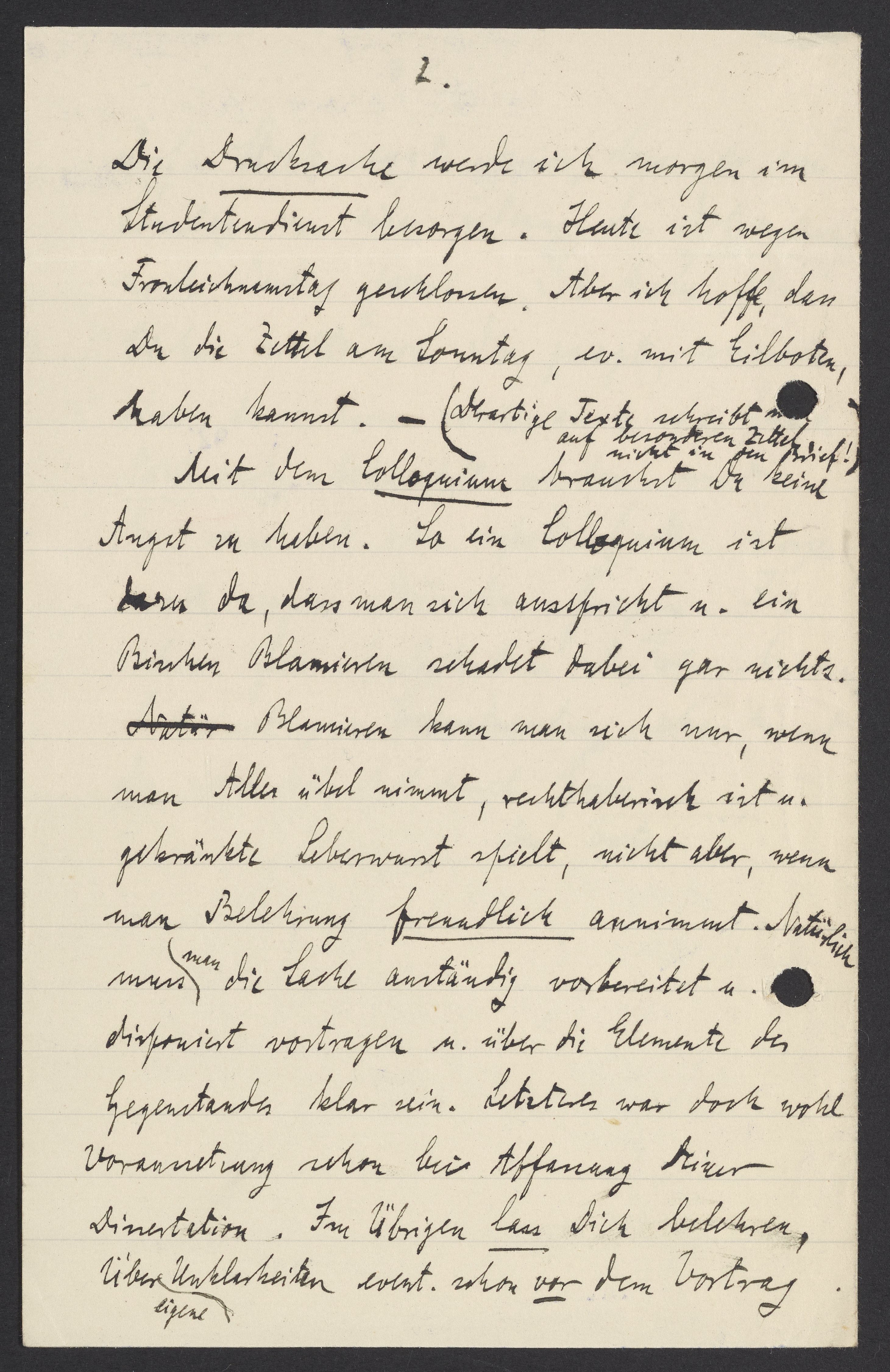 Die Drucksache werde ich morgen im Studentendienst besorgen. Heute ist wegen Fronleichnamstag geschlossen. Aber ich hoffe, dass Due die Zettel am Sonntag, ev. mit Eilboten haben kannst. – (Derartige Text schreibt man auf besonderen Zettel nicht in den Brief!)