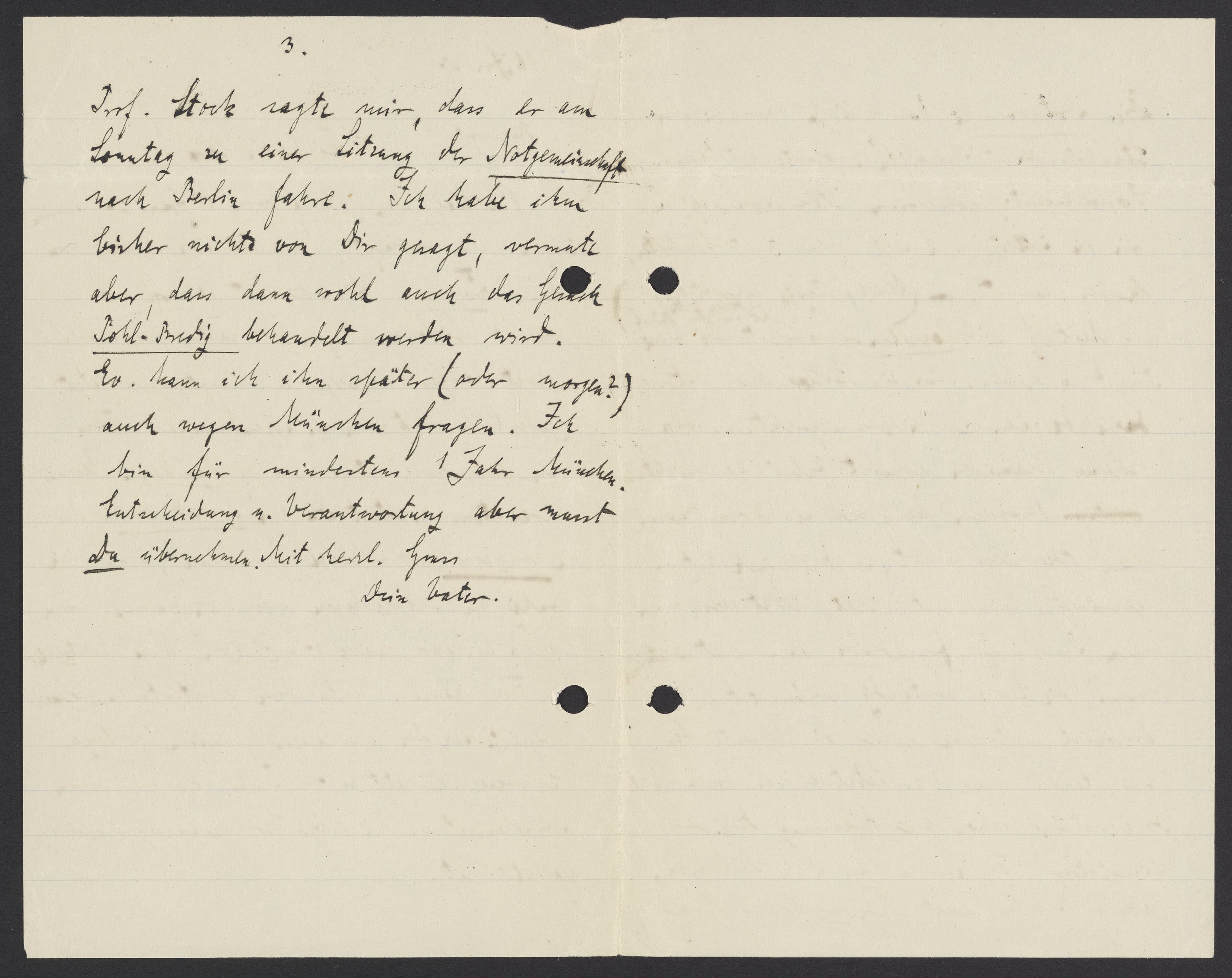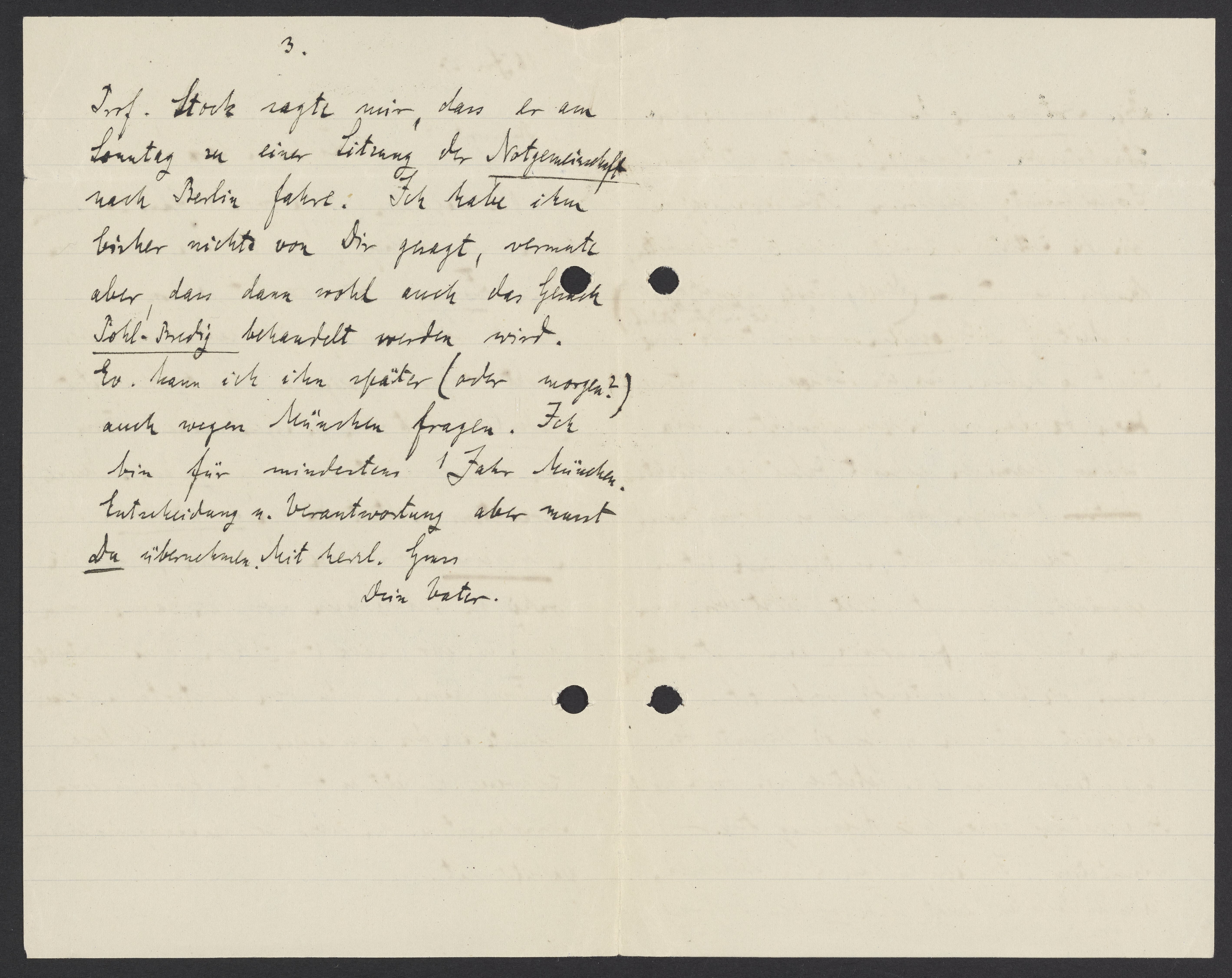 Prof. Stock sagte mir, dass er am Sonntag zu einer Sitzung der Notgemeinschaft nach Berlin fahre. Ich habe ihm bisher nichts von Dir gesagt, vermute aber, dass dann wohl auch das Gesuch Pohl-Bredig behandelt werden wird. Ev. kann ich ihm später (oder morgen?) auch wegen München fragen. Ich bin für mindestens 1 Jahr München Entwicklung u. Verantwortung aber musst Du übernehmen. Mit herzl. Gruss