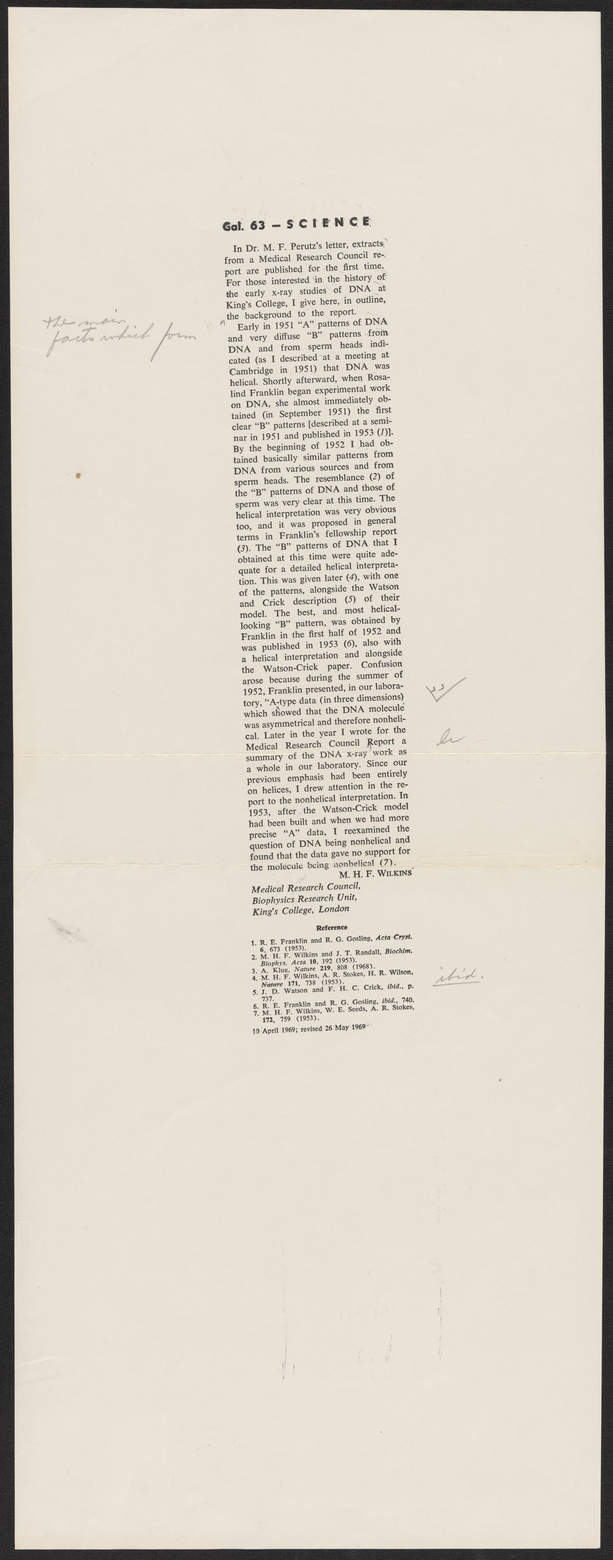 Wilkins, Maurice. “Letter to the Editor Written by Maurice Wilkins, April 10, 1969,” April 10, 1969. History of Molecular Biology Collection, Box 88, Folder 4. Science History Institute. Philadelphia. https://digital.sciencehistory.org/works/6kx9fjk.