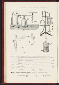 Catalog of scientific apparatus for chemical laboratories sold by the Emil Greiner Company. Promising superior quality and prompt delivery, the catalog includes items for sale such as burners, burets, pipettes, and Geissler tubes. The glassware sold by the Greiner Company was molded by the company's European corporate partner, Franz Schilling, who ran a prosperous glassworks in Gehlberg, Germany from 1874 to at least 1925. The volume is fully illustrated with engraved depictions of available glassware products.