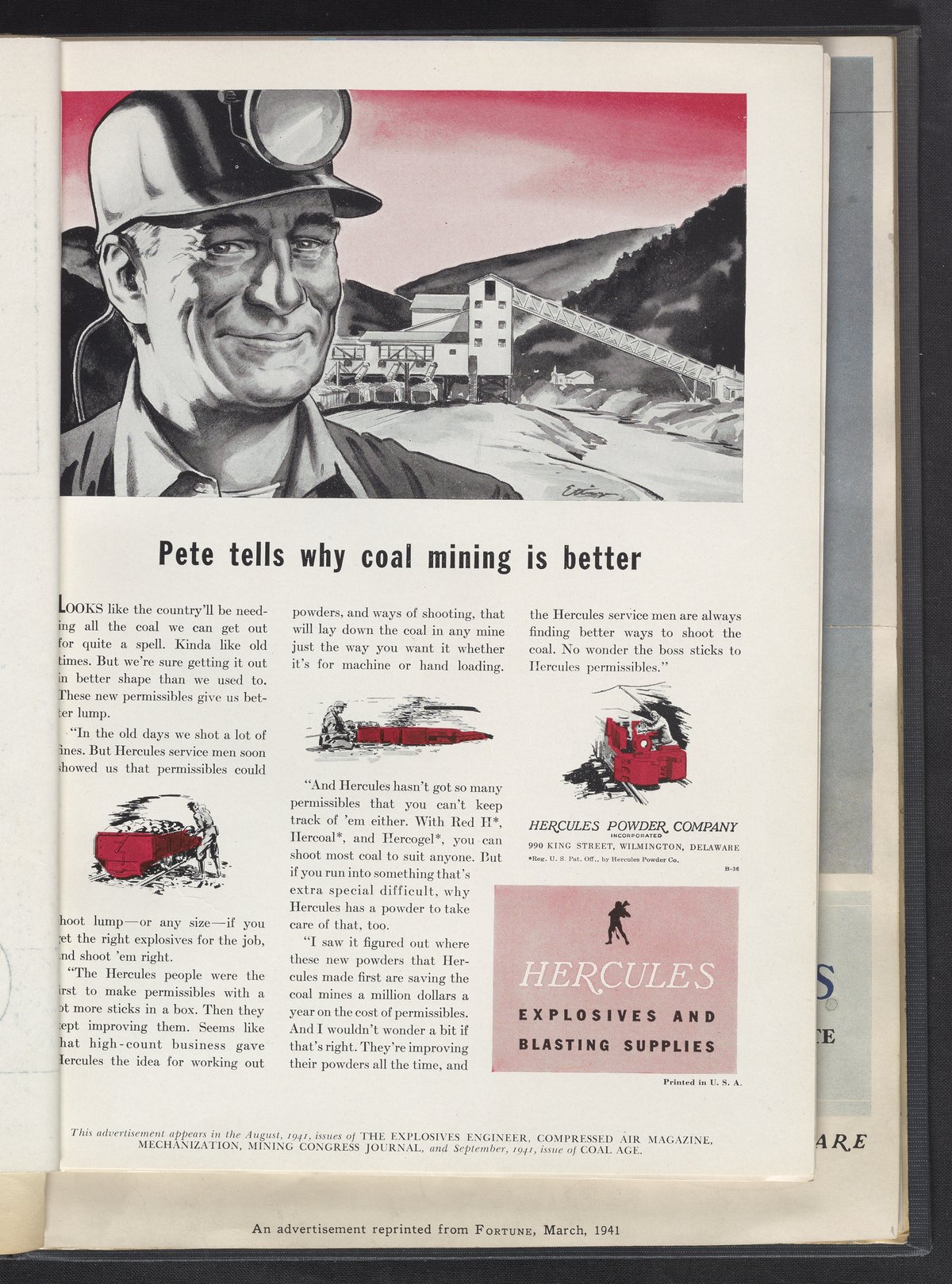 Hercules Incorporated. “Hercules Explosives and Blasting Supplies: Pete Tells Why Coal Mining Is Better.” 1941 Hercules Advertisements, 1941. Records of Hercules Incorporated, Volume 1941. Science History Institute. Philadelphia. https://digital.sciencehistory.org/works/6m311q17k.