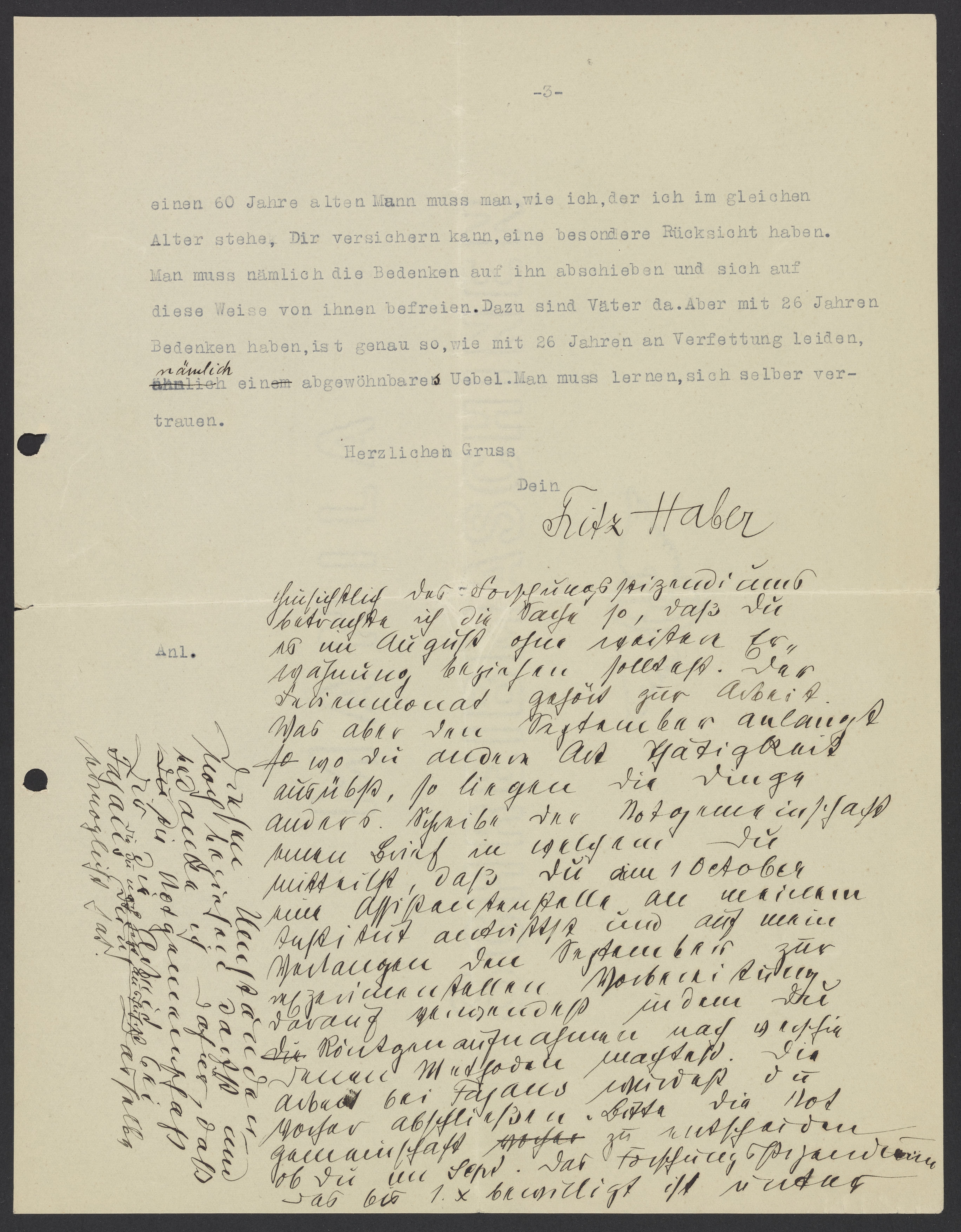 einen 60 Jahre alten Mann muss man, wie ich, der ich im gleichen Alter stehe, Dir versichern kann, eine besondere Rücksicht haben. Man muss nämlich die Bedenken auf ihn abschieben und sich auf diese Weise von ihnen befreien. Dazu sind Väter da. Aber mit 26 Jahren Bedenken haben, ist genau so, wie mit 26 Jahren an Verfettung leiden, nämlich ein abgewöhnbare Uebel. Man muss lernen, sich selber vertrauen.