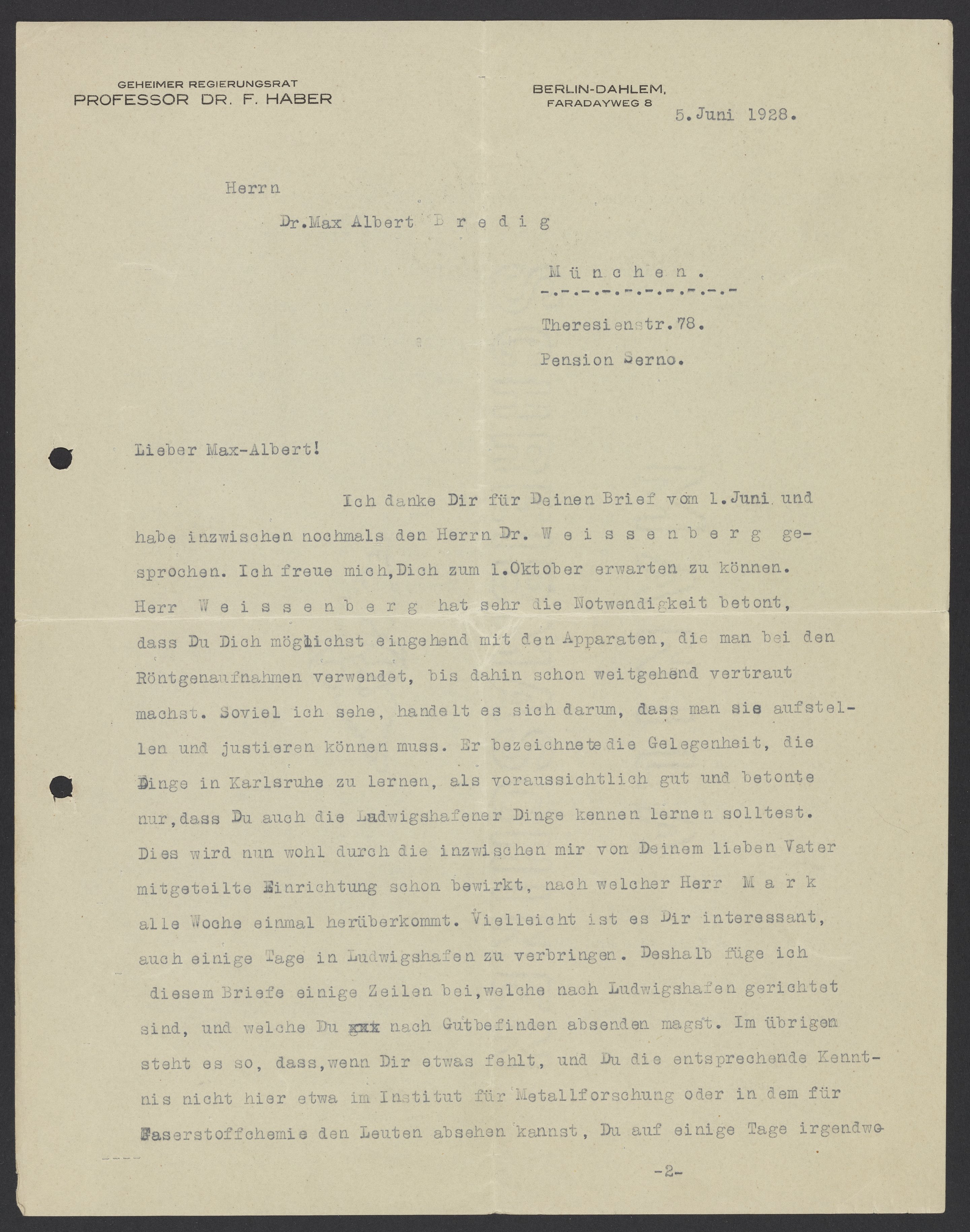 Ich danke Dir für Deinen Brief vom 1. Juni und habe inzwischen nochmals den Herrn. Dr. Weissenberg gesprochen. Ich freue mich, Dich zum 1. Oktober erwarten zu können. Herr Weissenberg hat sehr die Notwendigkeit betont, dass Du Dich möglichst eingehend mit den Apparaten, die man bei den Röntgenaufnahmen verwendet, bis dahin schon weitgehend vertraut machst. Soviel ich sehe, handelt es sich darum, dass man sie aufstellen und justieren können muss. Er bezeichnete die Gelegenheit, die Dinge in Karlsruhe zu lernen, als voraussichtlich gut und betonte nur, dass Du auch die Ludwigshafener Dinge kennen lernen solltest. Dies wird nun wohl durch die inzwischen mir von Deinem lieben Vater mitgeteilte Einrichtung schon bewirkt, nach welcher Herr Mark alle Woche einmal herüberbekommt. Vielleicht ist es Dir interessant auch einige Tage in Ludwigshafen zu verbringen. Deshalb füge ich diesem Briefe einige Zeilen bei, welche nach Ludwigshafen gerichtet sind, und welche Du nach Gutbefinden absenden magst. Im übrigen steht es so, dass, wenn Dir etwas fehlt, und Du die entsprechende Kenntnis nicht hier etwa im Institut für Metallforschung oder in dem für Faserstoffchemie den Leuten absehen kannst, Du auf einige Tage irgendwo