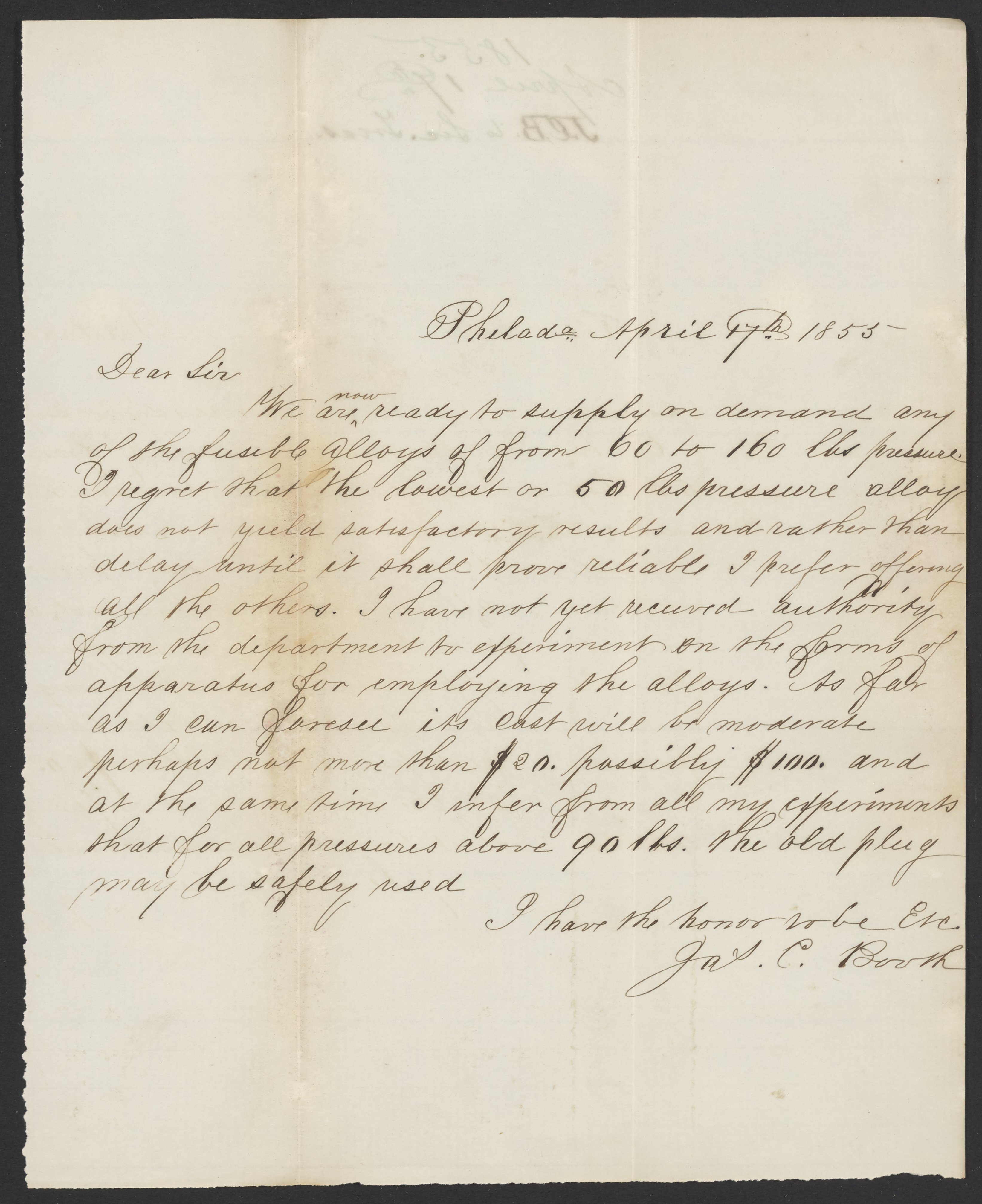 Small JPG1200 x 1471px — 223 KBLarge JPG2880 x 3530px — 906 KBFull-sized JPG3285 x 4026px — 1.1 MBOriginal fileTIFF — 3285 x 4026px — 37.9 MBJames Curtis Booth (1810-1888) is ready to supply on demand any of the fusible alloys from 60 to 160 lbs. pressure.