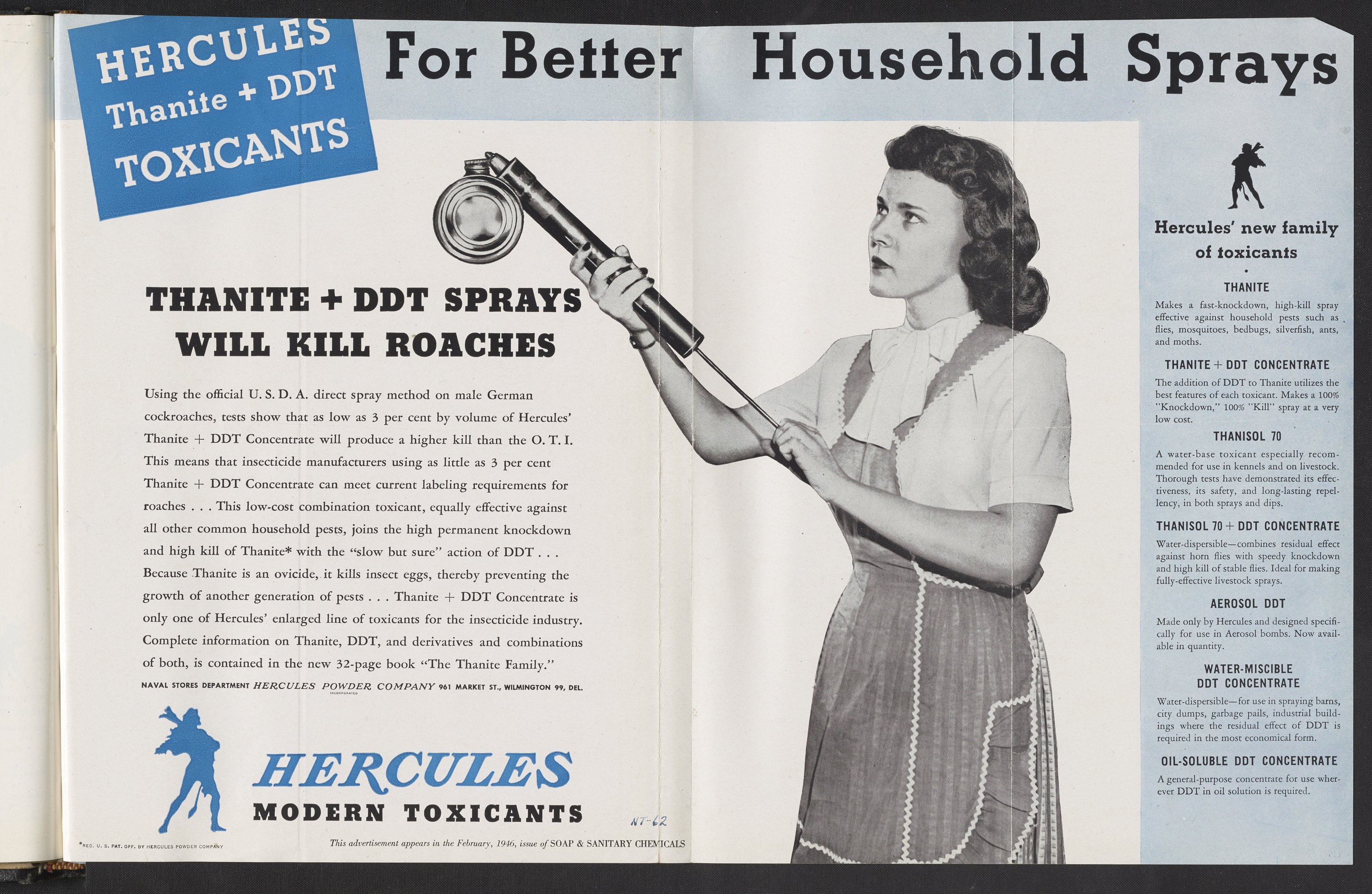 Hercules Incorporated. “Hercules Thanite + DDT Toxicants, For Better Household Sprays.” 1946 Hercules Advertisements, 1946. Records of Hercules Incorporated, Volume 1946. Science History Institute. Philadelphia. https://digital.sciencehistory.org/works/6q182k80n.