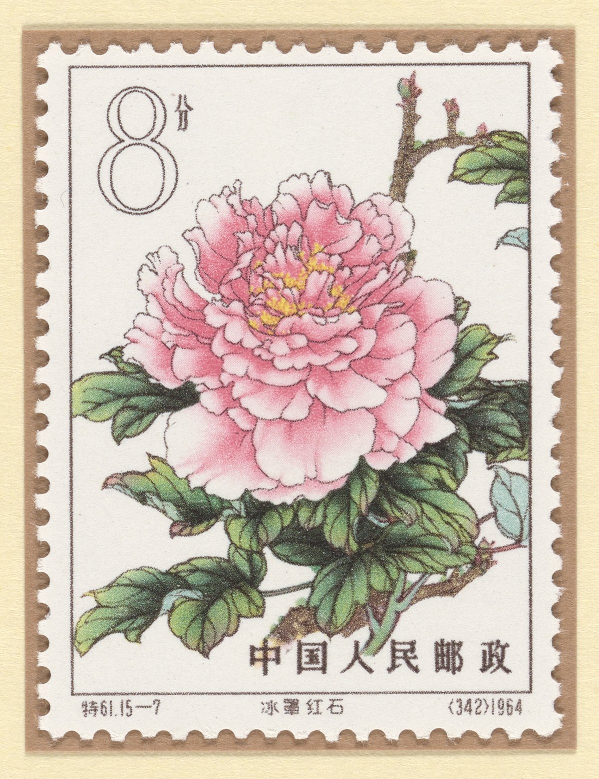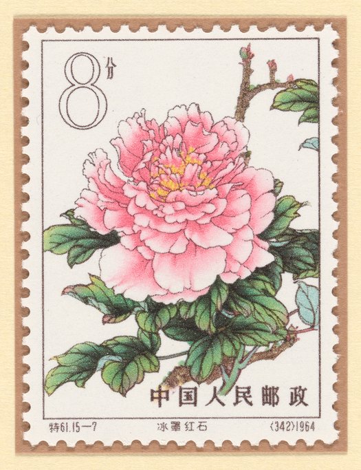 Postage stamp featuring an illustration of a variety of tree peonies called Ruby Wrapped in Ice (冰罩紅石). This stamp is part of a stamp series titled "Tree Peonies," which was issued in 1964 by the People's Republic of China.