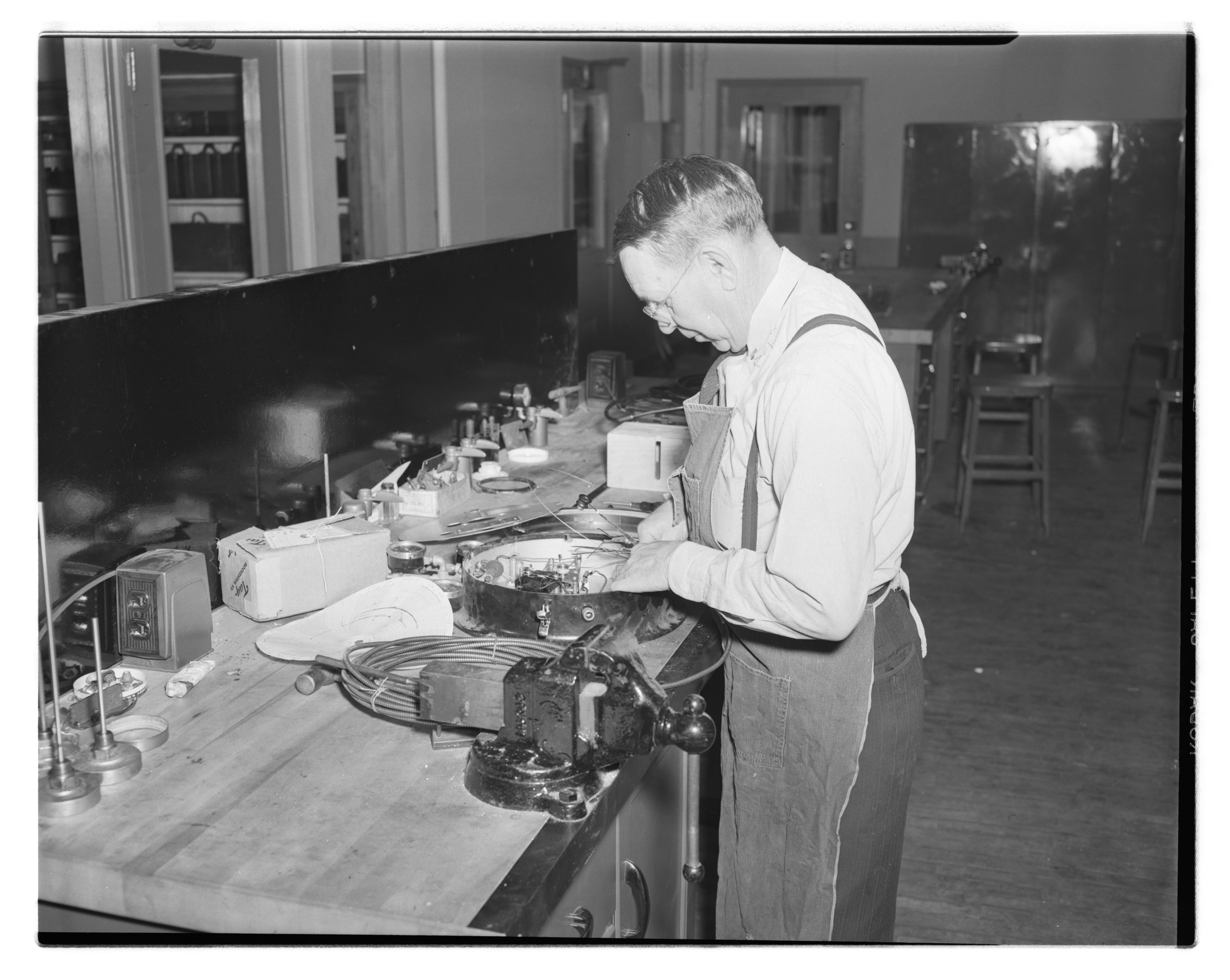 General view of instrument journeyman Harry Beamish inserting an element into a Foxboro recording thermometer in the Dow Chemical Company's Instrument Department. Established in 1926, the Instrument Department was responsible for the installation and maintenance of the assorted apparatus necessary to manage the plant's production facilities and processes. The department notably maintained accurate standards for temperatures, voltage, resistance, flow and pressures against which the plant's instruments were regularly calibrated and checked for accuracy.