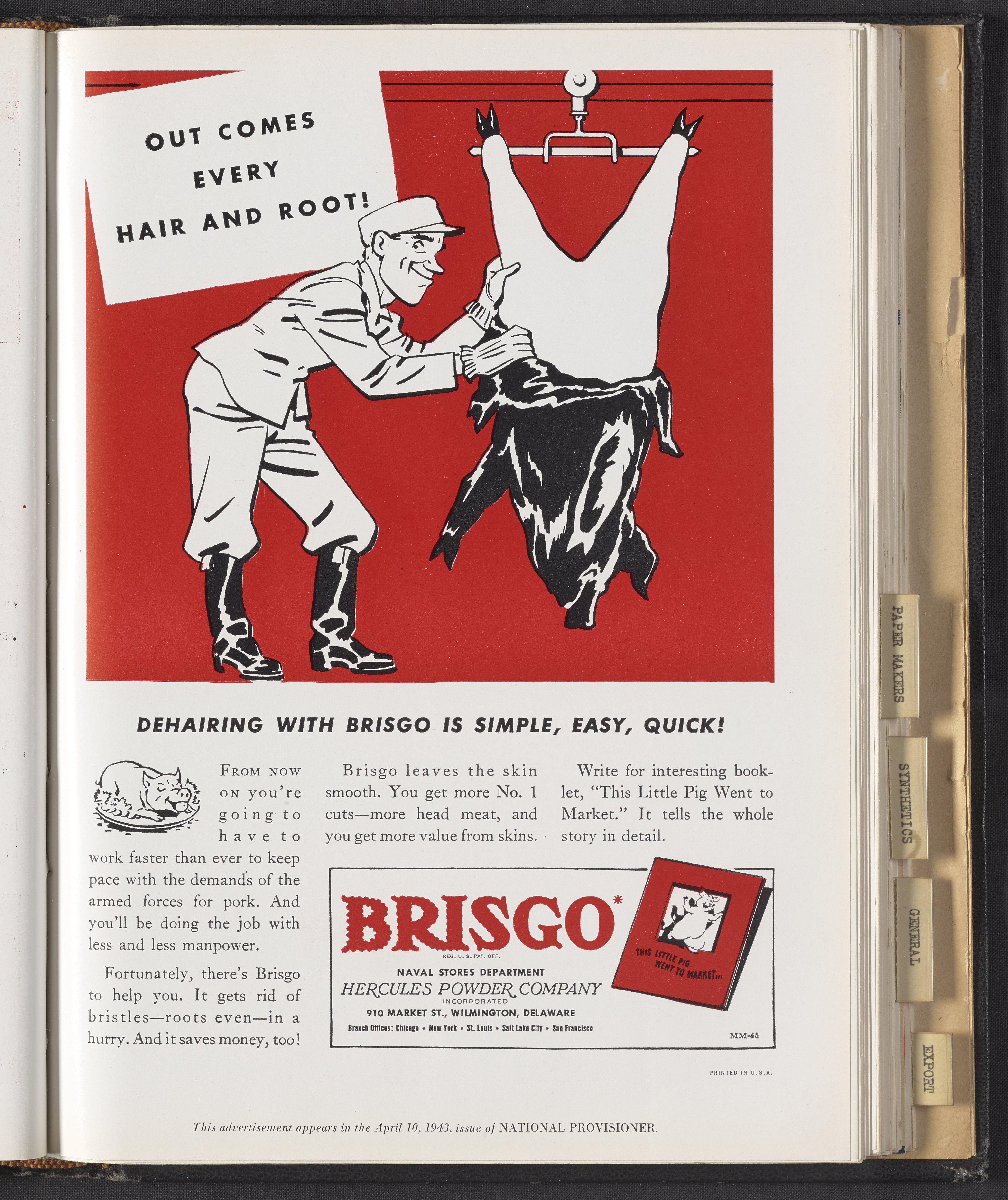 Advertisement for Brisgo, a trademarked depilatory compound manufactured and sold by the Hercules Powder Company for the cosmetic removal of hair from hog skin. This advertisement appeared in the April 10, 1943 issue of National Provisioner.