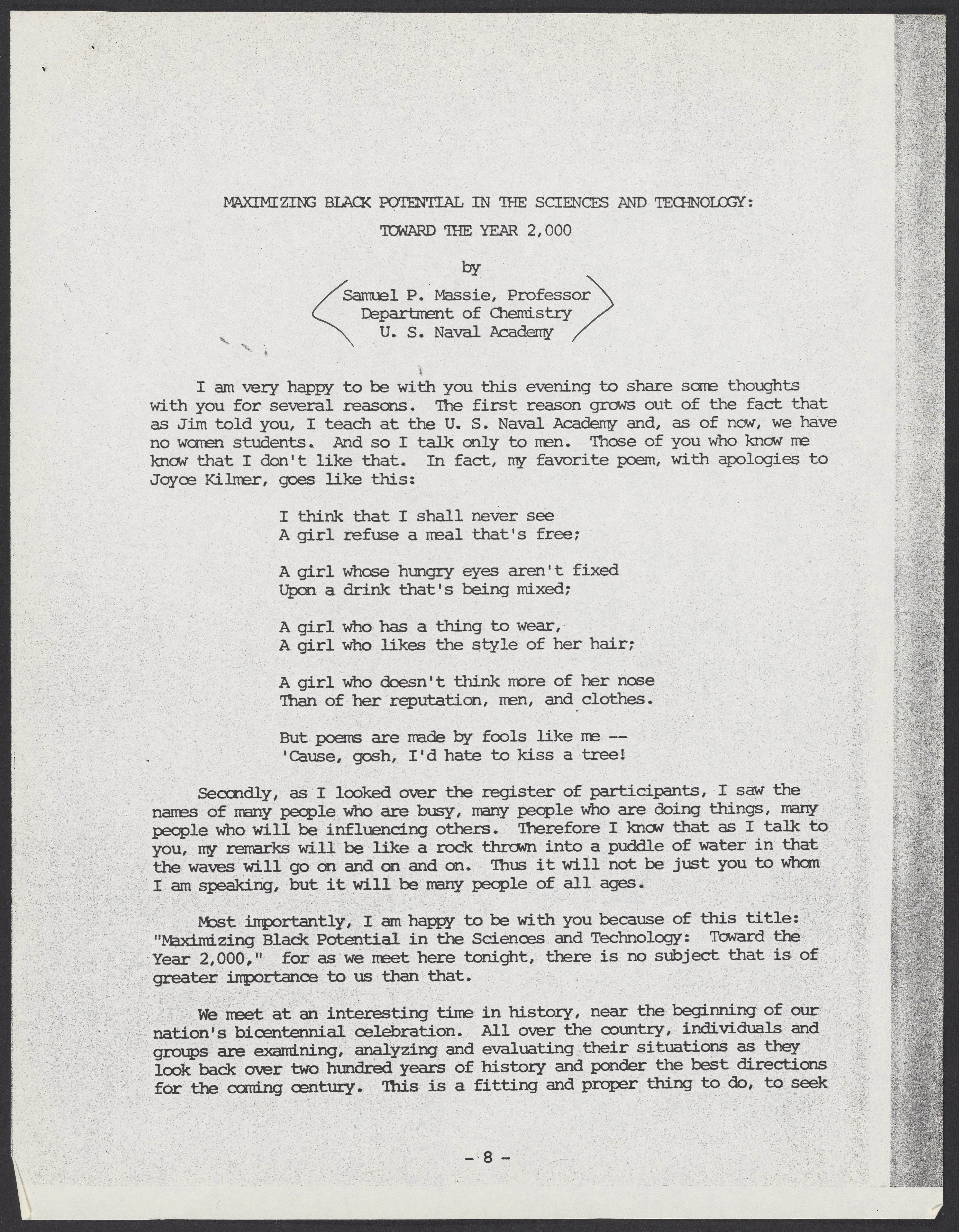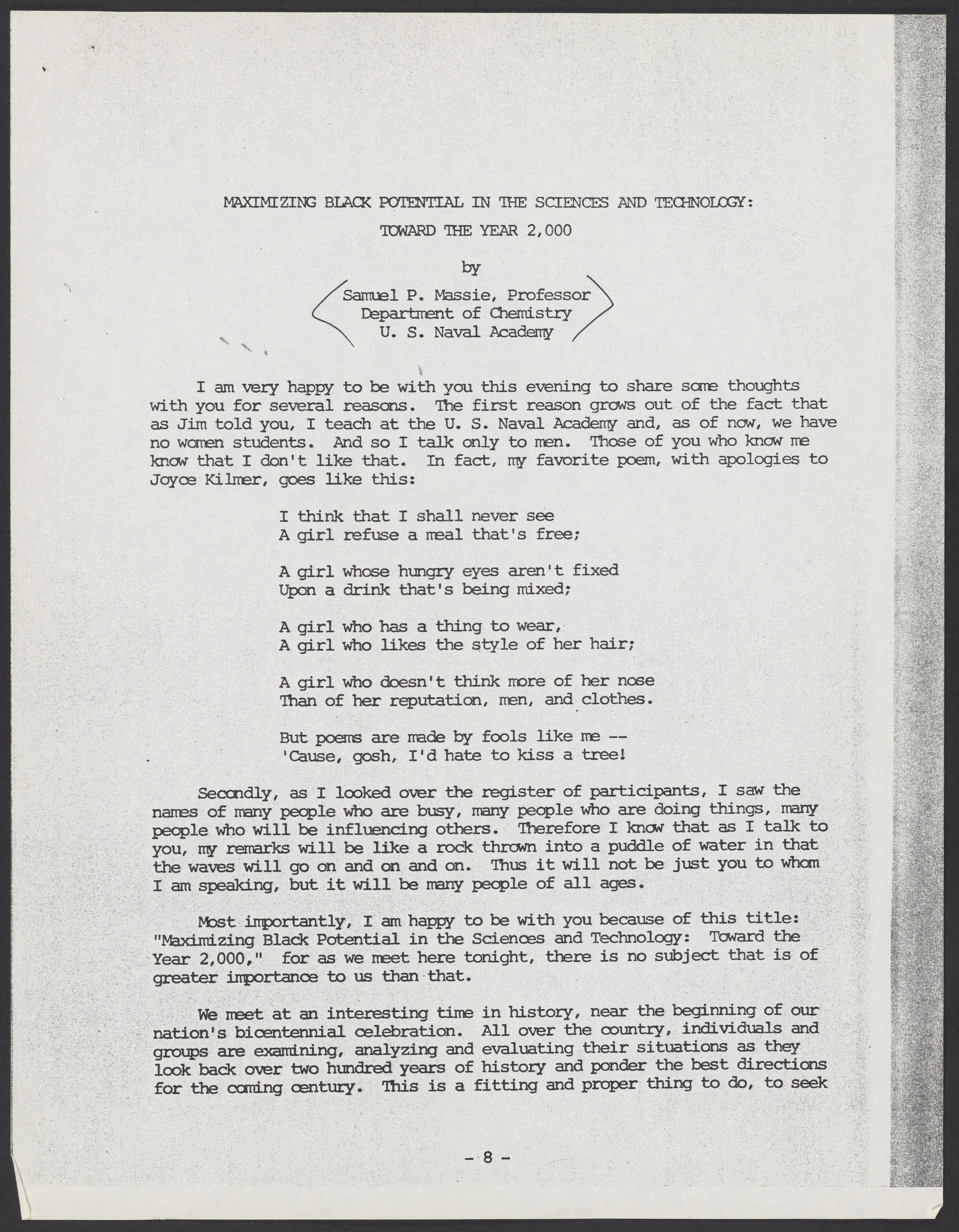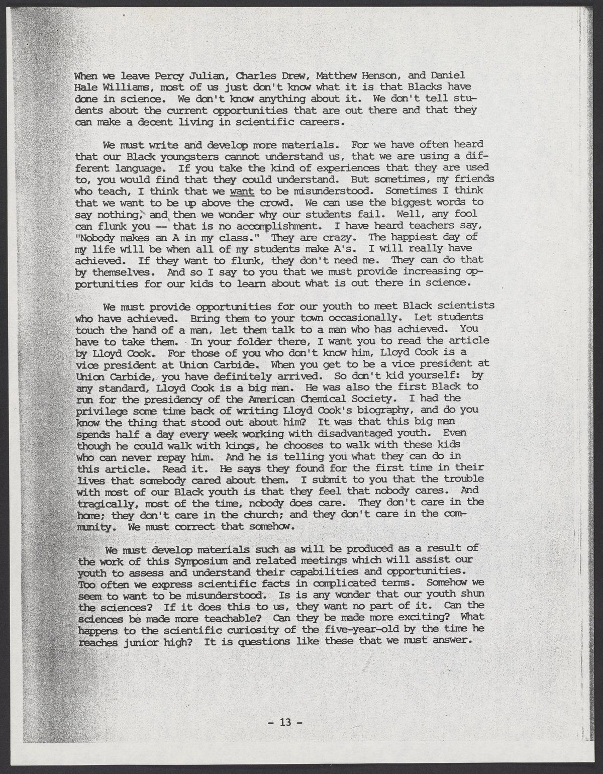Small JPG1200 x 1545px — 544 KBLarge JPG2880 x 3708px — 3.4 MBFull-sized JPG5380 x 6927px — 10.8 MBOriginal fileTIFF — 5380 x 6927px — 107 MBTyped transcript of Samuel P. Massie's (1919-2005) remarks, and of a question-and-answer exchange between Massie and Dr. Robert Bradford (1931-2011), from the 1975 Science Symposium of the National Consortium for Black Professional Development. The symposium, which was held November 10-13, 1975 at Kentucky Dam Village State Resort Park, Gilbertsville, Kentucky, was titled "Maximizing Black Potential in Science and Technoloy: Toward the Year 2000."