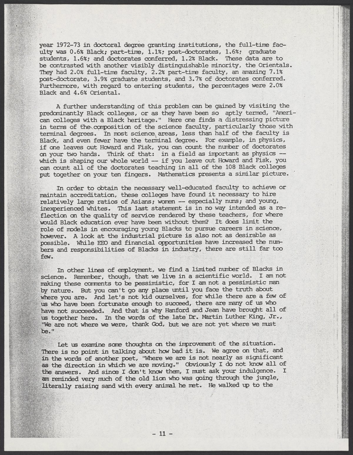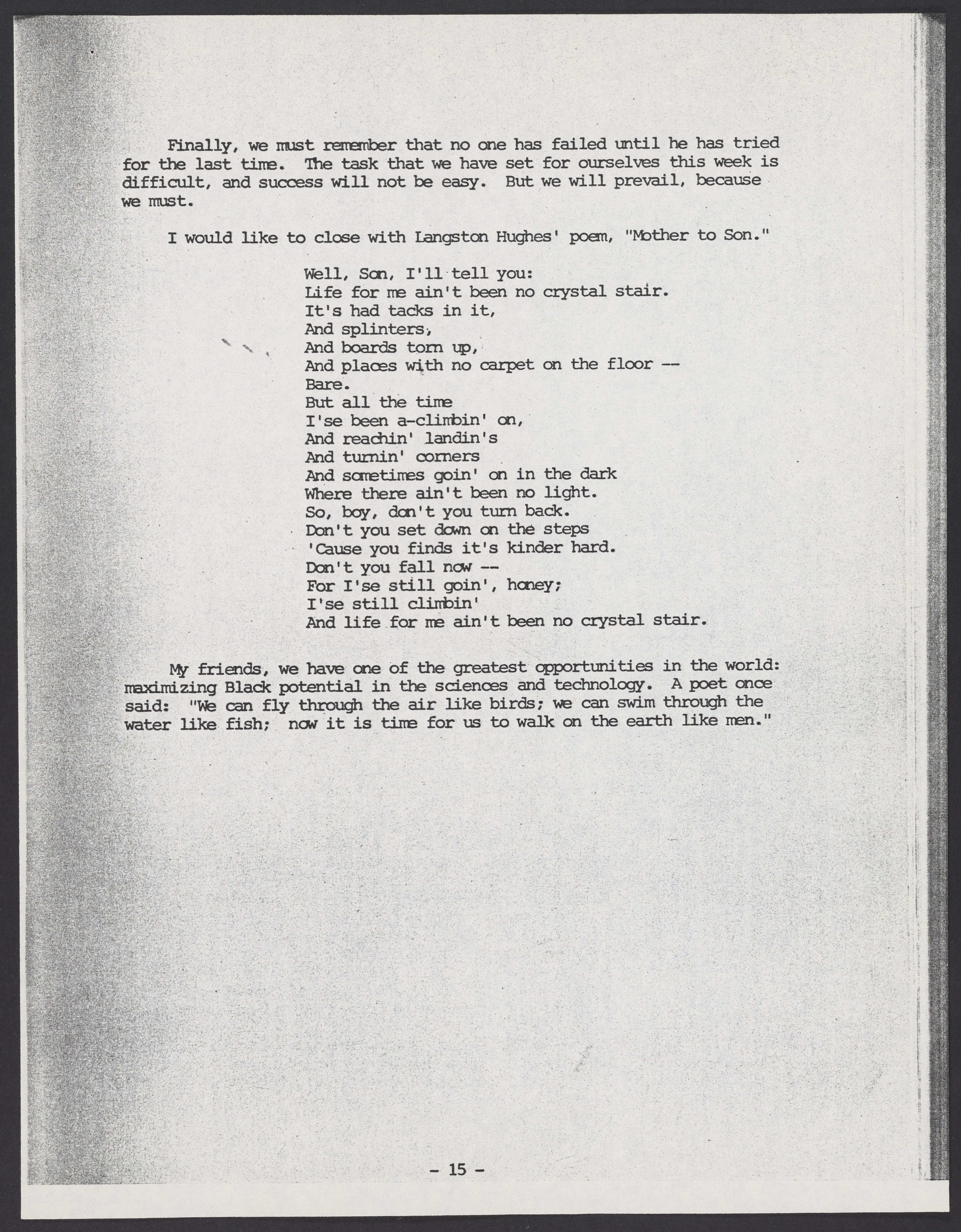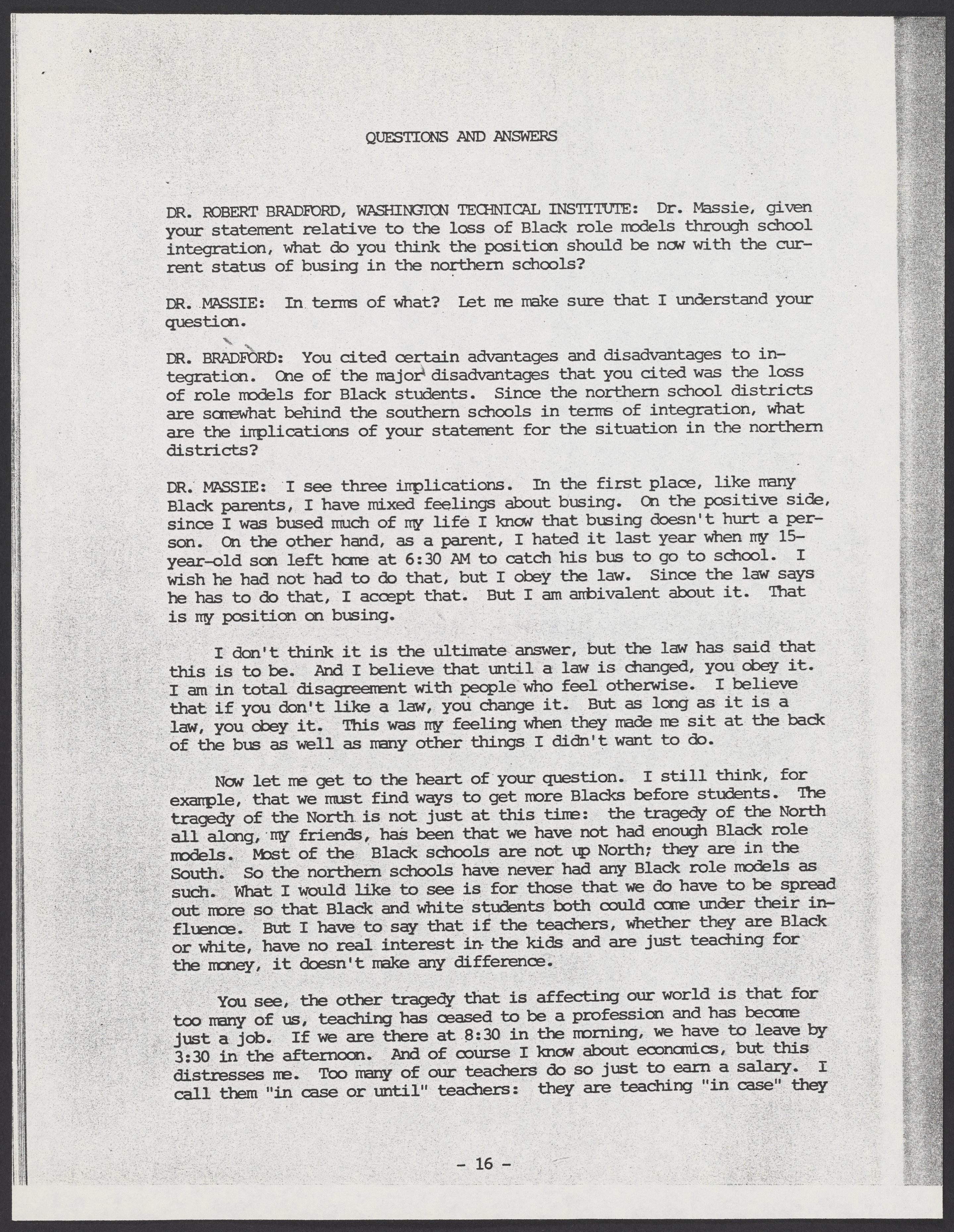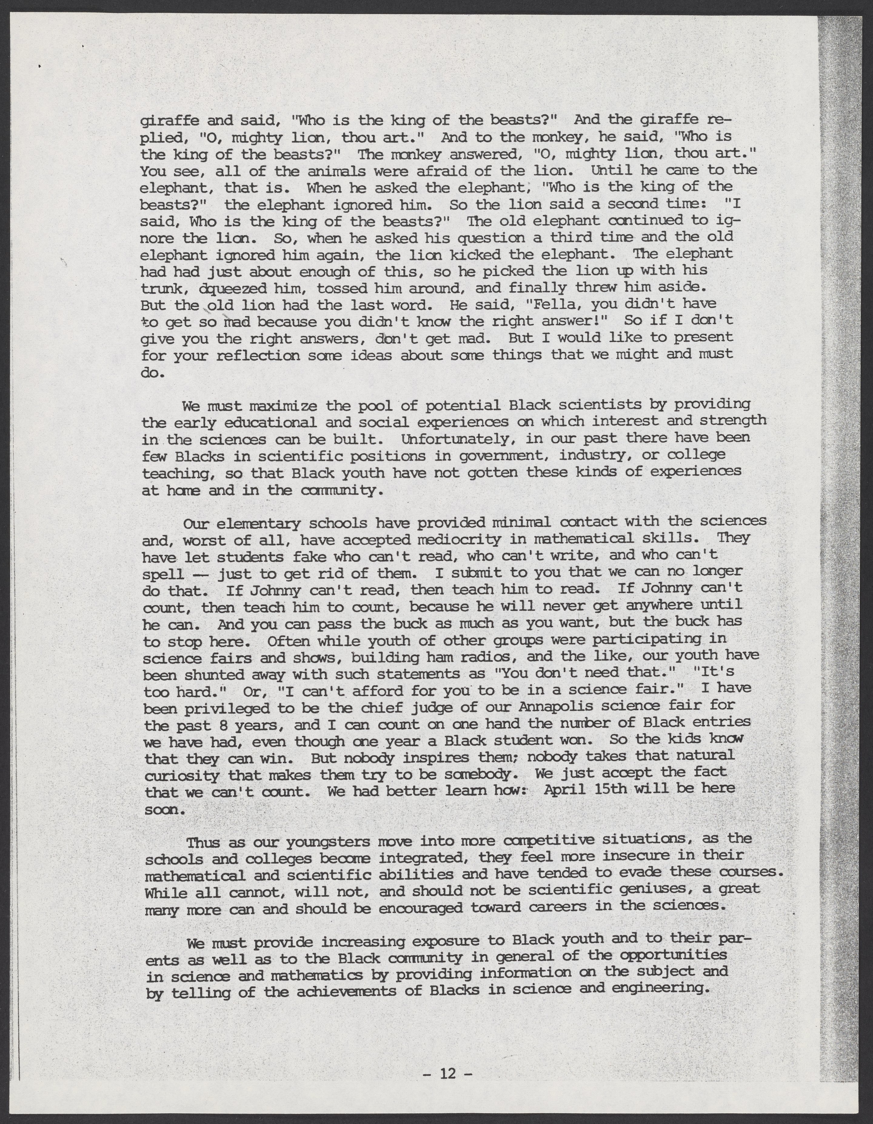 Small JPG1200 x 1545px — 544 KBLarge JPG2880 x 3708px — 3.4 MBFull-sized JPG5380 x 6927px — 10.8 MBOriginal fileTIFF — 5380 x 6927px — 107 MBTyped transcript of Samuel P. Massie's (1919-2005) remarks, and of a question-and-answer exchange between Massie and Dr. Robert Bradford (1931-2011), from the 1975 Science Symposium of the National Consortium for Black Professional Development. The symposium, which was held November 10-13, 1975 at Kentucky Dam Village State Resort Park, Gilbertsville, Kentucky, was titled "Maximizing Black Potential in Science and Technoloy: Toward the Year 2000."