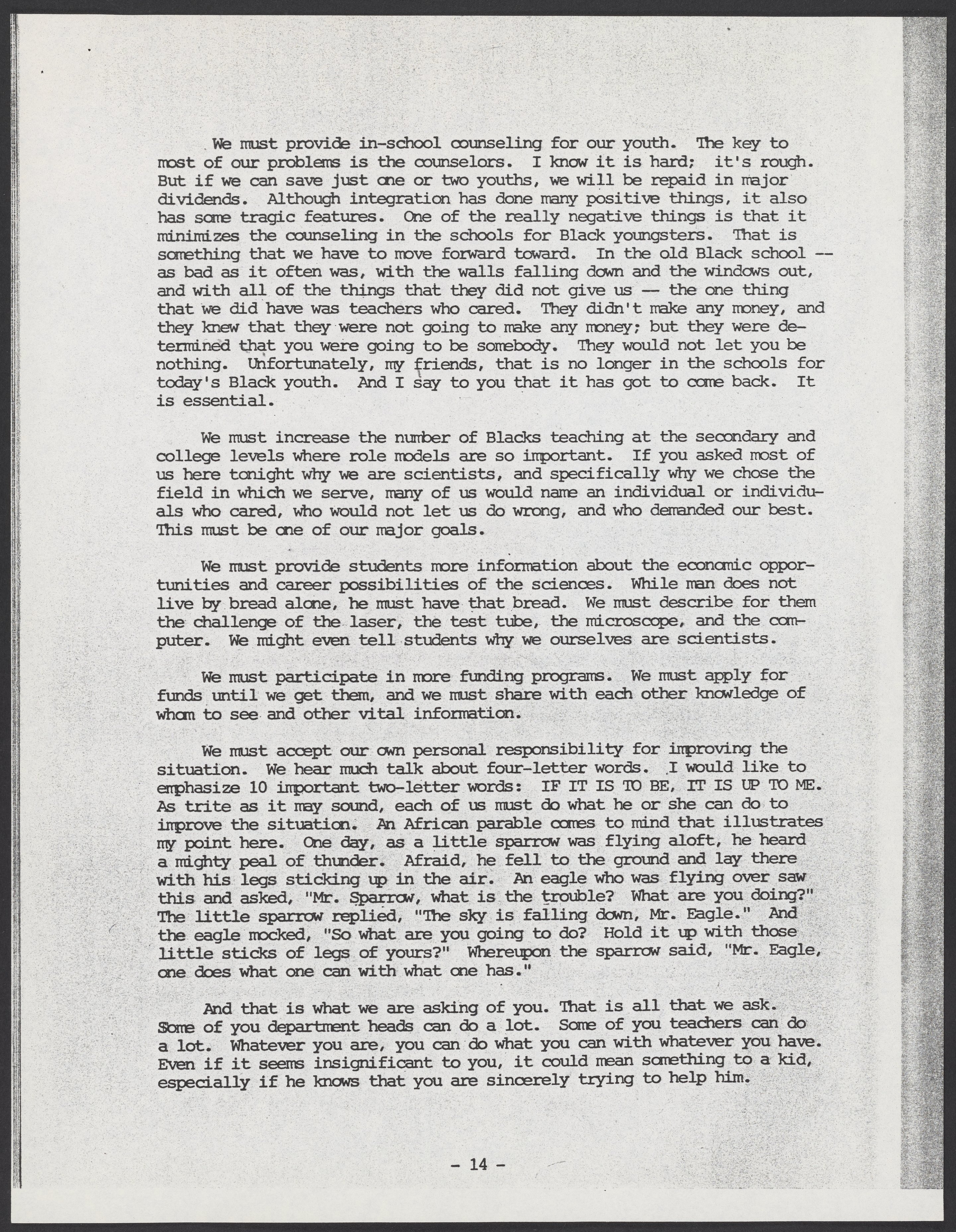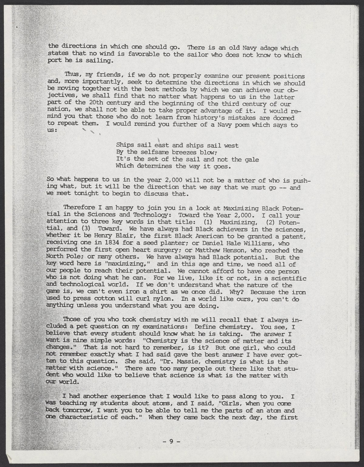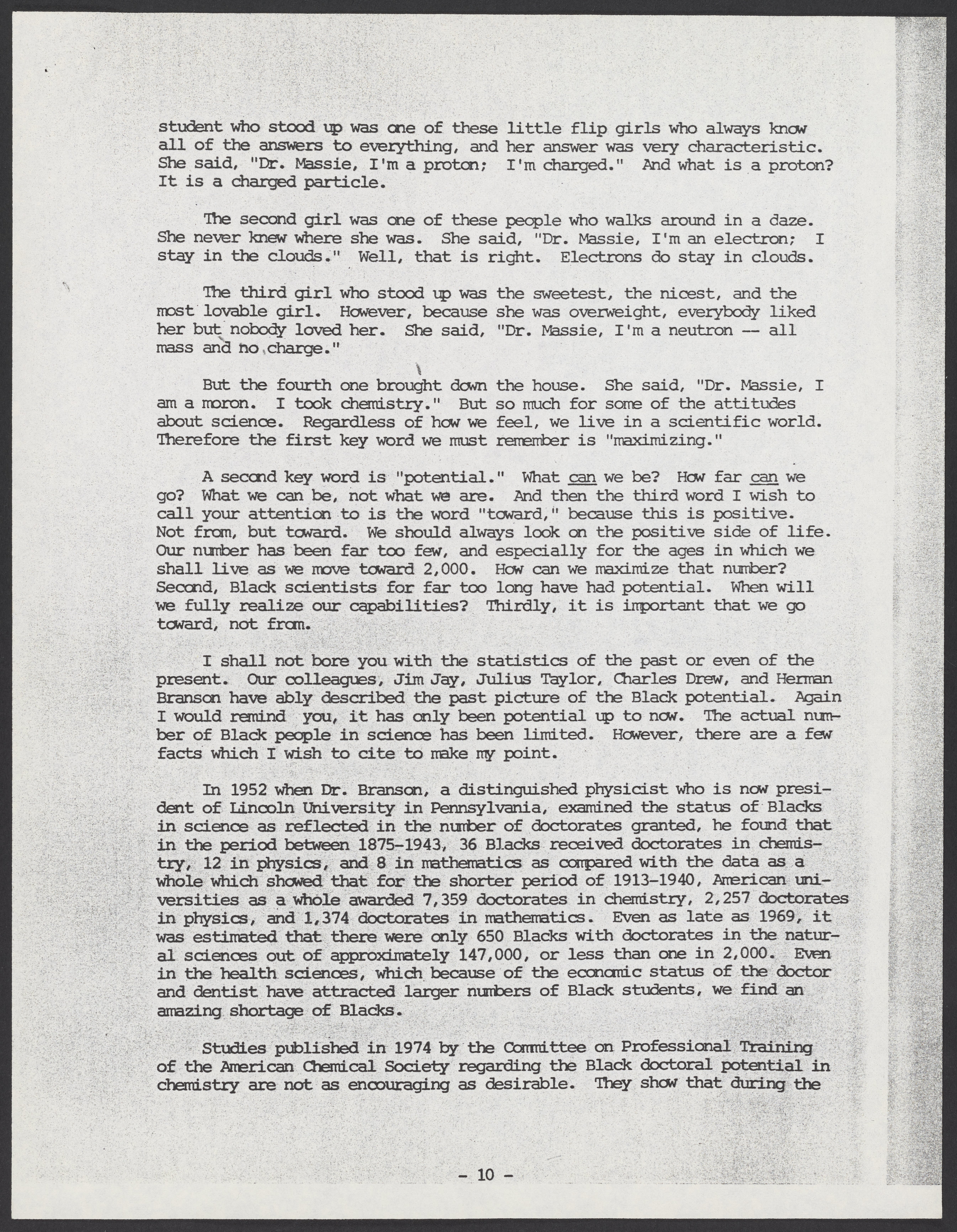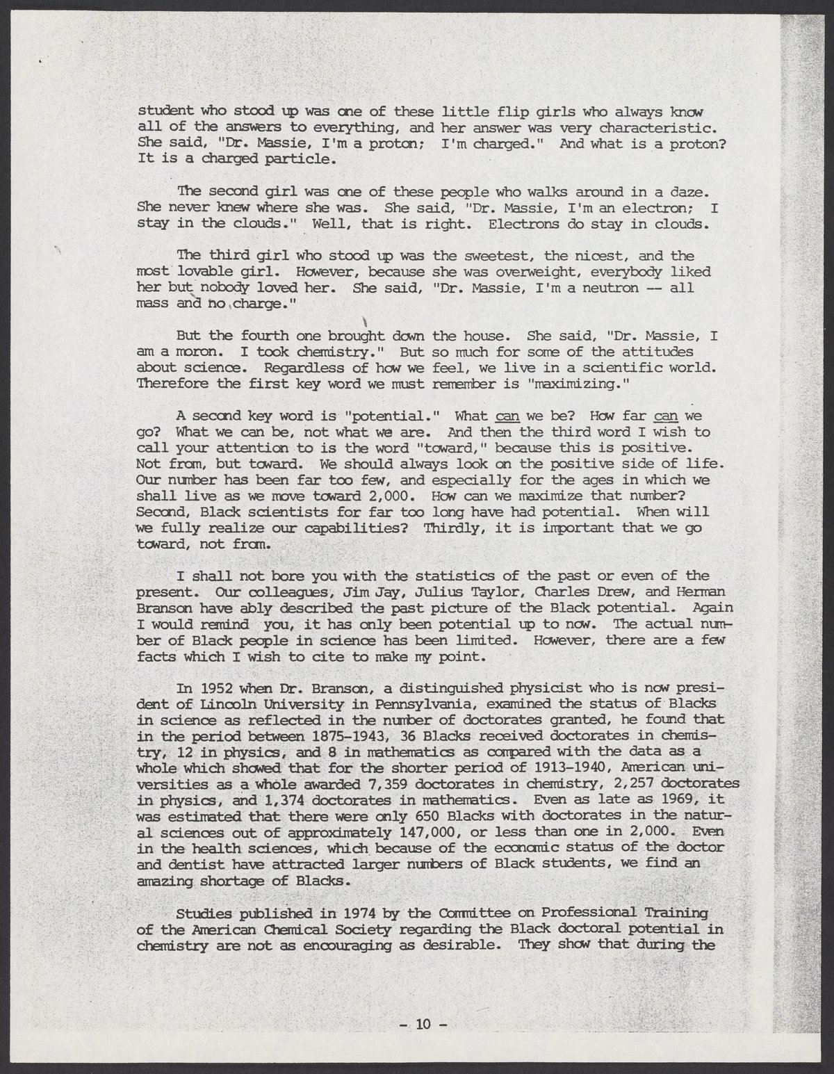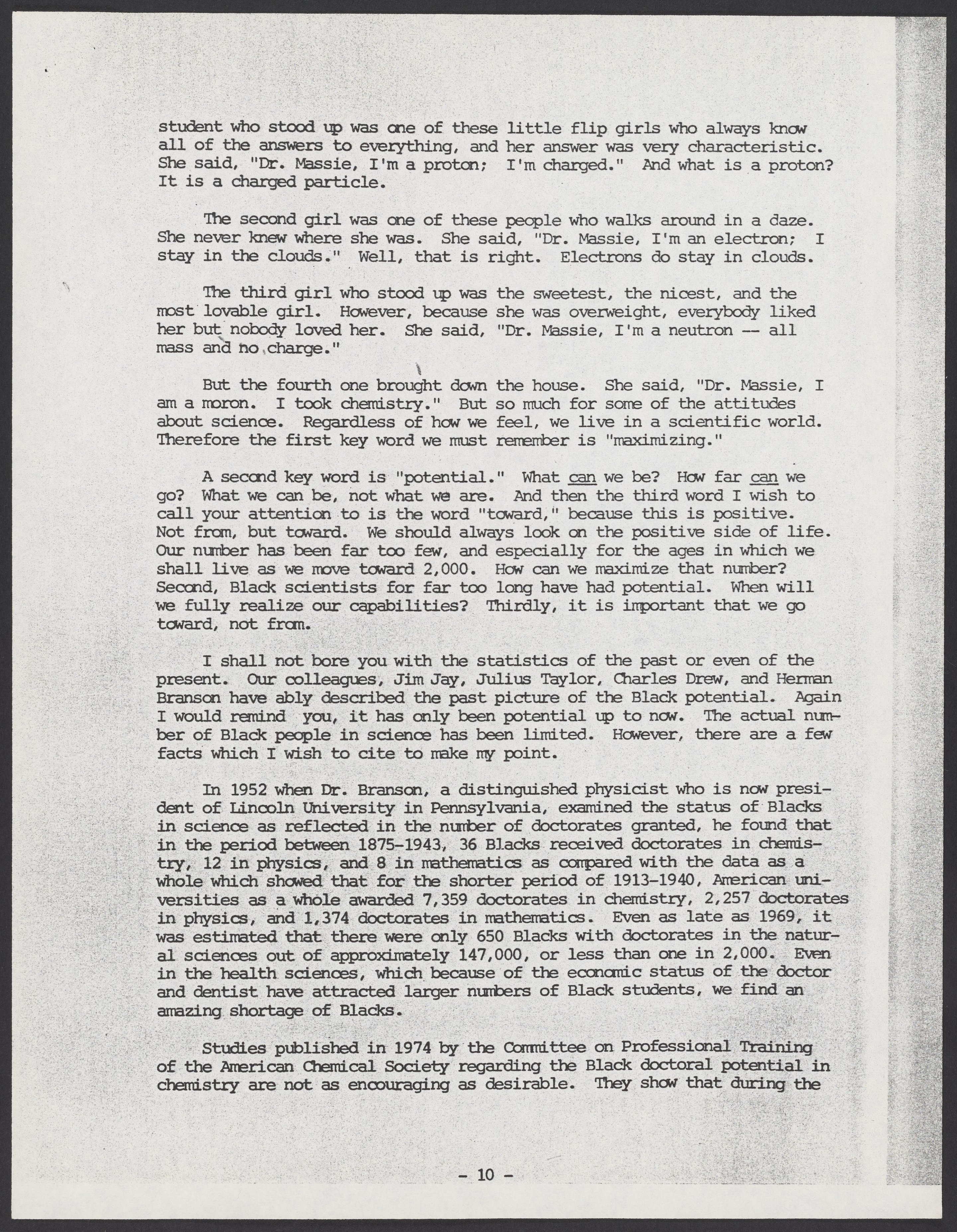 Massie, Samuel. “Maximizing Black Potential in Science & Technology: Toward the Year 2,000,” November 1975. William A. Lester, Jr. Papers, Box 26, Folder 5. Science History Institute. Philadelphia. https://digital.sciencehistory.org/works/6tnx5zk.