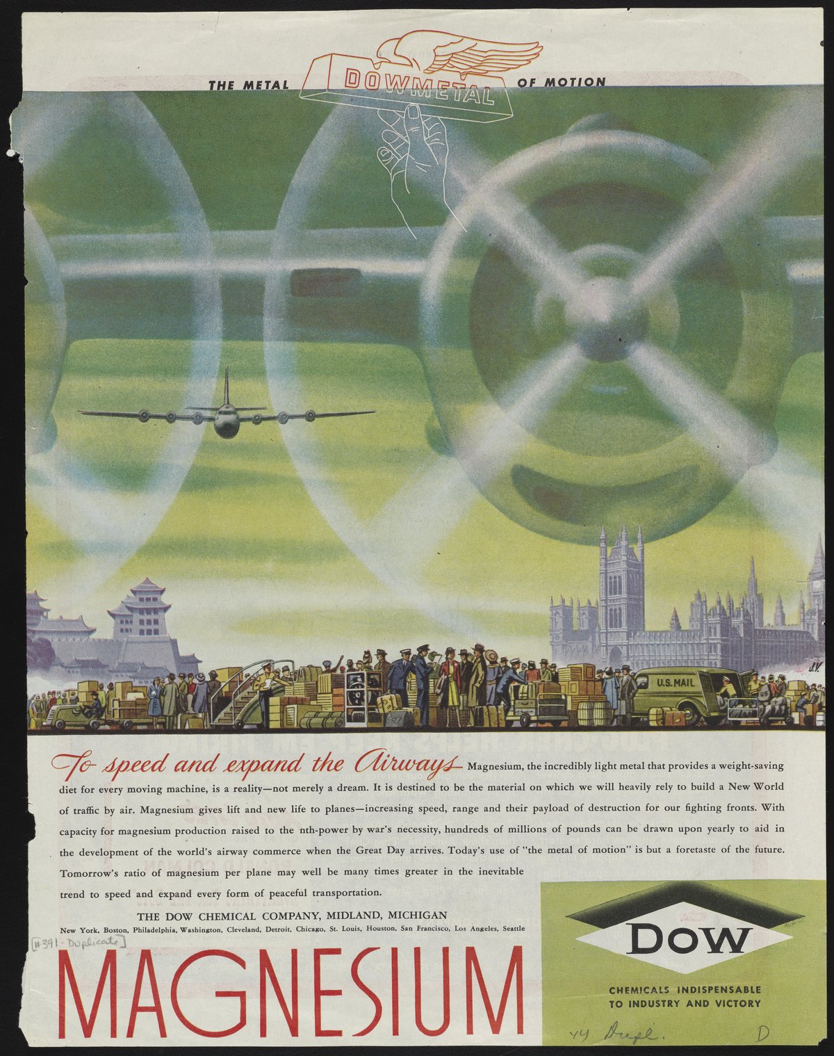 “To Speed and Expand the Airways...,” circa 1944. Advertisements from the Dow Chemical Historical Collection, Box 8. Science History Institute. Philadelphia. https://digital.sciencehistory.org/works/6u5w3ig.