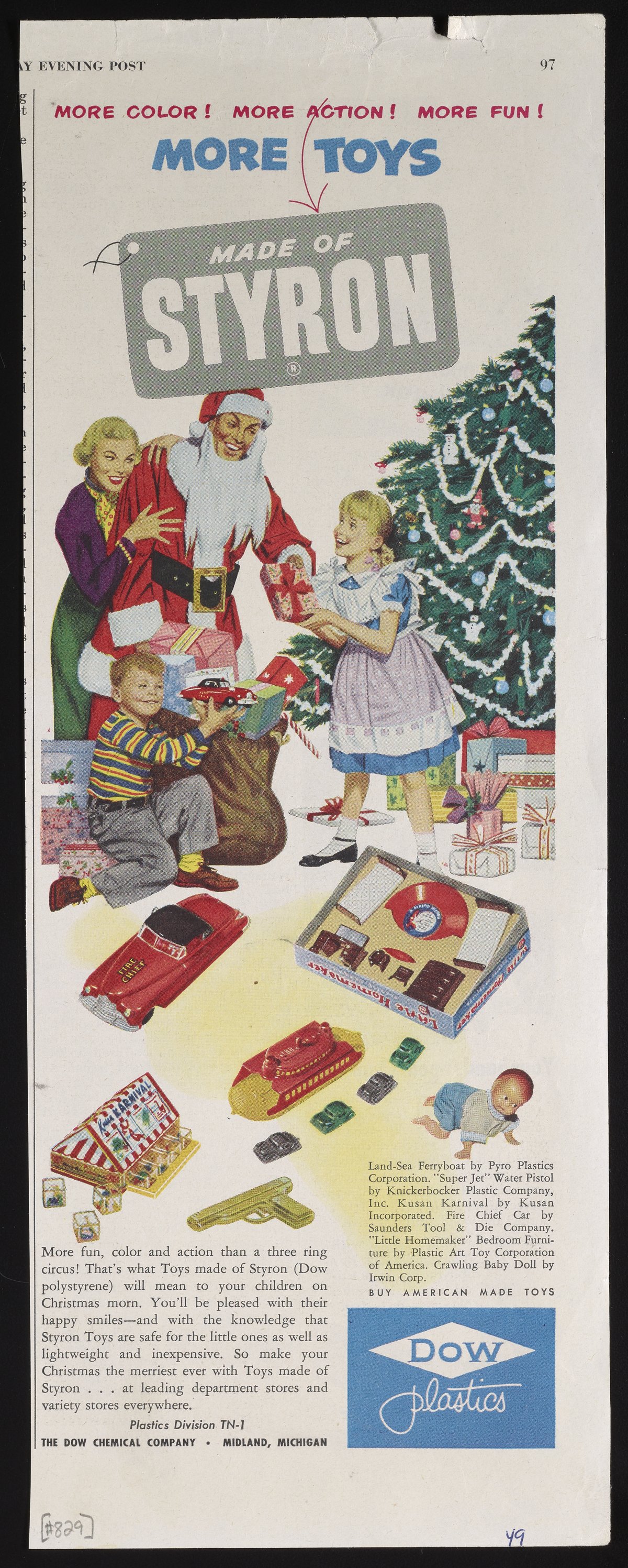 Dow Chemical Company. “More Color! More Action! More Fun! More Toys Made of Styron,” 1949. Advertisements from the Dow Chemical Historical Collection, Box 9. Science History Institute. Philadelphia. https://digital.sciencehistory.org/works/6uhgmy6.