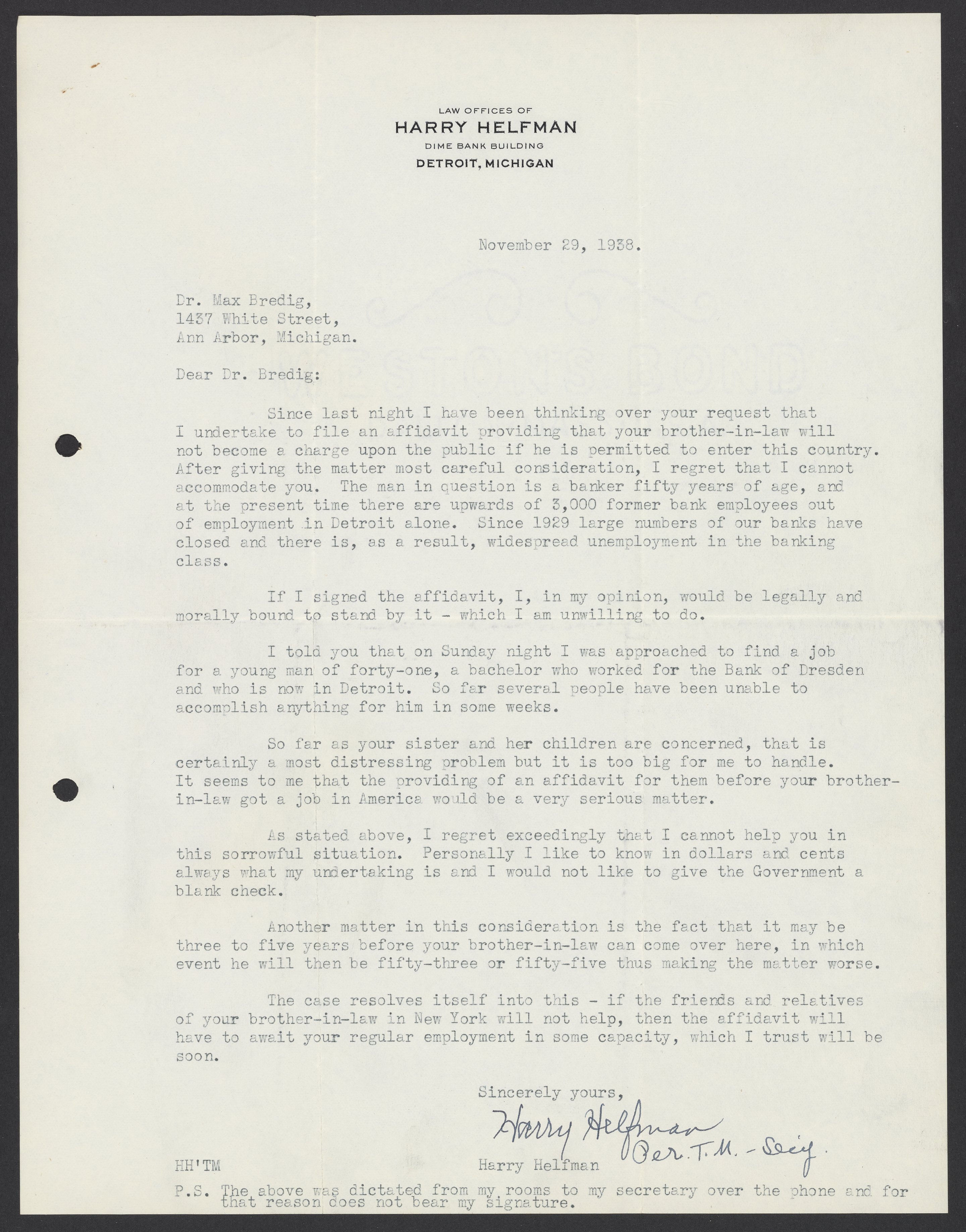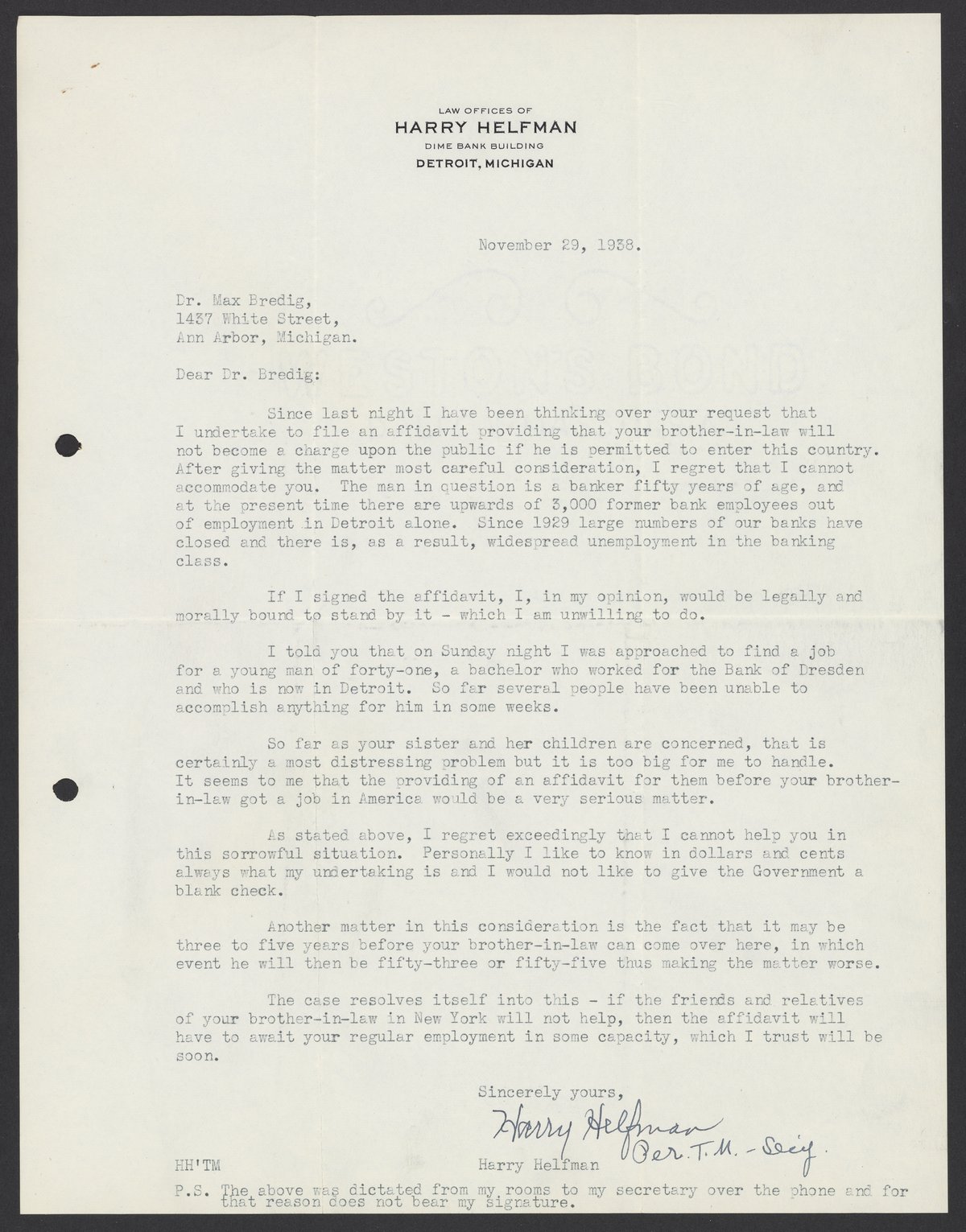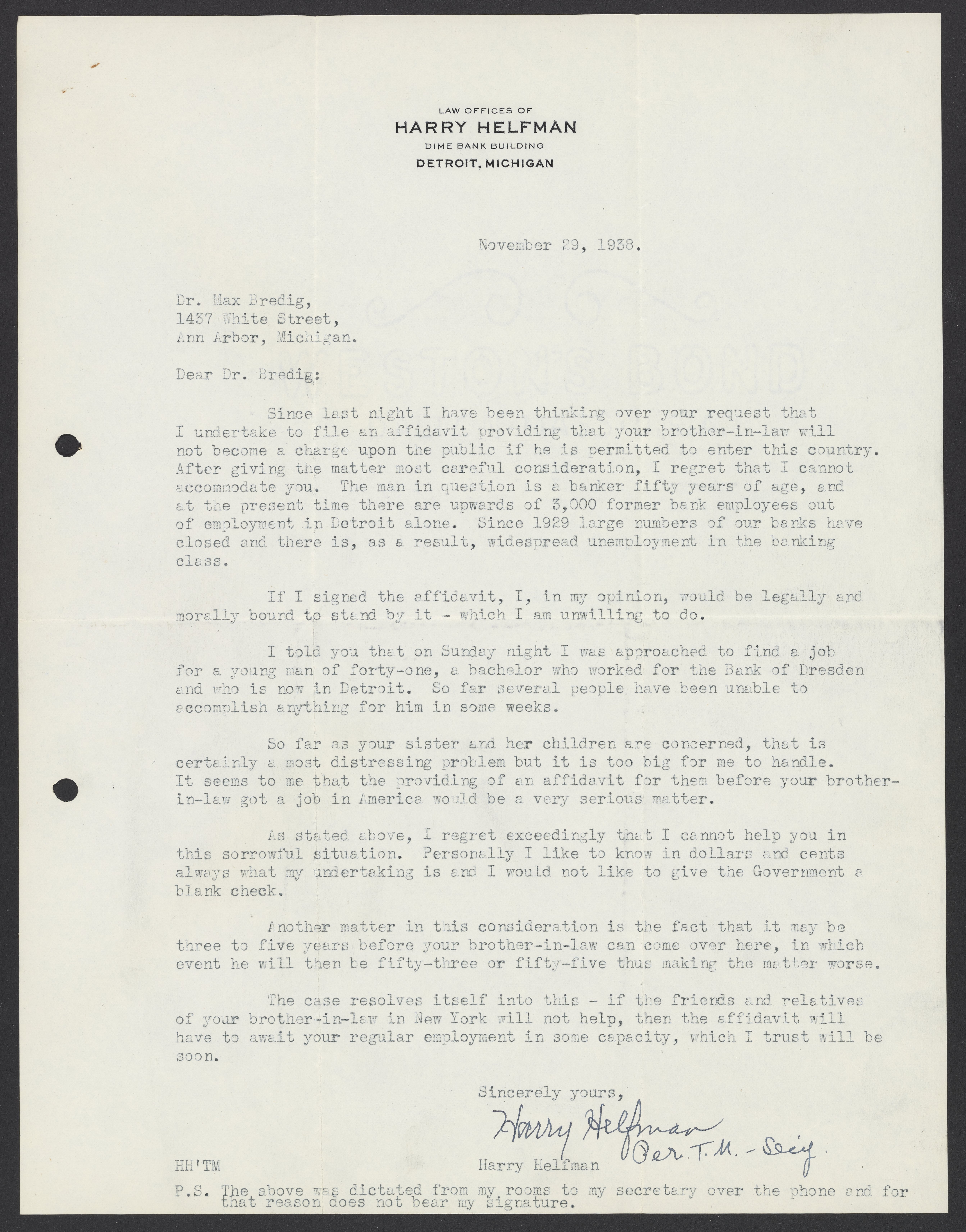 Harry Helfman, a Michigan lawyer, regrets to inform Max Bredig (1902-1977) that he cannot accommodate his request to sign an affidavit for Bredig's brother-in-law, Viktor Homburger (1888-1968). Helfman states that he cannot take on responsibility for Homburger, as he is not convinced Homburger will be able to find work in the United States. Helfman suggests that the affidavit may have to wait until Bredig is regularly employed.