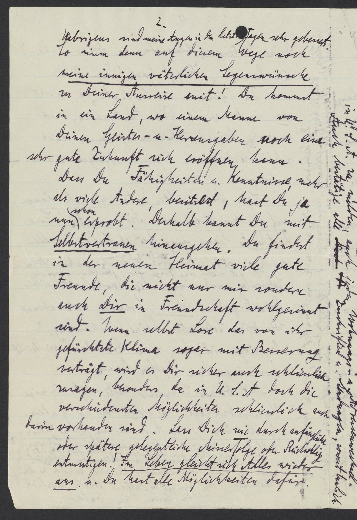 Uebrigens sind meine Augen in den letzten Tagen sehr gebessert. So nimm denn auf diesem Wege noch meine innigsten väterlichen Segenswünsche zu Deiner Ausreise mit! Du kommst in ein Land, wo einem Manne von Deinen Geistes- u. Herzensgaben noch eine sehr gute Zukunft sich eröffnen kann.