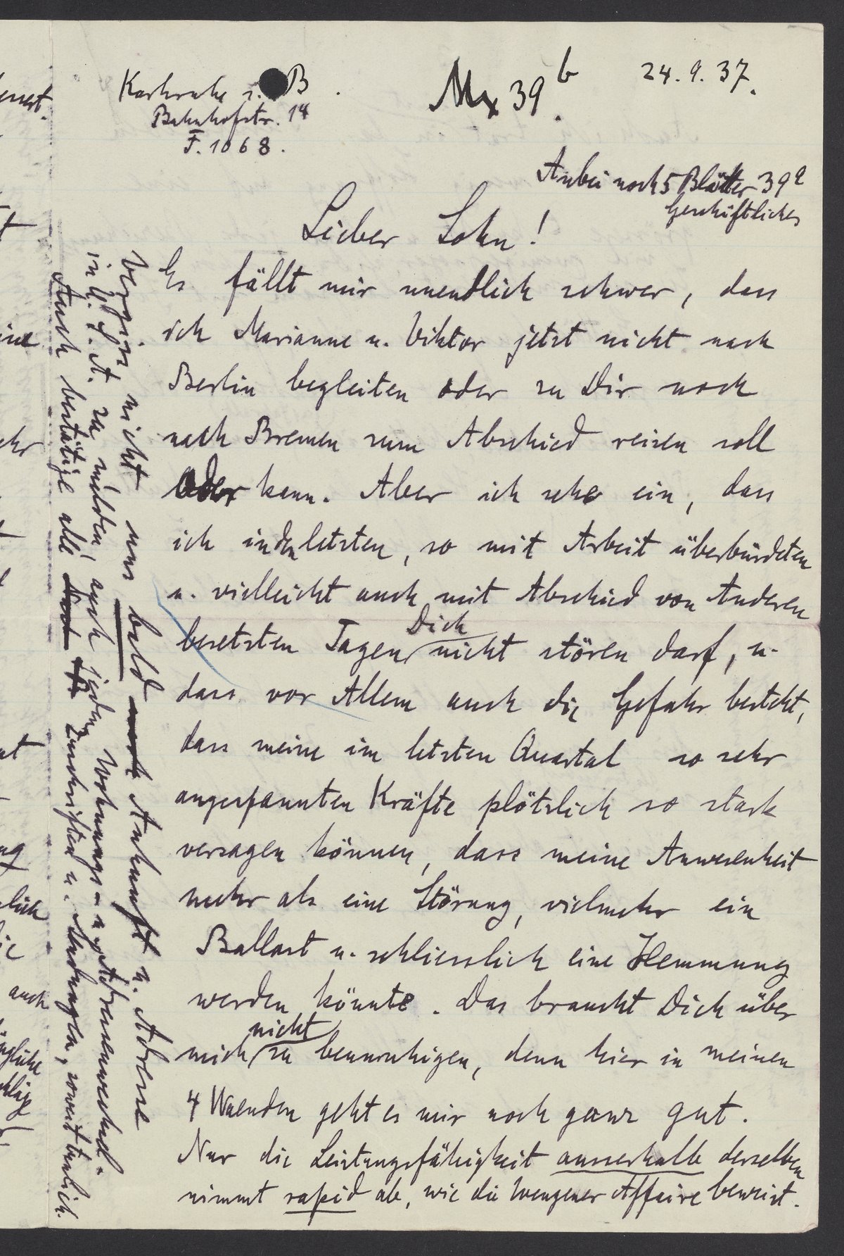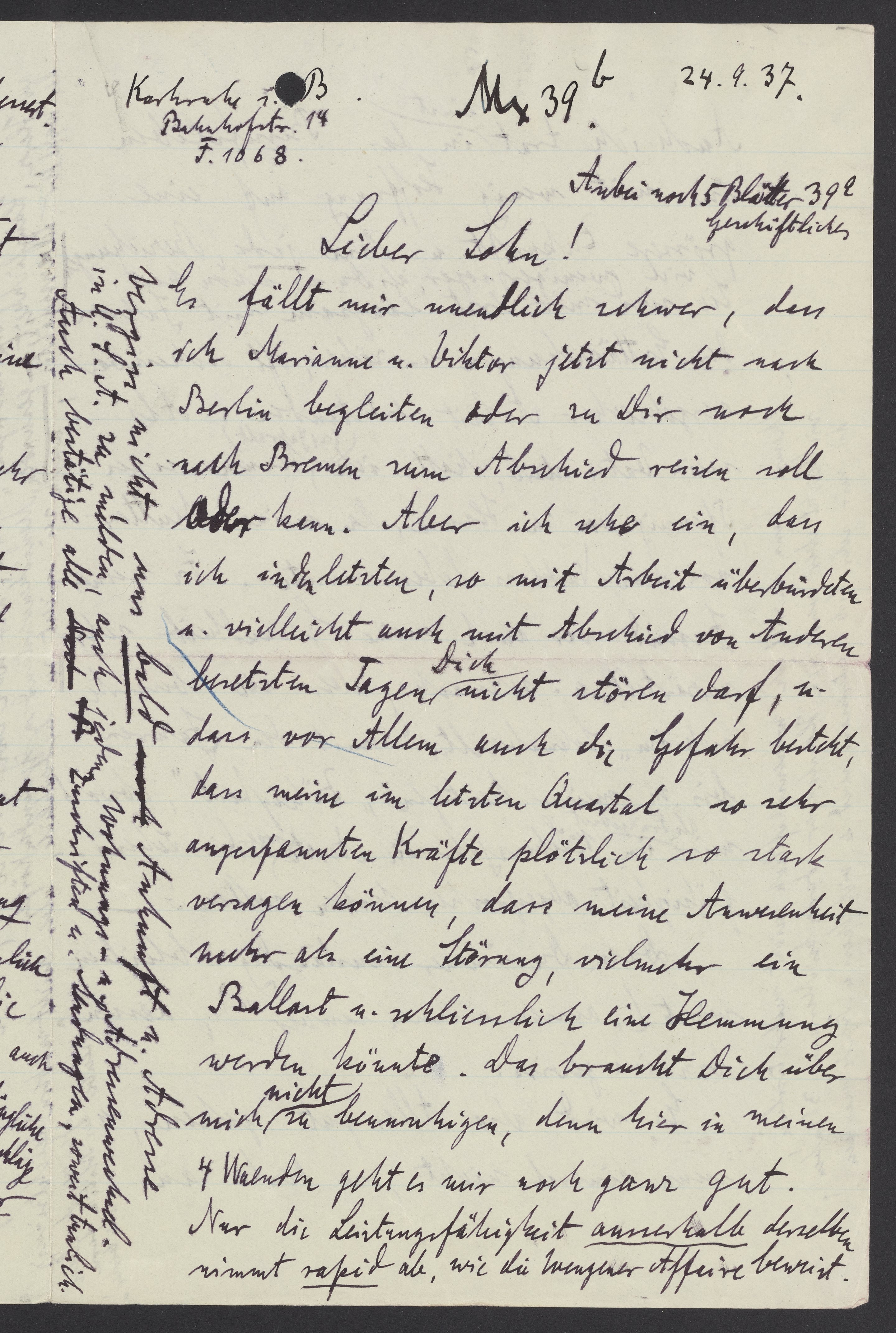 Es fällt mir undendlich schwer, dass ich Marianne u. Viktor jetzt nicht nach Berlin begleiten oder zu Dir noch nach Bremen zum Abschied reisen soll oder kann. Aber ich sehe ein, dass ich in den letzten, so mit Arbeit überbürdeten u. vielleicht auch mit Abschied von Anderen besetzten Tagen Dich nicht stören darf, u. dass vor Allem auch die Gefahr besteht, dass meine im letzten Quartal so sehr angespannten Kräfte plötzlich so stark versagen können, dass meine Anwesenheit mehr als eine Störung, vielmehr ein Ballast u. schliesslich eine Hemmung werden könnte. Das brauchst Dich über micht nicht zu beunruhigen, denn hier in meinen 4 Wänden geht es mir noch ganz gut. Nur die Leistungsfähigkeit ausserhalb derselben nimmt rapid ab, wie die Wegener Affaire beweist.