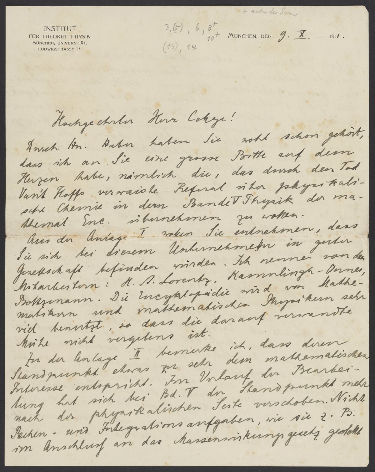 Durch Hn. Haber haben Sie wohl schon gehört, dass ich an Sie eine grosse Bitte auf dem Herzen habe, nämlich die , das durch den Tod Van’t Hoffs verwaiste Referat über physikalische Chemie in dem Bande V Physik der mathemat. Enc. übernehmen zu wollen.