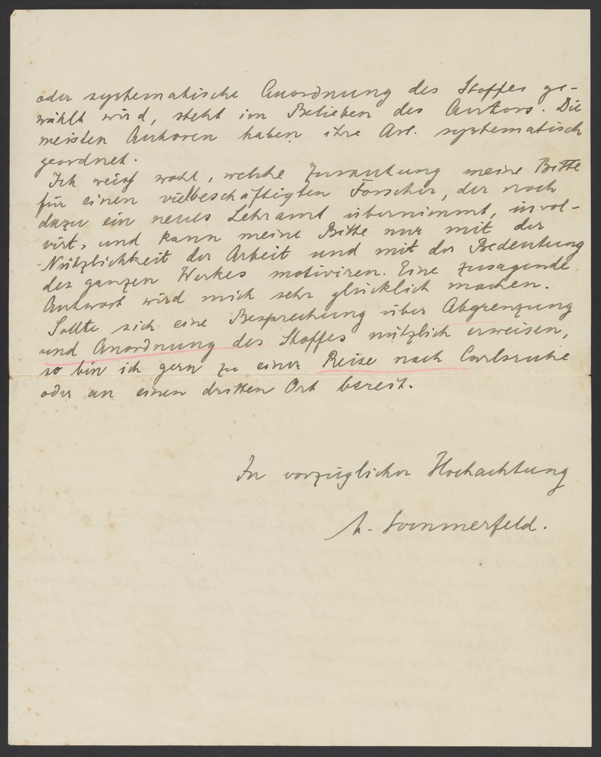 Sollte sich eine Besprechung über Abgrenzung und Anordnung des Stoffes nicht erweisen, so bin ich ganz zur einer Reise nach Carlsruhe oder an einem dritten Ort bereit.