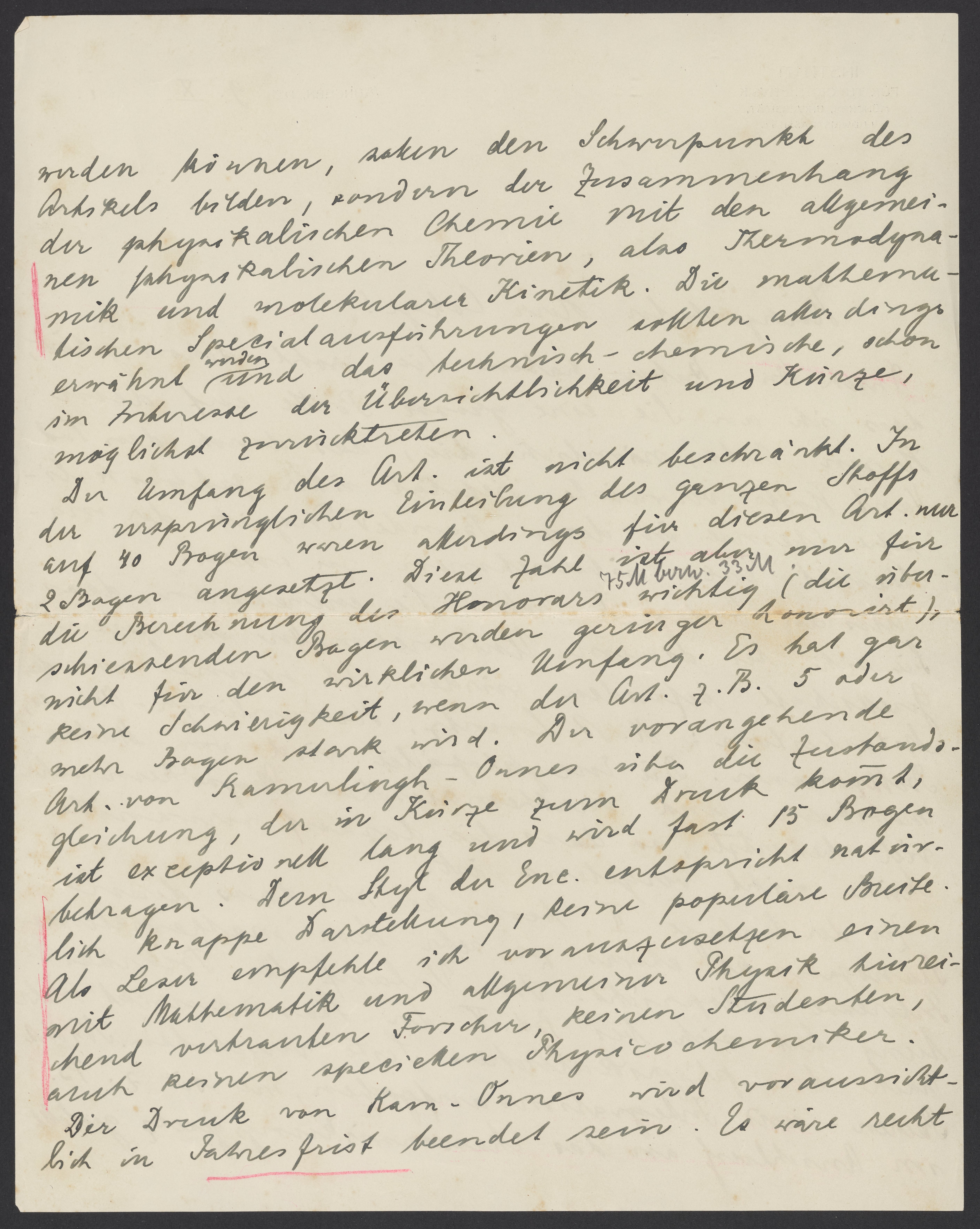 Der Umfang des Art. ist nicht beschränkt. In der ursprünglichen Einleitung des ganzen Stoffs auf 40 Bogen waren allerdings für diesen Art. nur 2 Bogen angesetzt. Diese Zahl ist aber nur für die Berechnung des Honorars wichtig (die überschießenden Bogenwurden geringer honoriert), nicht für den wirklichen Umfang. Es hat gar keine Schwierigkeit, wenn der Art. z.B. 5 oder mehr Bogen stark wird. Der vorangehende Art. von Kammerlingh-Onnes ist die Zustandsgleichung, der in Kürze zum Druck kommt, ist exceptionell lang und wird fast 15 Bogen betragen. Dem Styl der Enc. entspricht natürlich knappe Darstellung, seine populäre Breite. Also Leser empfehle ich vor auszusetzen einen mit Mathematik und allgemeiner Physik hinreichend vertrauten Forscher, keinen Studenten, auch keinen speciellen Physicochemiker.