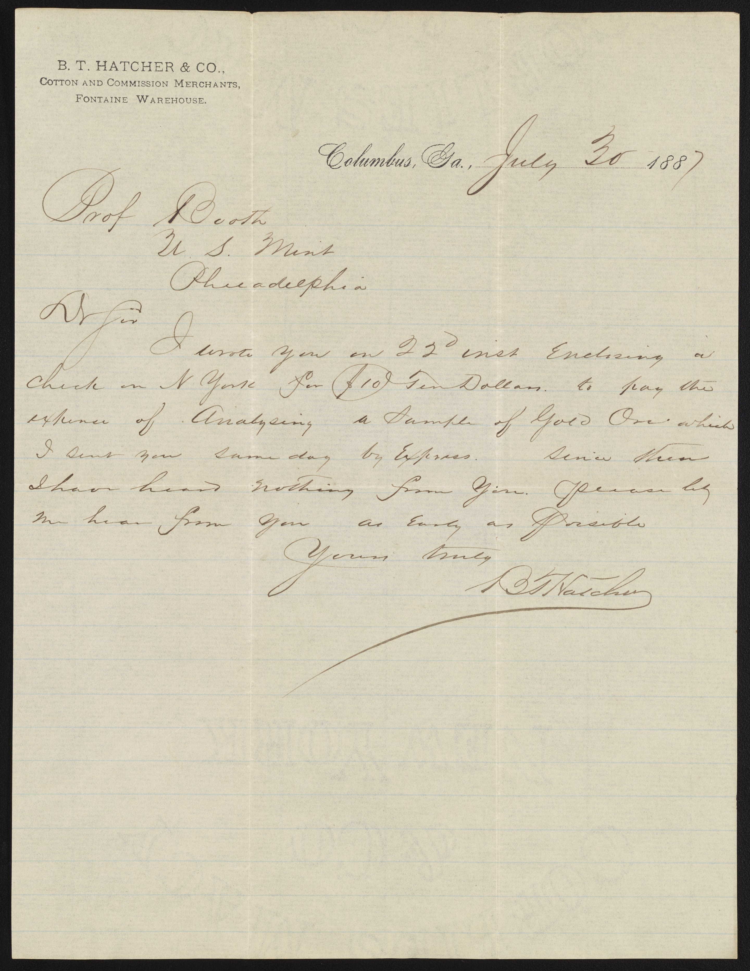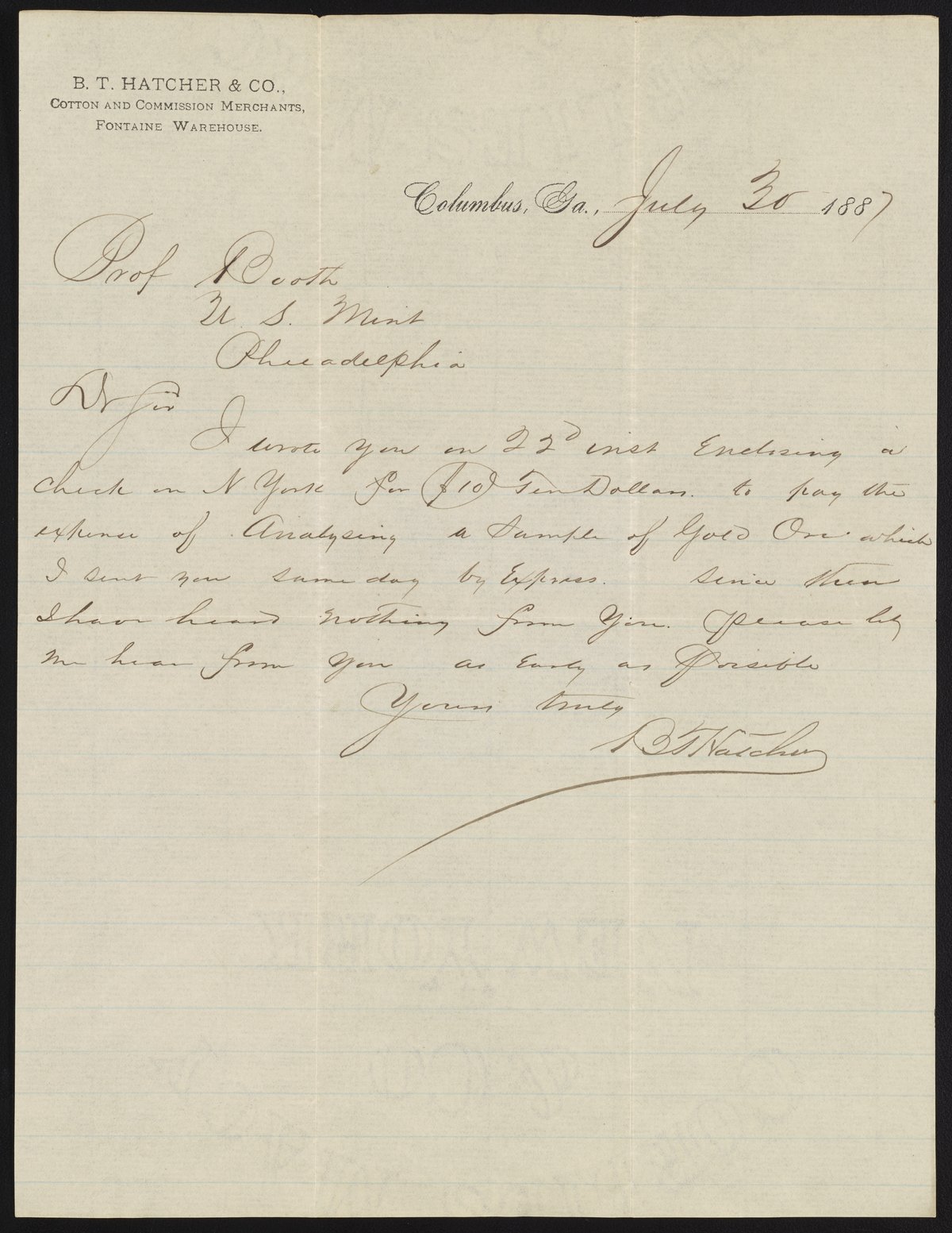 Letter from B.T. Hatcher & Co. to James Curtis Booth, July 30, 1887