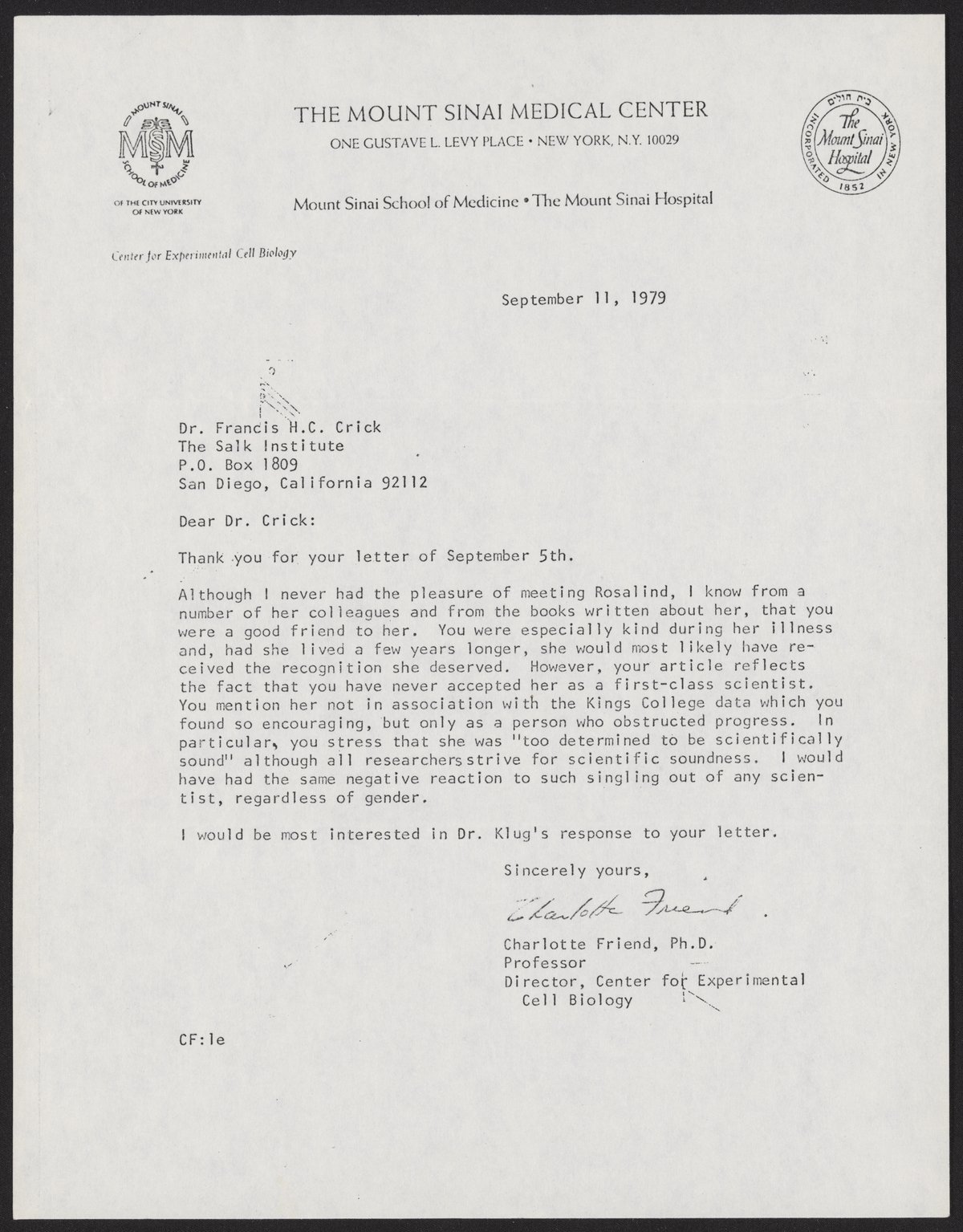 Letter from Charlotte Friend to Francis Crick, September 11, 1979