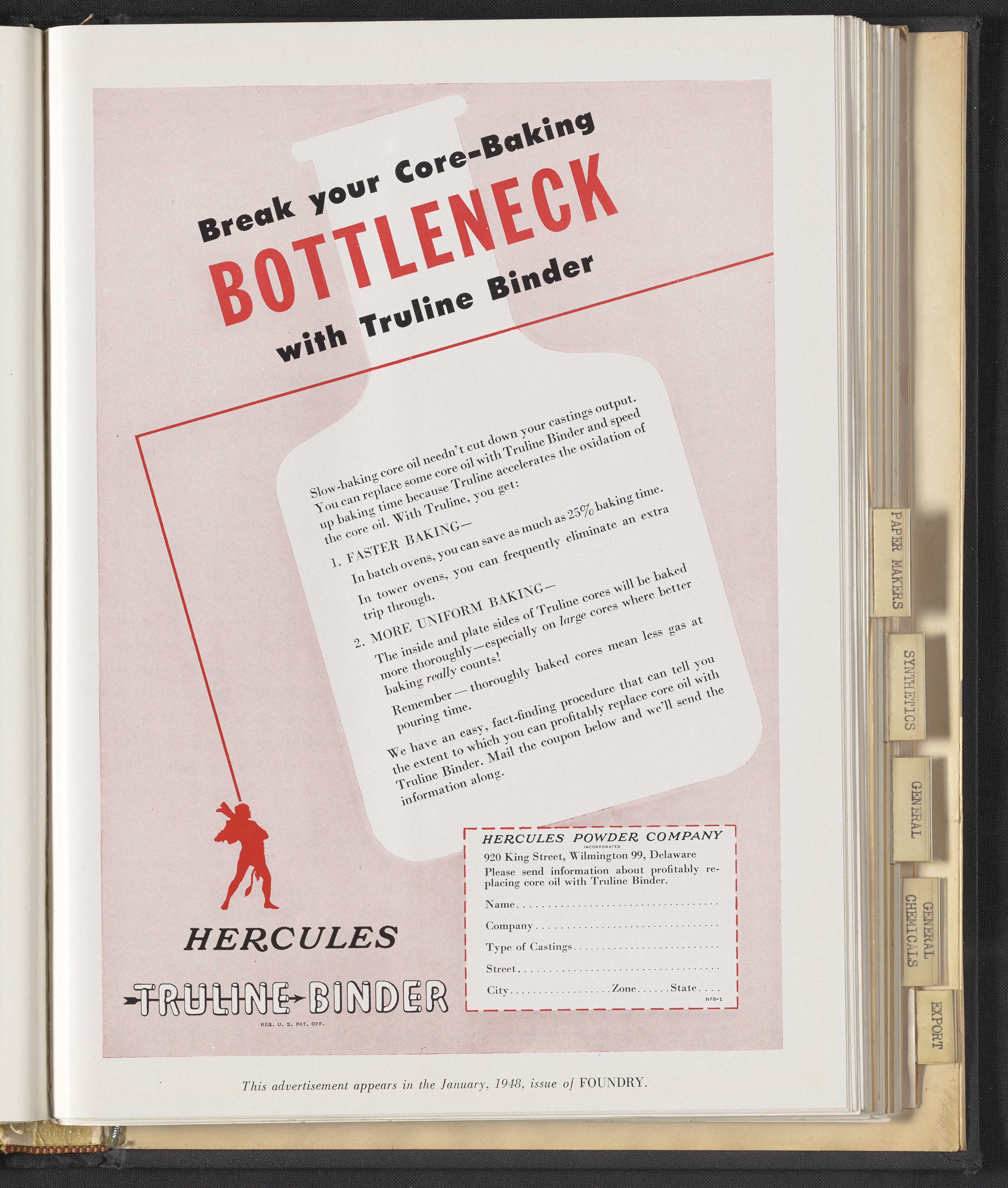 Hercules Incorporated. “Break Your Core-Baking Bottleneck with Truline Binder.” 1948 Hercules Advertisements, 1948. Records of Hercules Incorporated, Volume 1948. Science History Institute. Philadelphia. https://digital.sciencehistory.org/works/6w924c714.