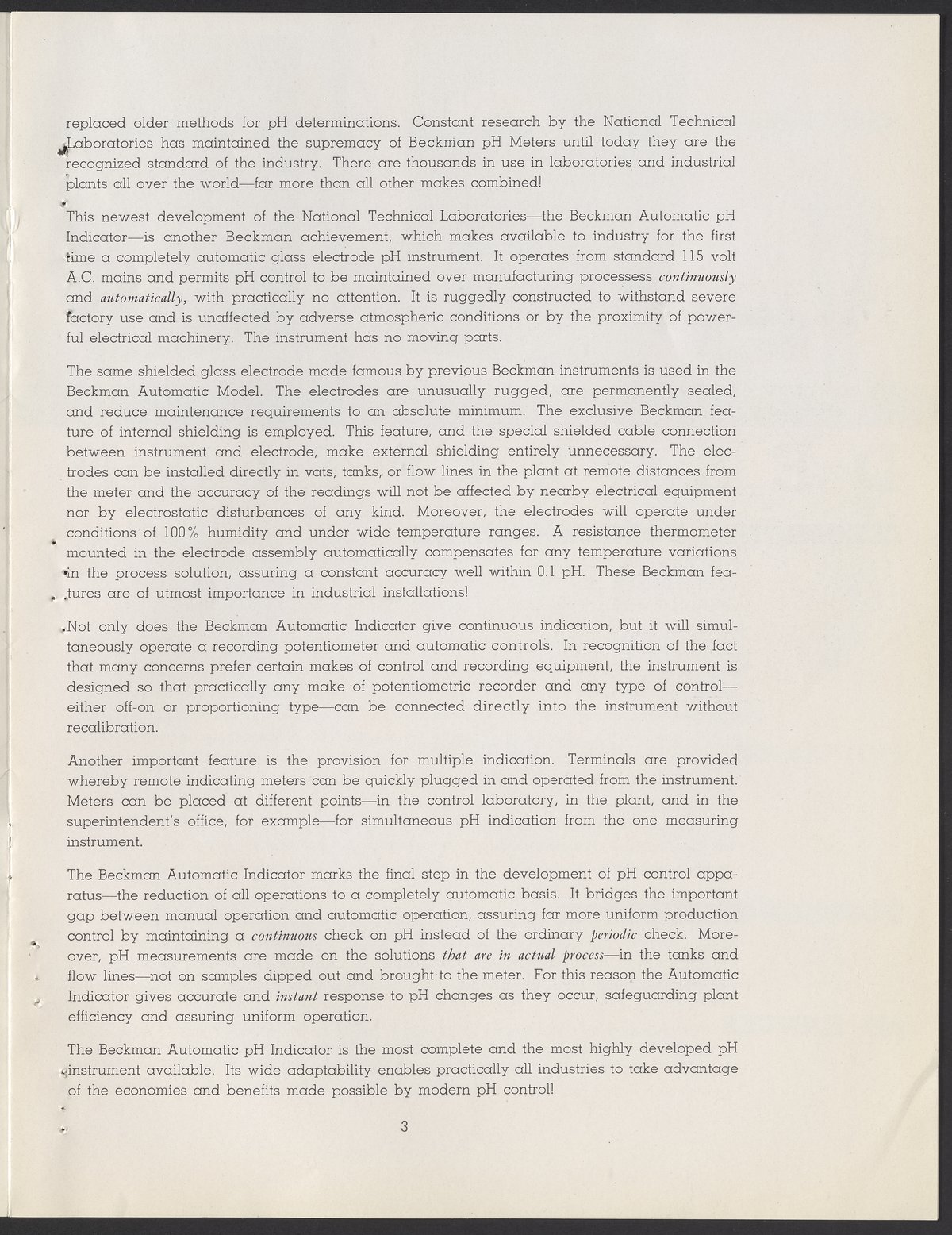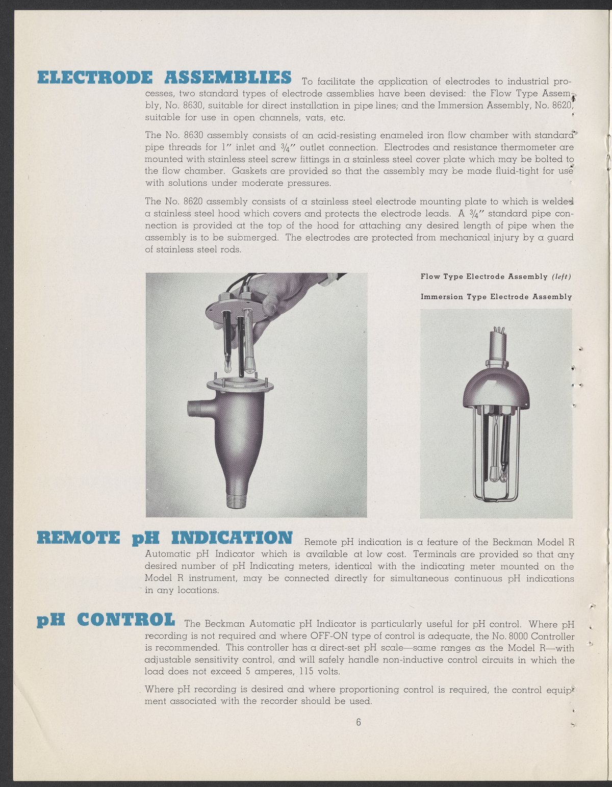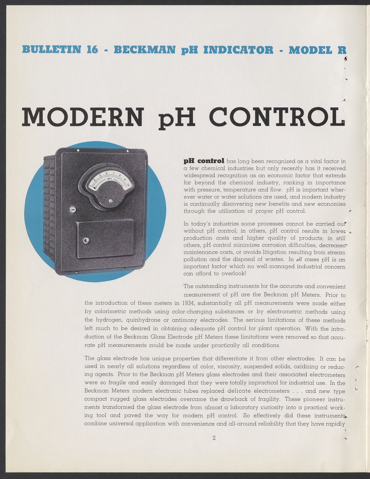 Beckman Instruments, Inc. “The Beckman PH Indicator for Continuous Measurement of PH with the Glass Electrode,” 1939. Beckman Historical Collection, Box 20, Folder 2. Science History Institute. Philadelphia. https://digital.sciencehistory.org/works/6w924c74z.