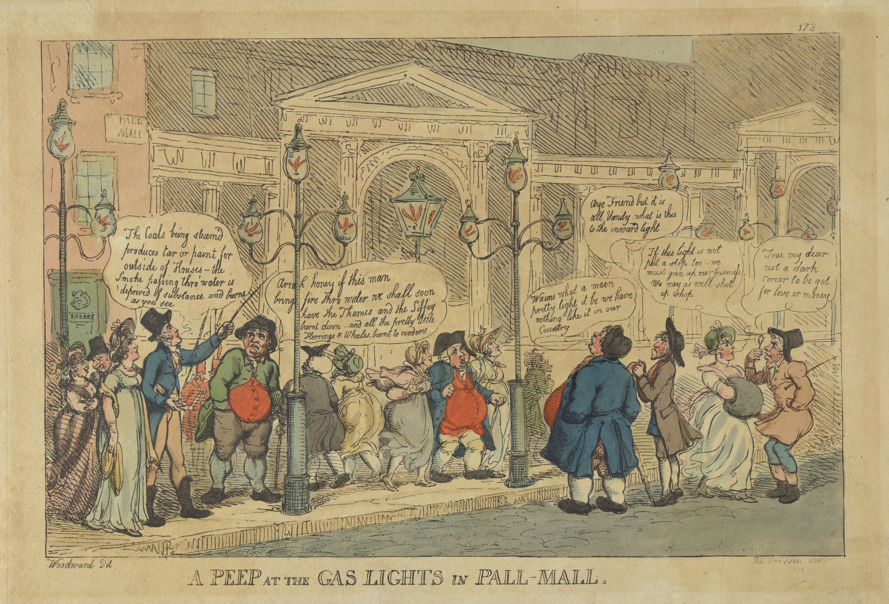 This hand-colored etching by Thomas Rowlandson was produced based on a drawing by G. M. Woodward. It portrays a London street scene of citizens commenting on, and in some instances complaining about, the wonders of new gas street lighting.
