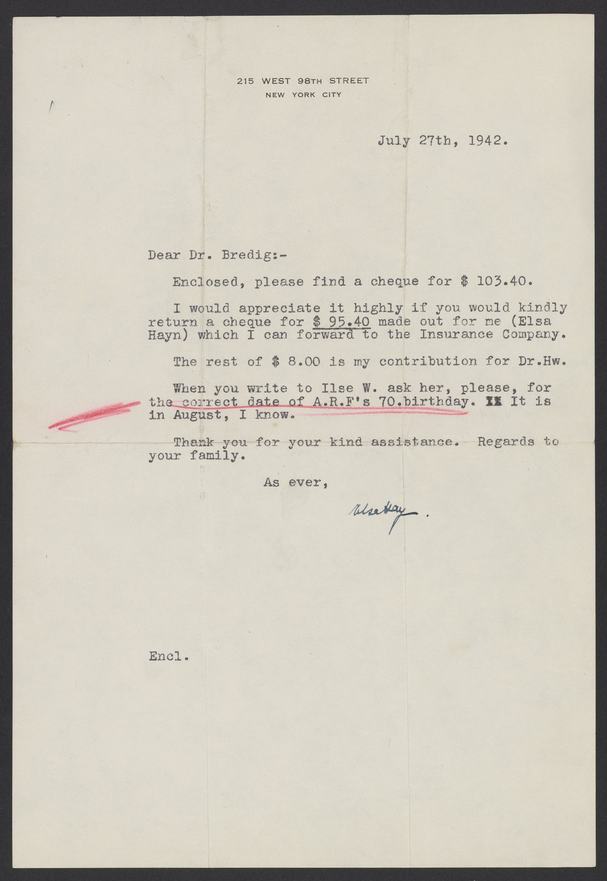 Letter from Ilse Hayn to Max Bredig, July 27, 1942