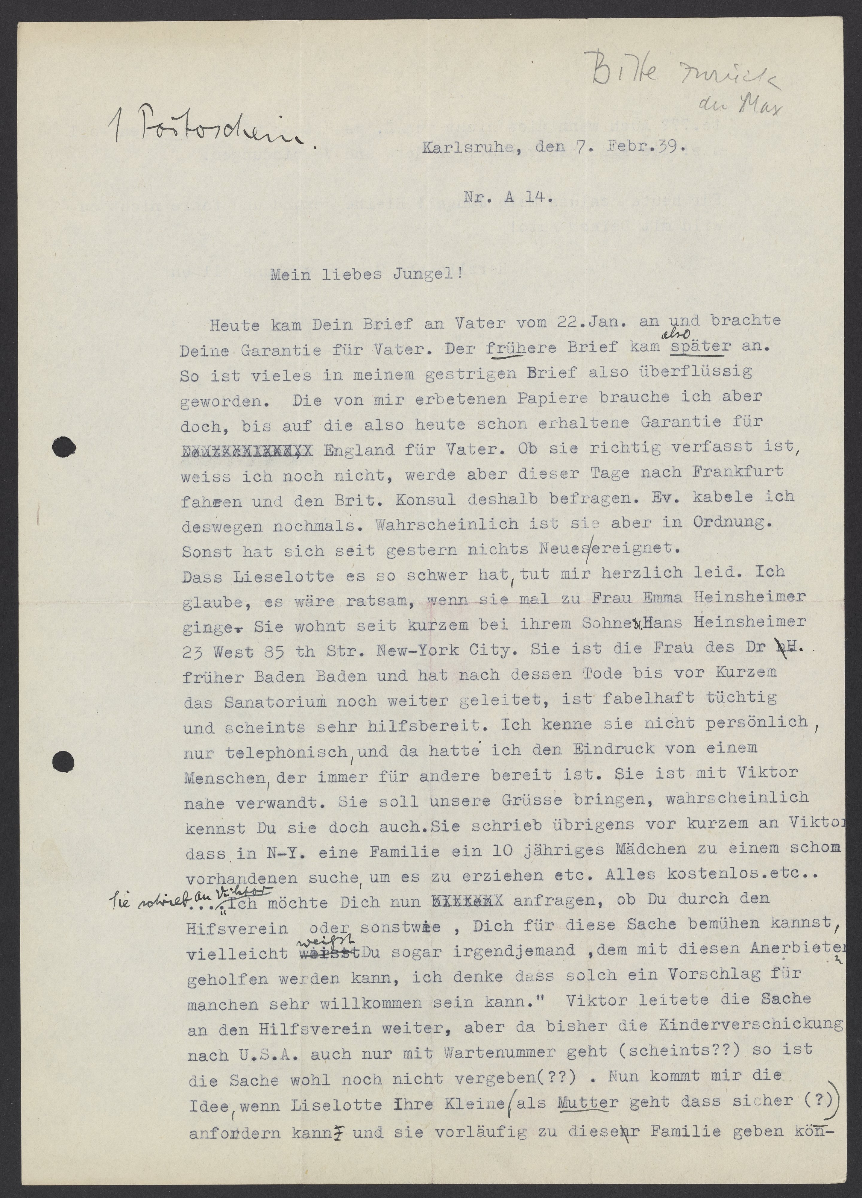 Dass Lieselotte es so schwer hat, tut mir herzlich leid. Ich glaube, es wäre ratsam, wenn sie mal zu Frau Emma Heinsheimer 23 West 85th Str. New York City. Sie ist die Frau des Dr. H. früher Baden Baden und hat nach dessen Tode bis vor Kurzem das Sanatorium noch weiter geleitet, ist fabelhaft tüchtig und scheint sehr hilfsbereit. Ich kenne sie nicht persönlich, nur telephonisch, und da hatte ich den Eindruck von einem Menschen, der immer für andere bereit ist. Sie ist mit Viktor nahe verwandt. Sie solle unsere Grüße bringen, wahrscheinlich kennst Du sie doch auch. Sie schrieb übrigens vor kurzem an Viktor, dass in N-Y. eine Familie ein 10-jahriges Mädchen zu einem schon vorhandenen suche, um es zu erziehen etc. Alles kostenlos etc…