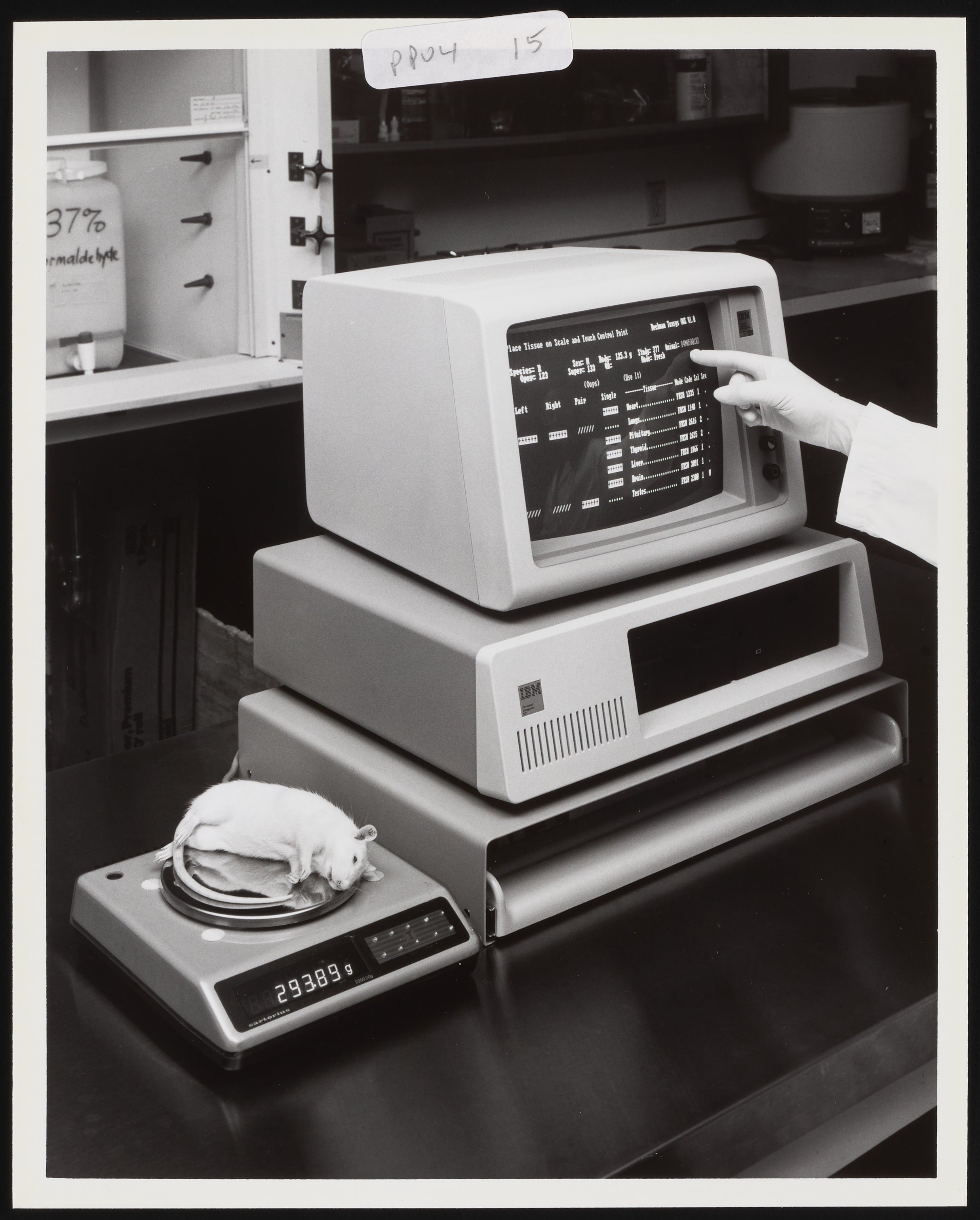 “Laboratory Animal Weighing Station with Beckman TOXSYS Terminal,” 1978–1984. Beckman Historical Collection, Box 80. Science History Institute. Philadelphia. https://digital.sciencehistory.org/works/707957749.