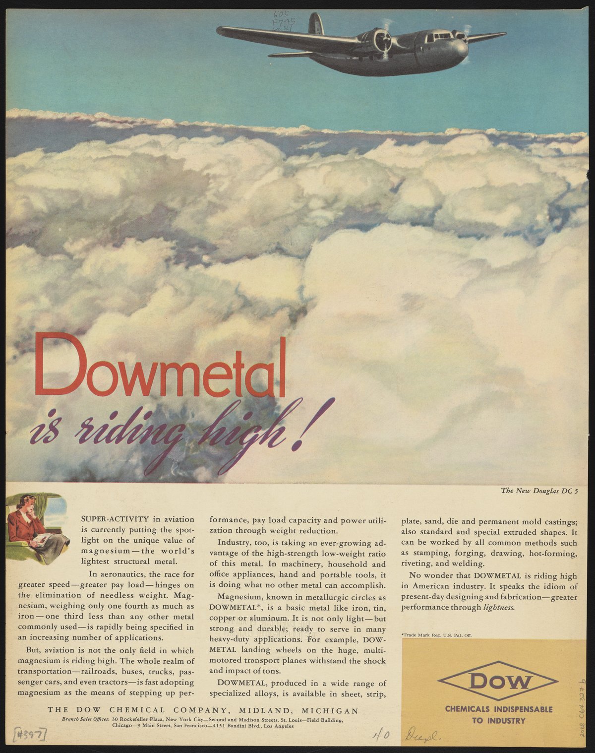 “Dowmetal Is Riding High!,” January 1940. Advertisements from the Dow Chemical Historical Collection, Box 8. Science History Institute. Philadelphia. https://digital.sciencehistory.org/works/70laz27.