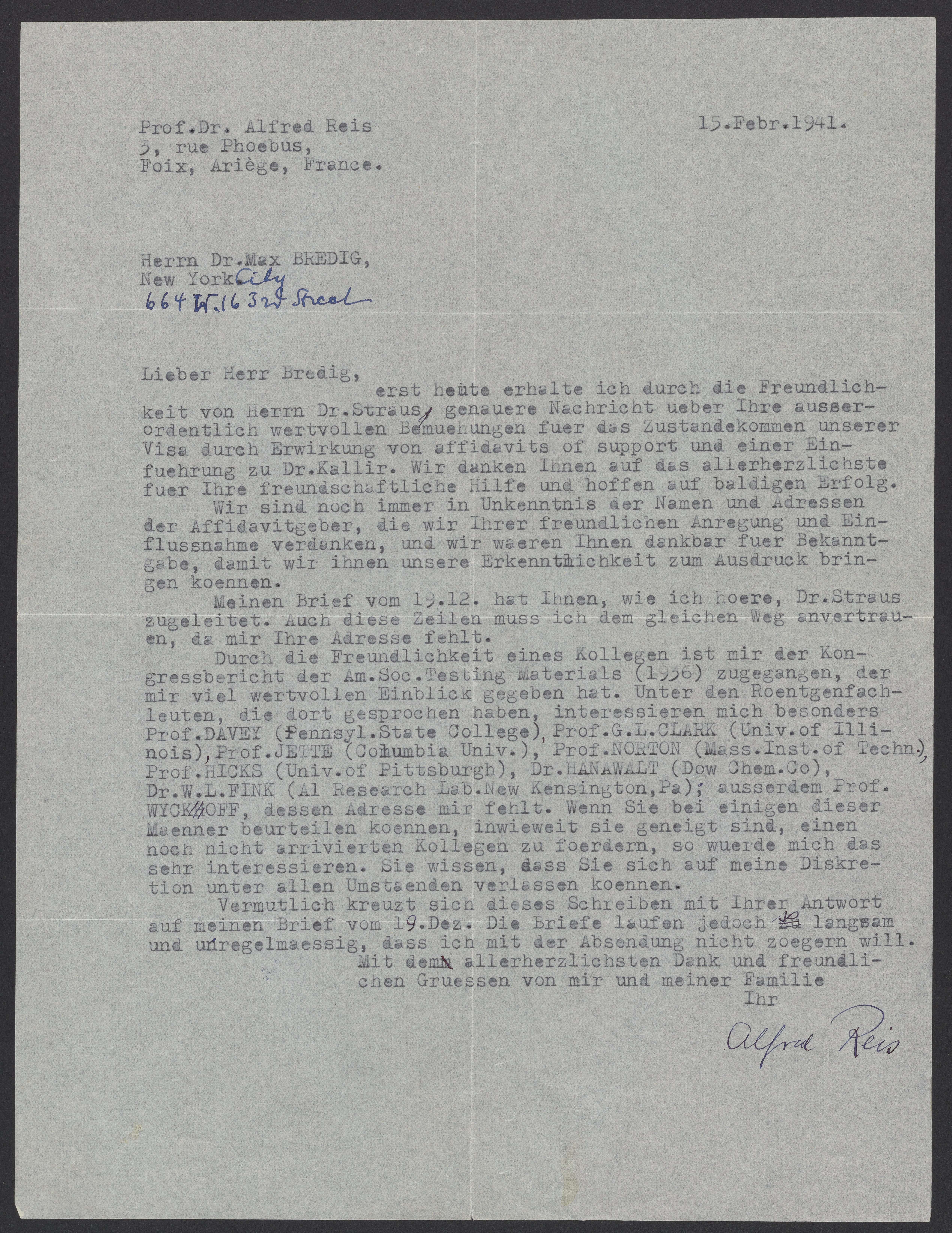 Letter from Alfred Reis to Max Bredig, February 15, 1941