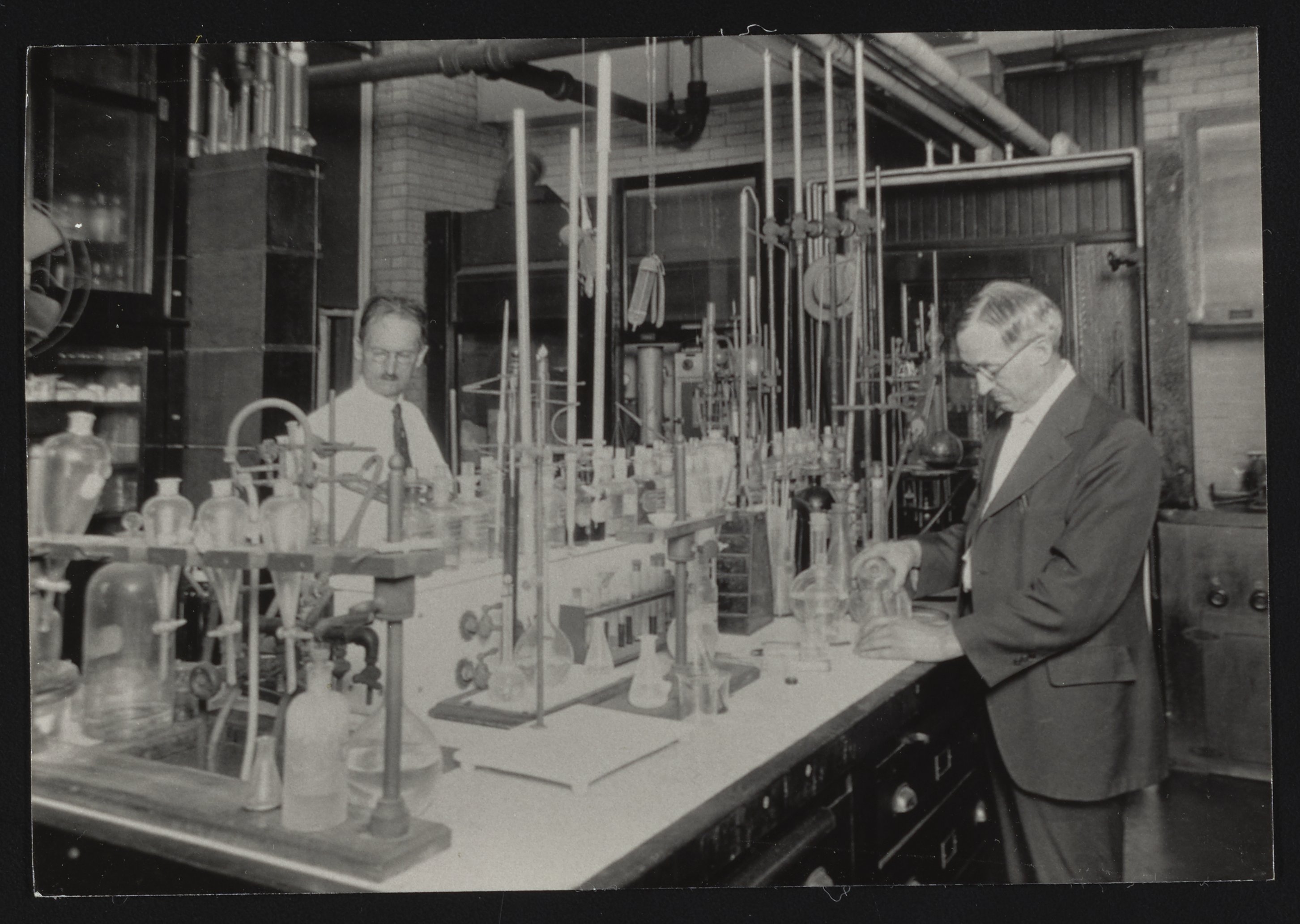 General view of two employees at work in an Agricultural Research Service Drug Laboratory, with view of assorted laboratory glassware and apparatus. Part of the U.S. Department of Agriculture, such laboratories commonly investigated the effects of the adulteration of food and drugs, determined purity standards, and researched methods for the improvement, control, and standardization of manufacturing methods.