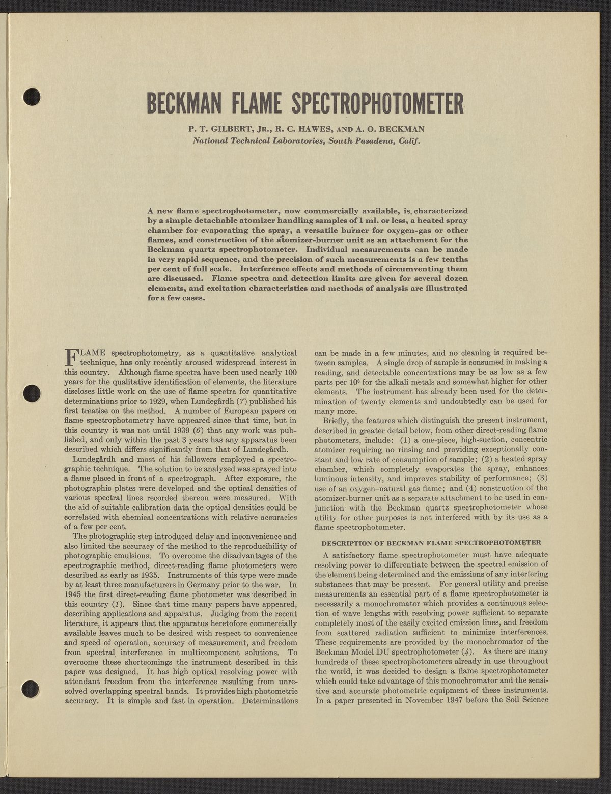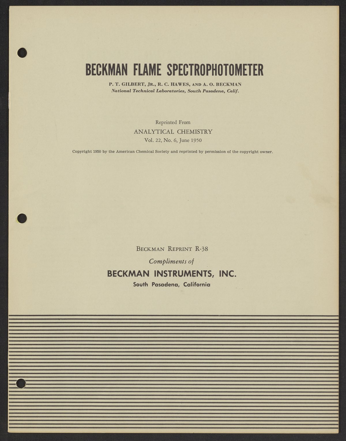 Beckman, Arnold O., R. C. Hawes, and P. T. Gilbert Jr. “Beckman Flame Spectrophotometer.” South Pasadena, California, June 1950. Beckman Historical Collection, Box 17, Folder 14. Science History Institute. Philadelphia. https://digital.sciencehistory.org/works/73666503s.