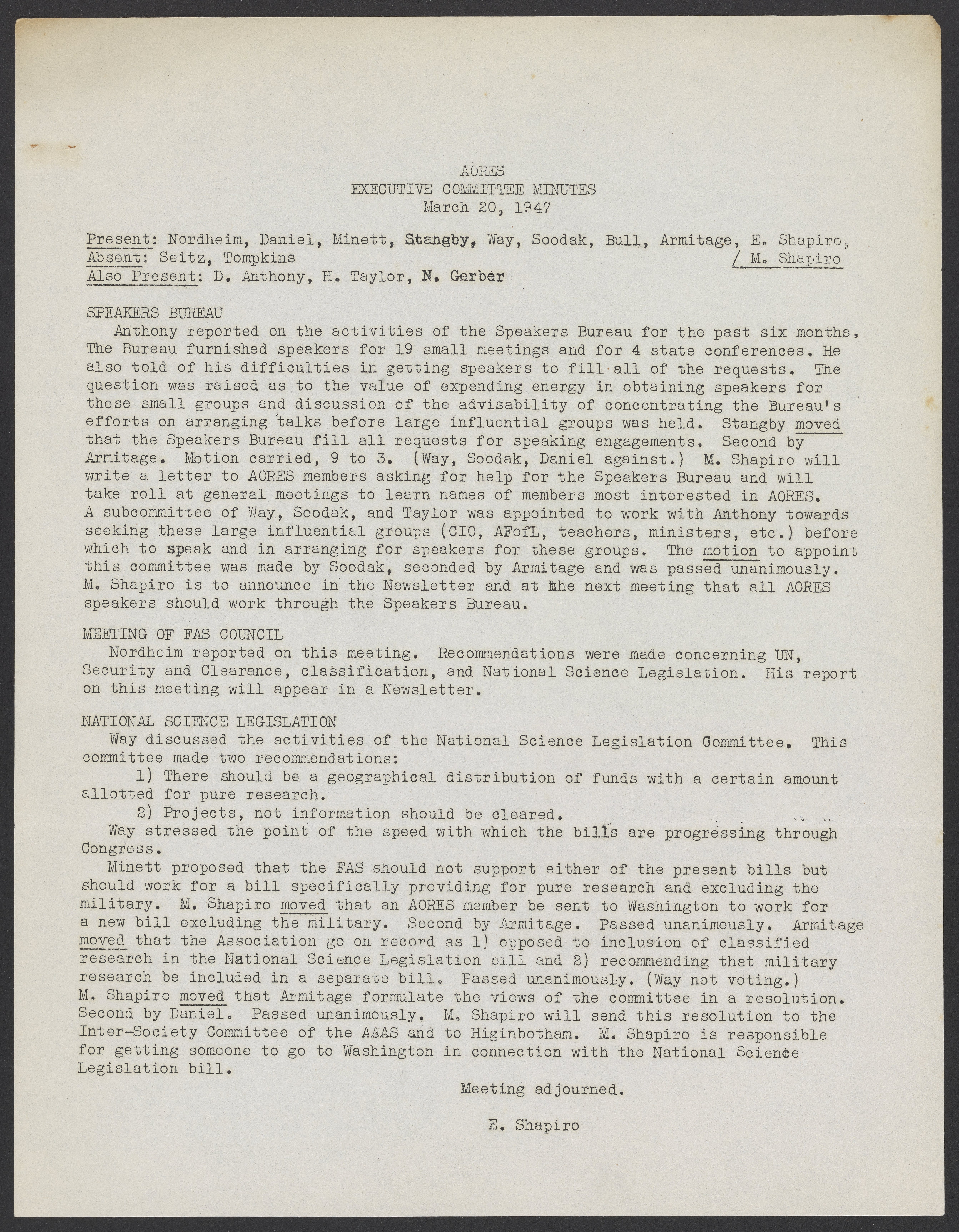 Association of Oak Ridge Engineers and Scientists (AORES) meeting minutes, March 20, 1947
