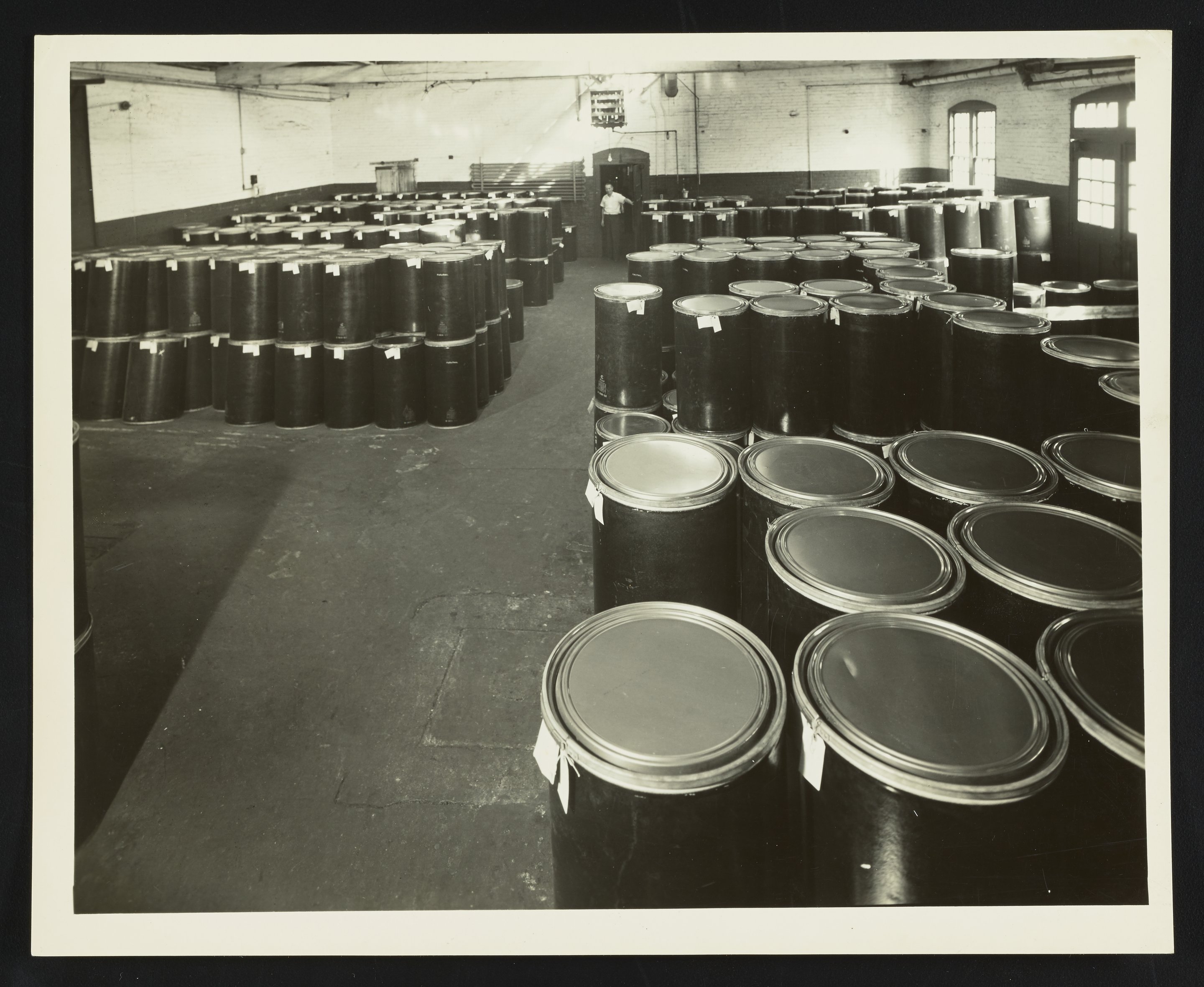 General view of the shipping and storage room at the Althouse Chemical Company manufacturing plant in Reading, Pennsylvania. Several rows of drums, presumably containing dyestuffs ready for shipment, are visible, while an unidentified employee stands near the doorway.